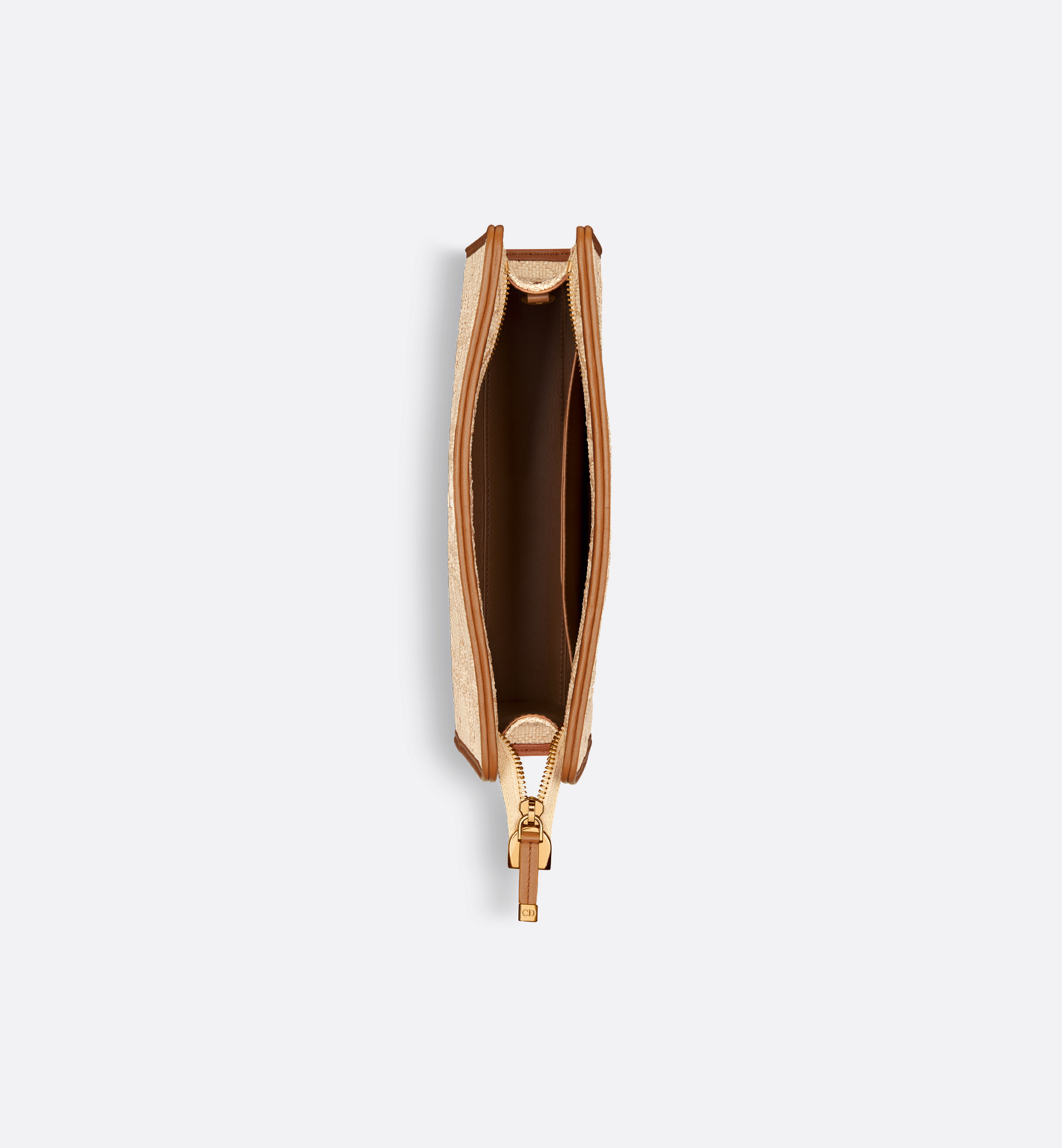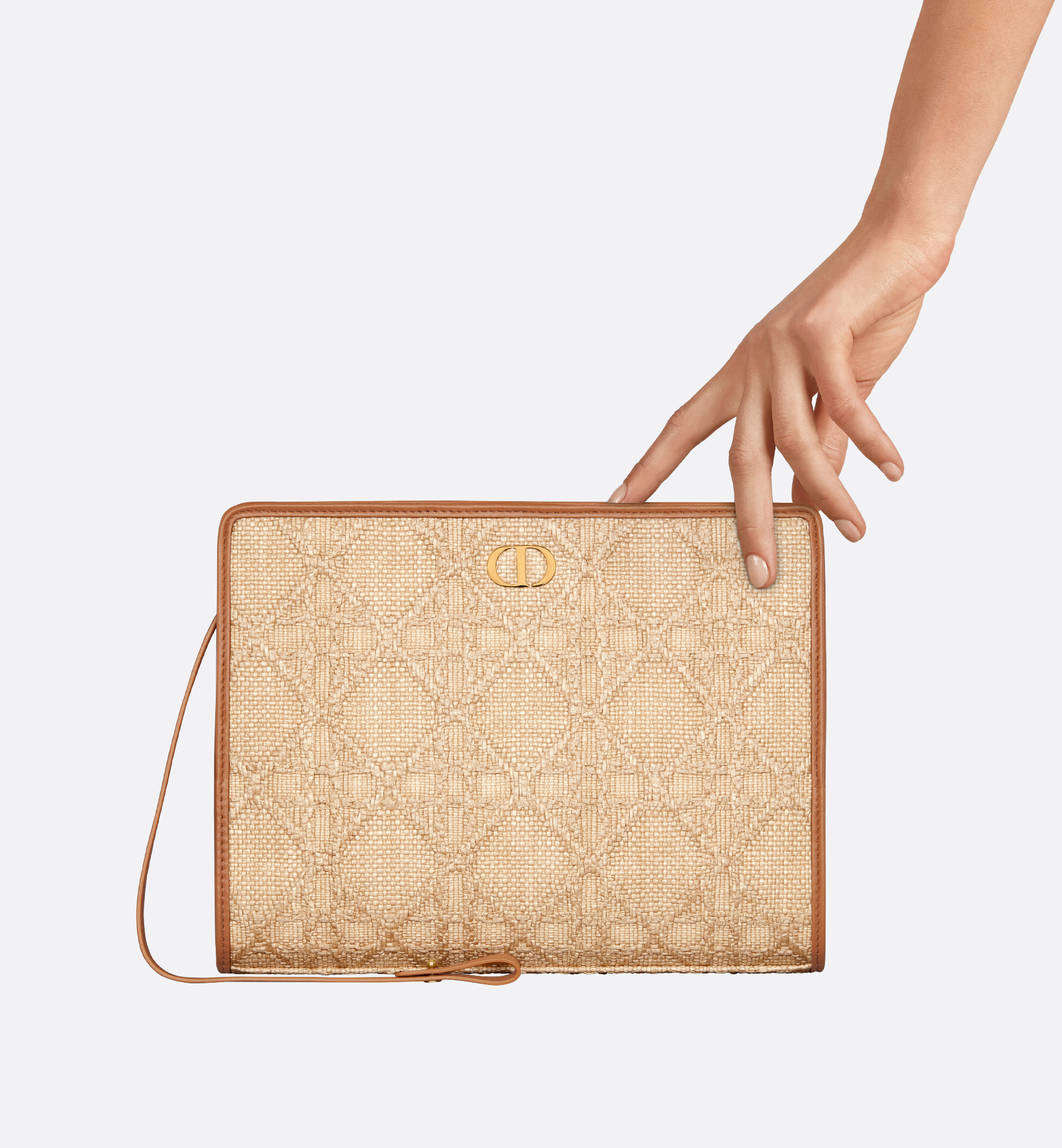 The 30 Montaigne Dea pouch is a timeless and sophisticated accessory. The exceptional design is hand-woven in natural raffia and embellished with the Cannage motif. Accented by a CD signature on the front, it features a spacious interior compartment to hold all the essentials. The structured silhouette allows the pouch to be carried as a clutch or slipped into a Dior Book Tote. Main composition: technical fabric and lambskin. Lambskin and technical fabric lining. CD signature on the front. Zip closure. One interior compartment. One interior slip pocket. Three card slots. One leather wrist strap. Made in Italy