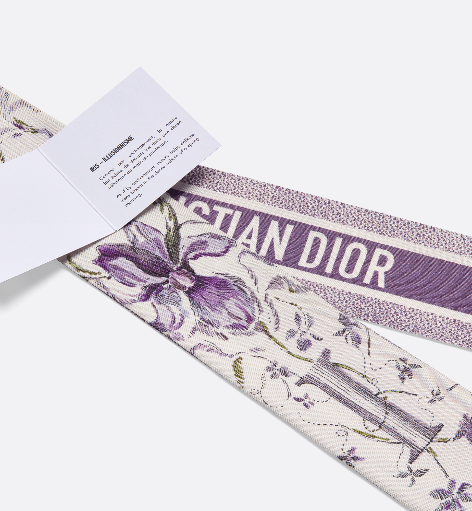 ABCDior Mitzah scarves are crafted in silk twill and showcase 26 flowers that represent Christian Dior’s love of nature. A passion that flourishes like never before upon the House’s delicate creations in a celebration of botanical beauty. As if by enchantment, nature helps delicate irises bloom in the dense nebula of a spring morning. Enhanced by a contrasting Christian Dior signature jacquard band on the back, the ivory multicolor Mitzah scarf will add the finishing touch to any look and may be tied around the neck, at the wrist or on a bag. ABCDior print. Letter I Iris – Illusionnisme. Contrasting jacquard band with Christian Dior signature on the back. Pointed ends. 100% silk twill. Made in Italy. Sold with leaflet