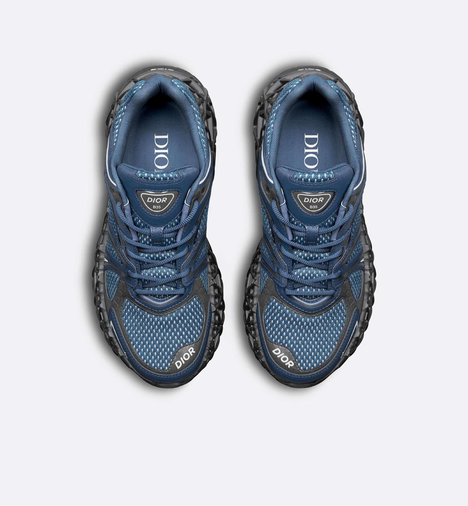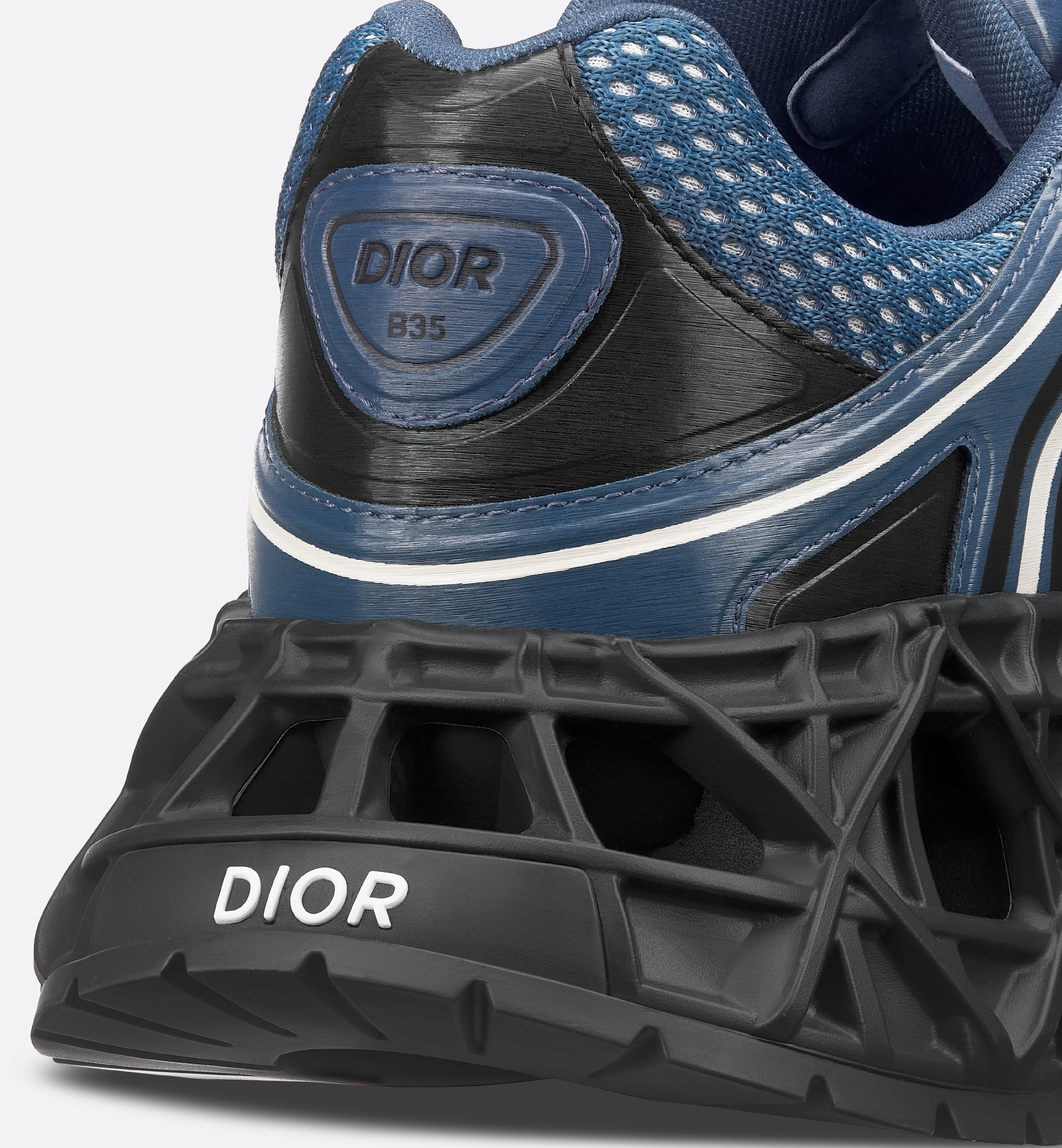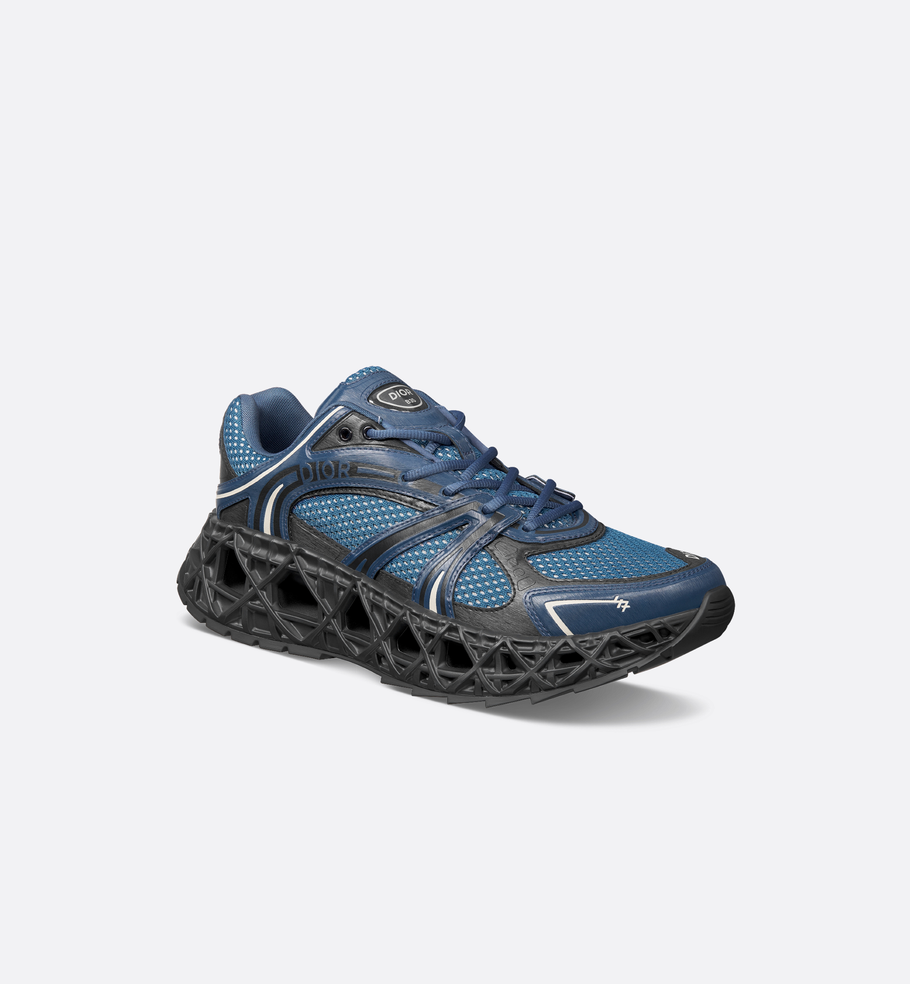 The B35 NXXT sneaker stands out with futuristic appeal. The openwork architectural sole with the Cannage motif demonstrates the House’s mastery of innovation. The sole is crafted to be voluminous yet lightweight, for remarkable stability and a silhouette with a dynamic feel. The blue and black technical fabric and blue two-layer technical mesh upper creates a subtle contrast reminiscent of a running shoe from the 1990s. The graphic lines and high-frequency Dior and 47 signatures highlight the contemporary look, while the Dior B35 patches on the tongue and heel counter add the finishing touches to the exceptional style. The sneaker ensures optimal comfort and stability. Main composition: technical mesh and fabric. Technical mesh lining. Dior and 47 signatures on the sides. Dior B35 signature on the tongue and heel counter. Low top. Lace-up closure. Openwork Cannage outsole with Dior signature. Welded construction. Dust bag included. Additional set of blue cotton laces provided. Made in Italy