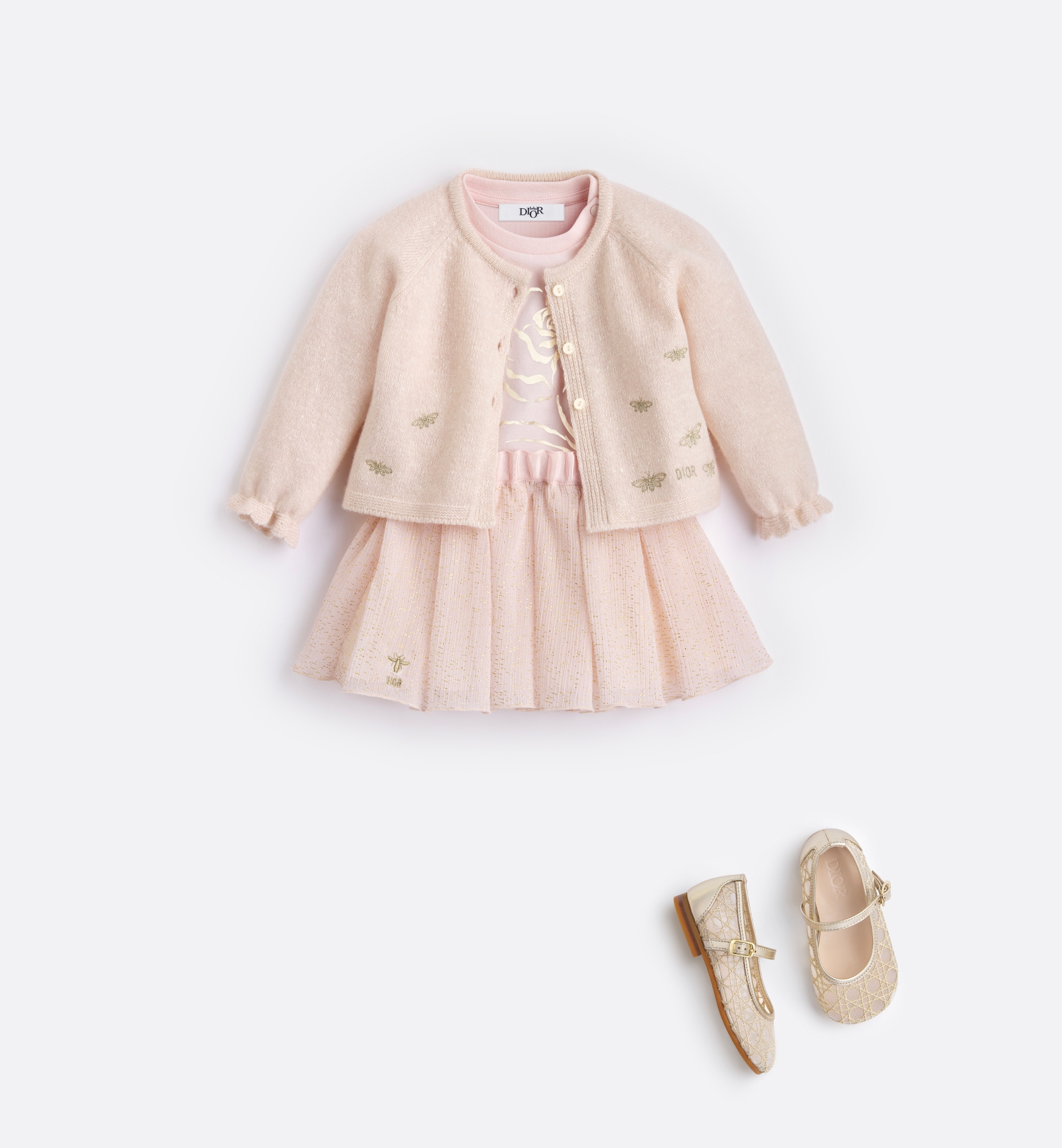 The cardigan has a comfortable and graceful silhouette. Knit in pale pink and ivory wool and silk mouliné, it is embellished with the Dior embroidery surrounded by gold-tone bees at the hem. Featuring a tonal button closure, it is completed by elastic cuffs with delicate trim. The soft cardigan will pair effortlessly with the matching dress from the collection for a cheerful look. Dior and bee embroideries in gold-tone metallic thread at the hem. Front placket with tonal Dior-engraved buttons. Round neck. Elastic cuffs with delicate trim. Main composition: 67% wool, 33% silk*. *This garment is crafted in a medium-weight knit.. Embroidery composition: 100% polyester. Unlined