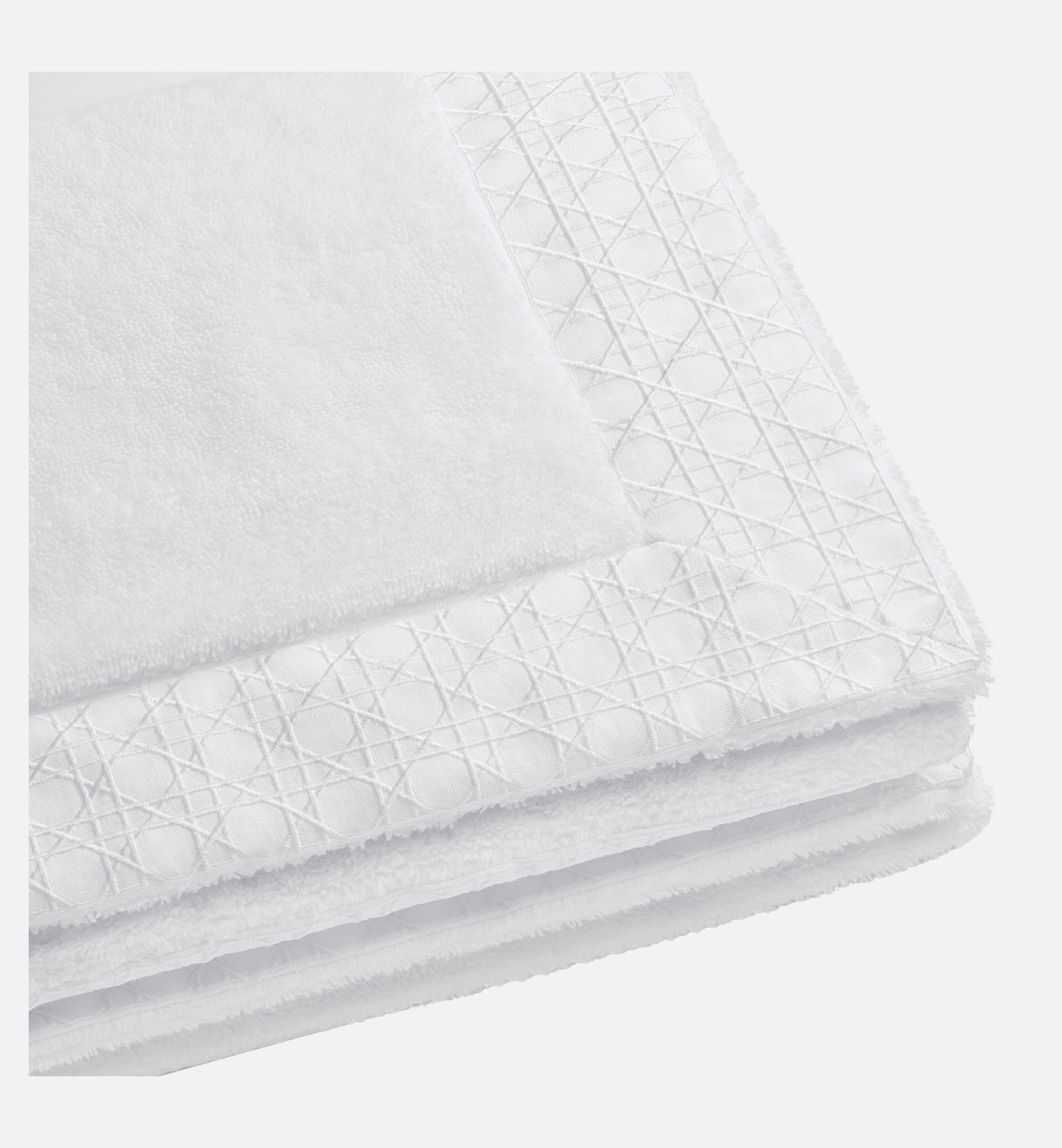Cannage, with its signature graphic lines, highlights a tonal embroidery that delicately adorns the white bath linen collection. Part of Dior’s art de vivre, here on a bath mat. 90% cotton, 10% linen. Made in France