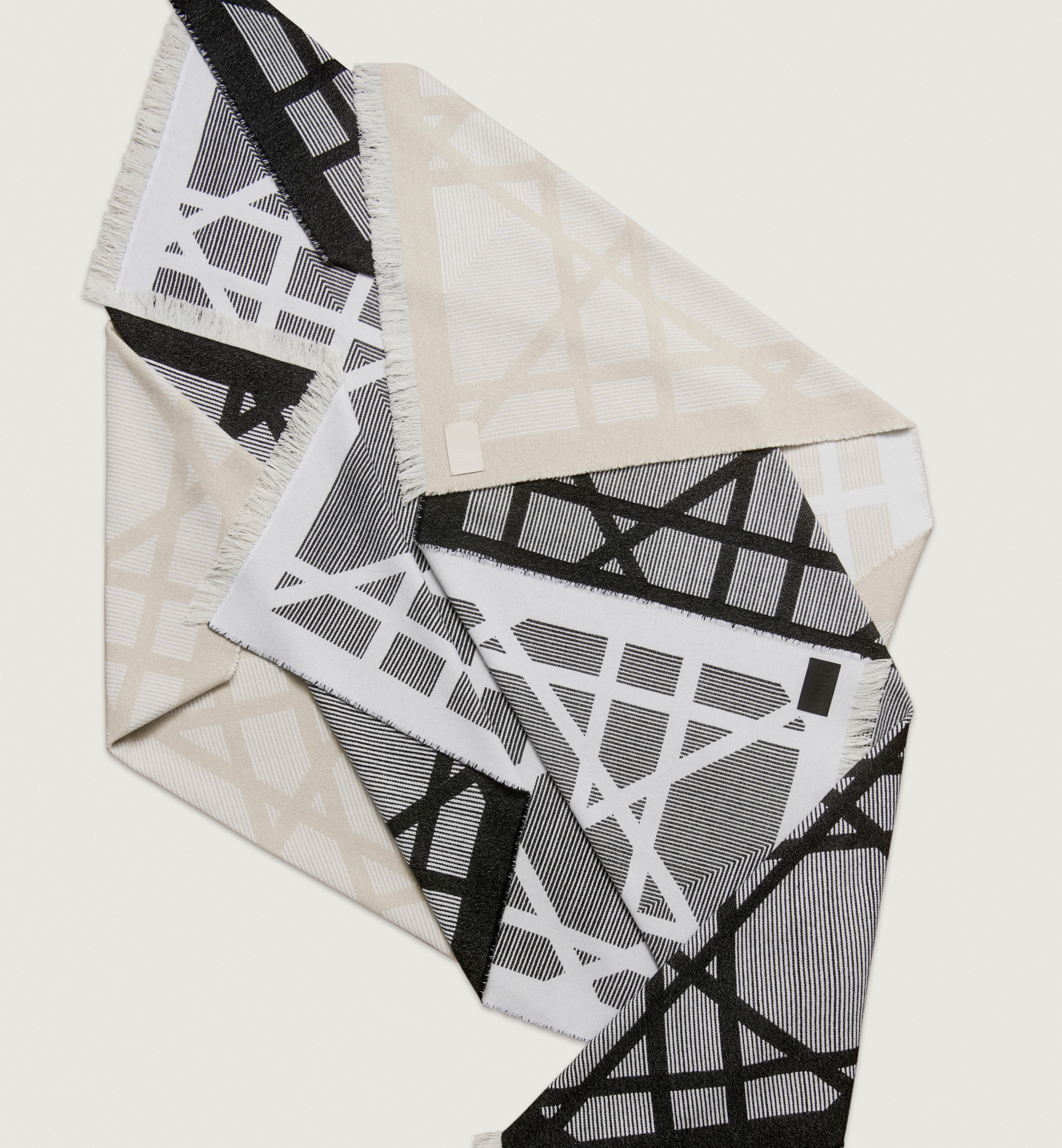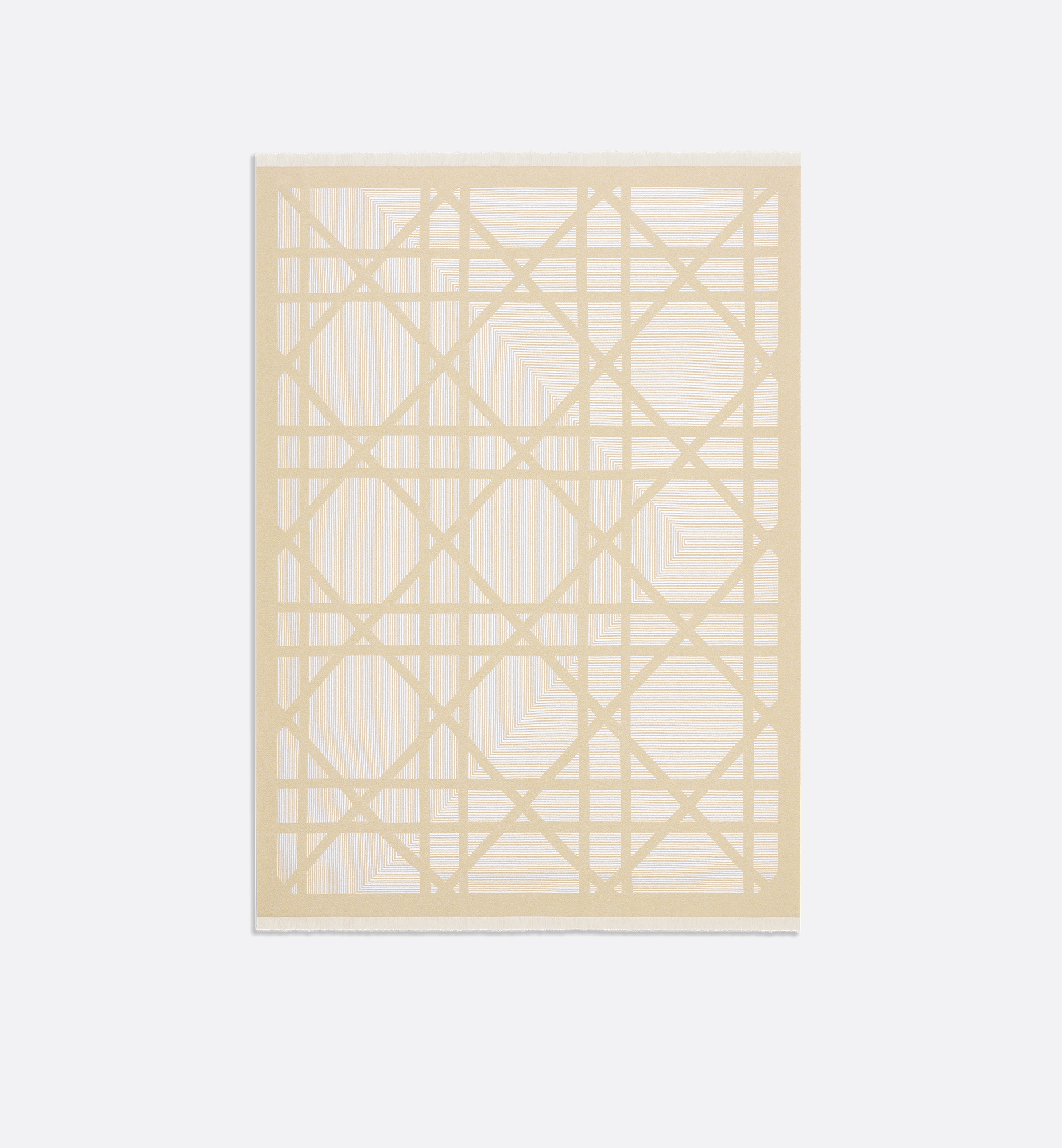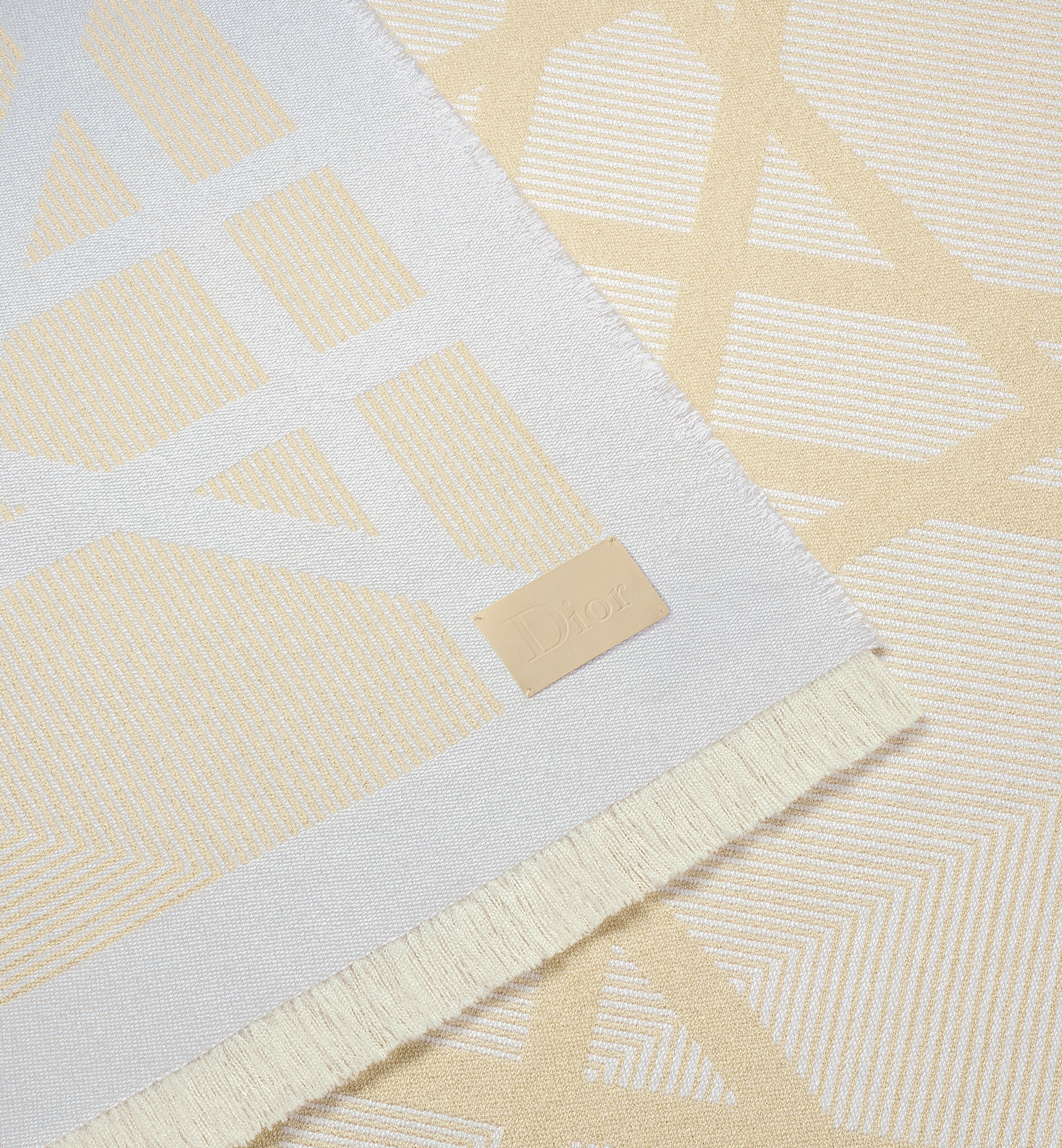 The blanket is unveiled as part of the Cross Cannage collection by Cordelia de Castellane, who reimagines the hallmark House code in exceptionally bold interpretations. Crafted in double-sided wool, cashmere and silk jacquard, the blanket’s graphic grid showcases the harmonious interplay between beige and white tones, elevated by gold-tone threads for a fascinating optical effect. The design will enhance any interior with the quintessentially Dior code and can be coordinated with other pieces from the Cross Cannage line for a timeless ode to creativity. 60% wool, 20% cashmere, 16% silk, 2% polyamide, 2% polyester. Made in Italy. Machine wash on gentle cycle at 30 °C / 86 F. Gently dry clean, without minerals. Do not bleach. Do not tumble dry. Iron at a low temperature: 110 °C /230 °F