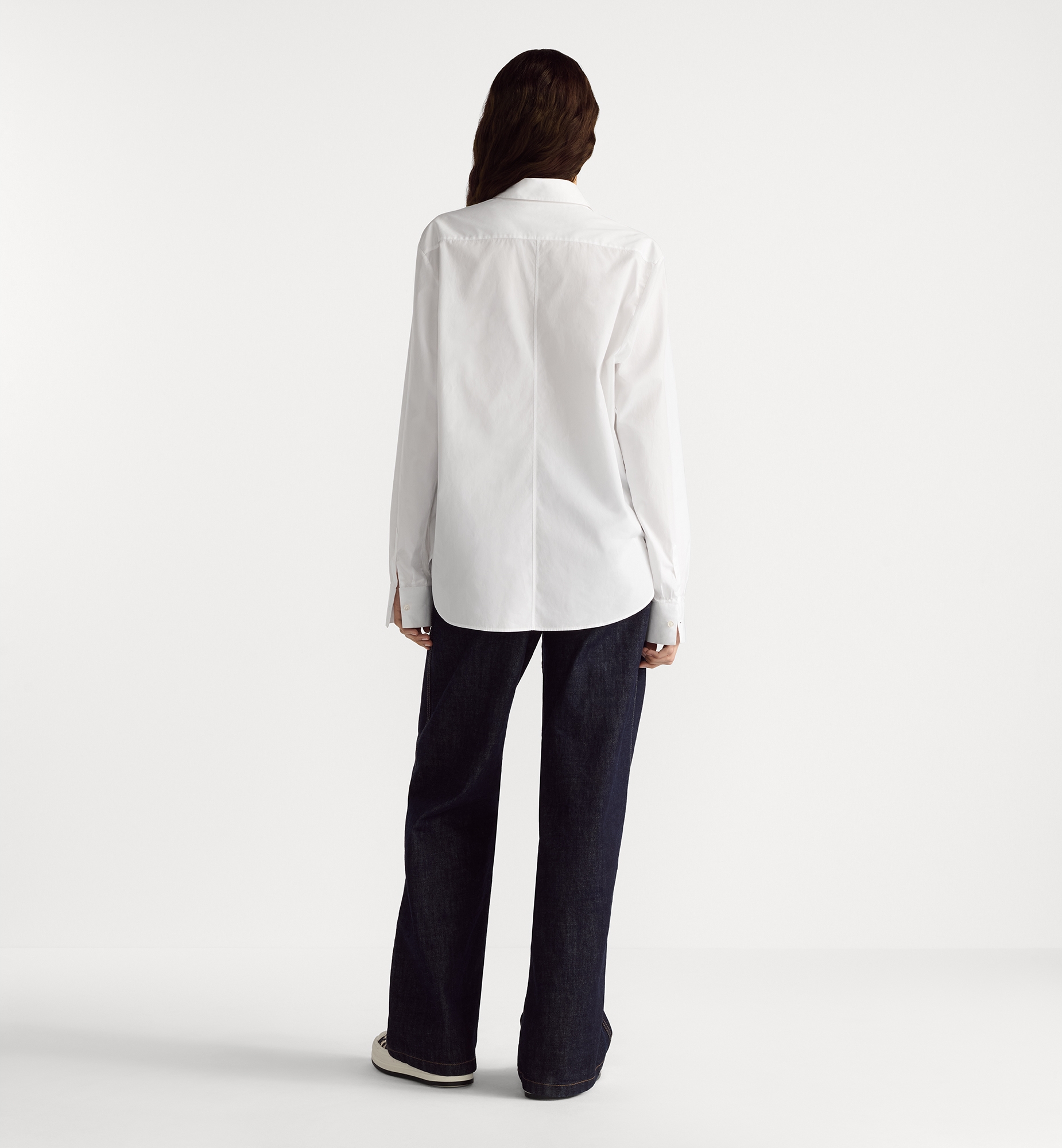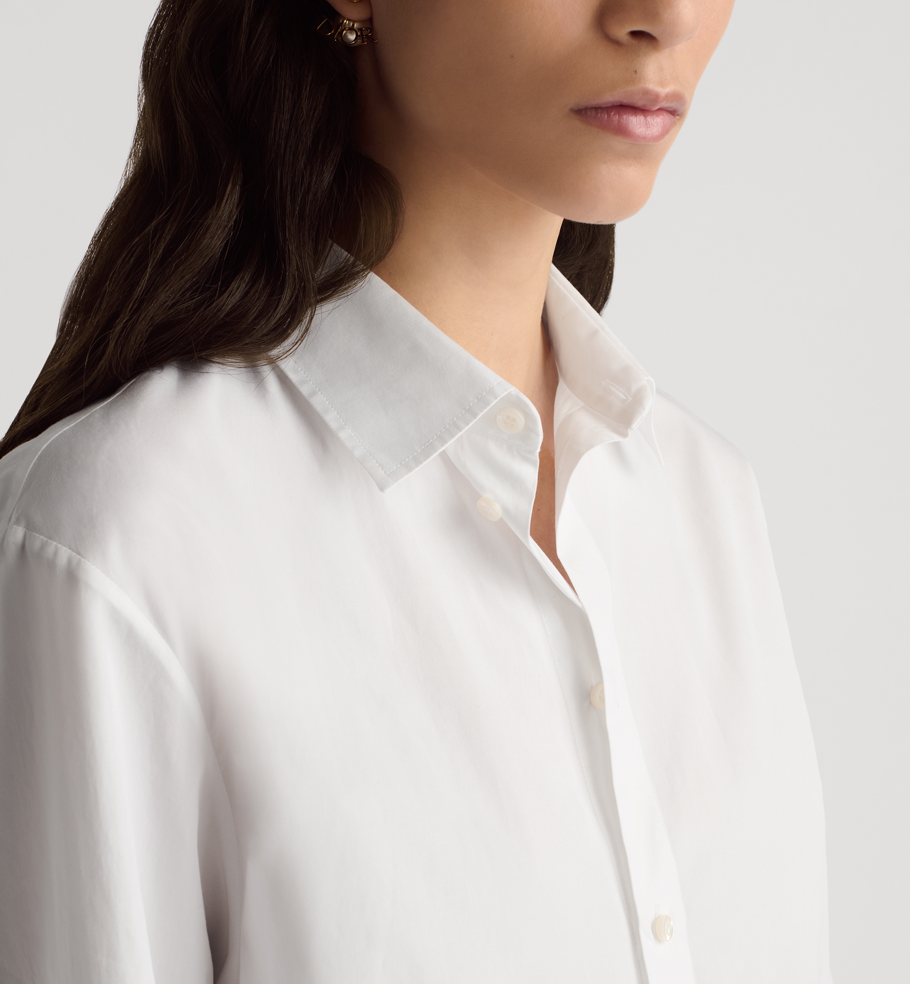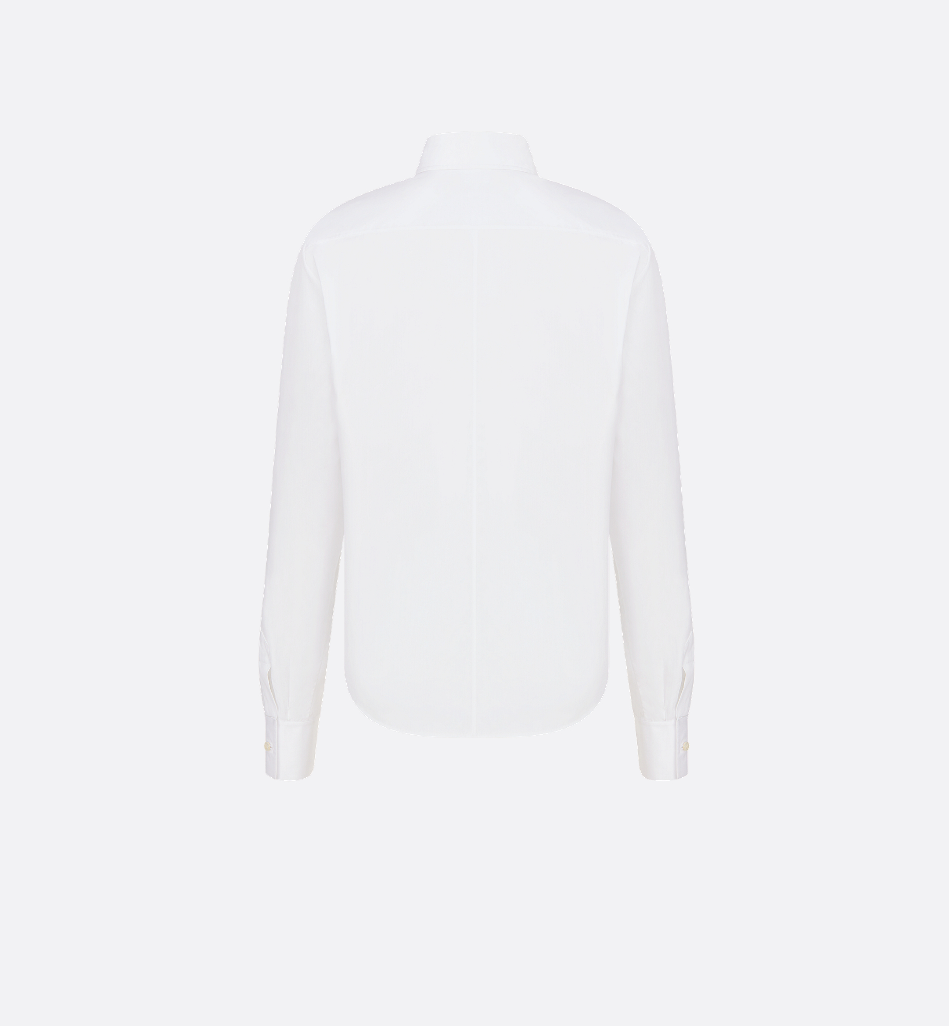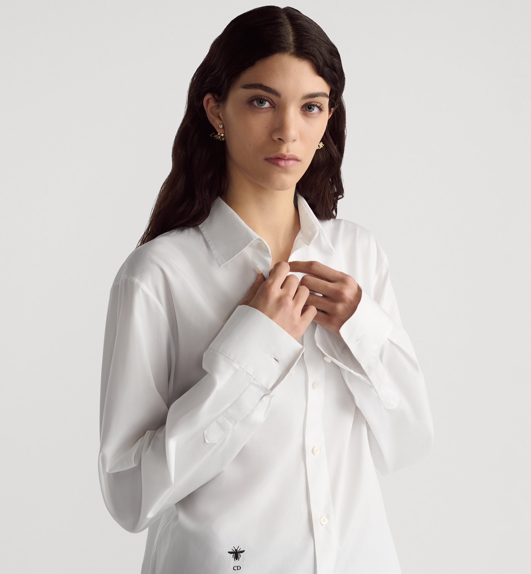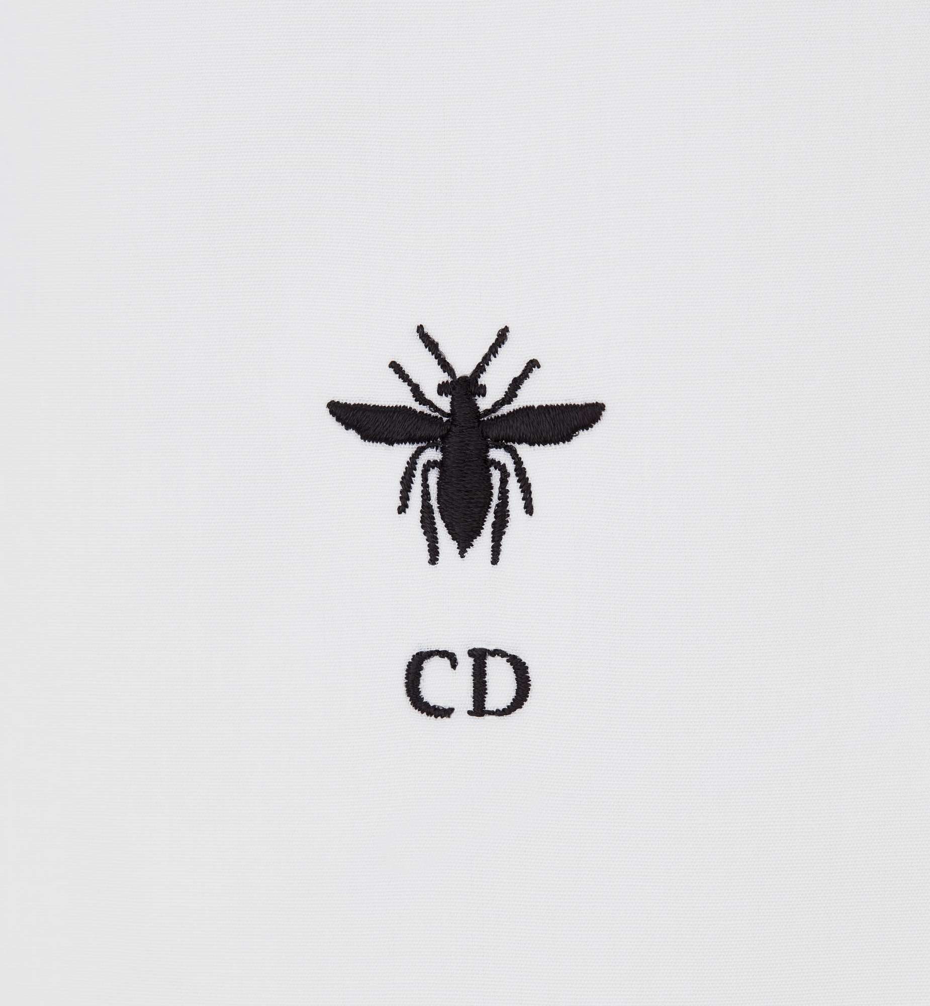 A staple Dior silhouette, the blouse is reimagined in an elegant and timeless variation. Crafted in white cotton poplin, the design is embellished with a delicately embroidered bee. The refined blouse may be paired with any outfit, casual or formal, across the seasons. Embroidered hallmark bee and CD signature. Front button closure. Christian Dior Paris signature mother-of-pearl buttons. French cuffs. Unlined. 100% cotton. Made in Italy