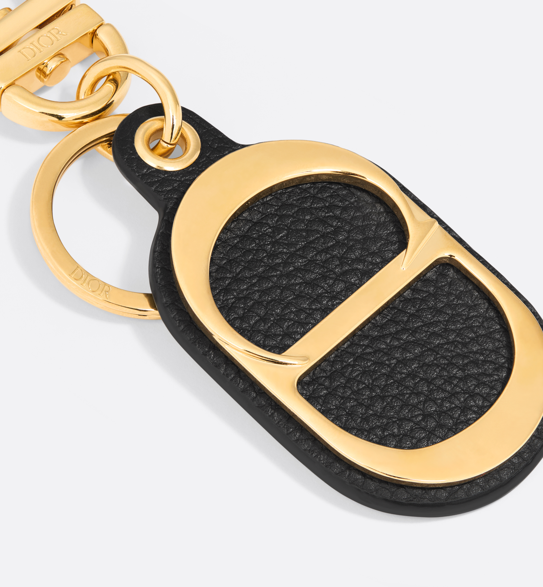 The key ring honors the iconic CD Icon signature. It is crafted in black grained calfskin with gold-finish brass. The Dior-engraved ring and lobster clasp allow it to be easily attached to a belt loop or a bag. Main composition: brass and calfskin. Dior-engraved ring and lobster clasp. Gold-finish brass CD Icon signature. Dust bag included. Made in Italy or Spain