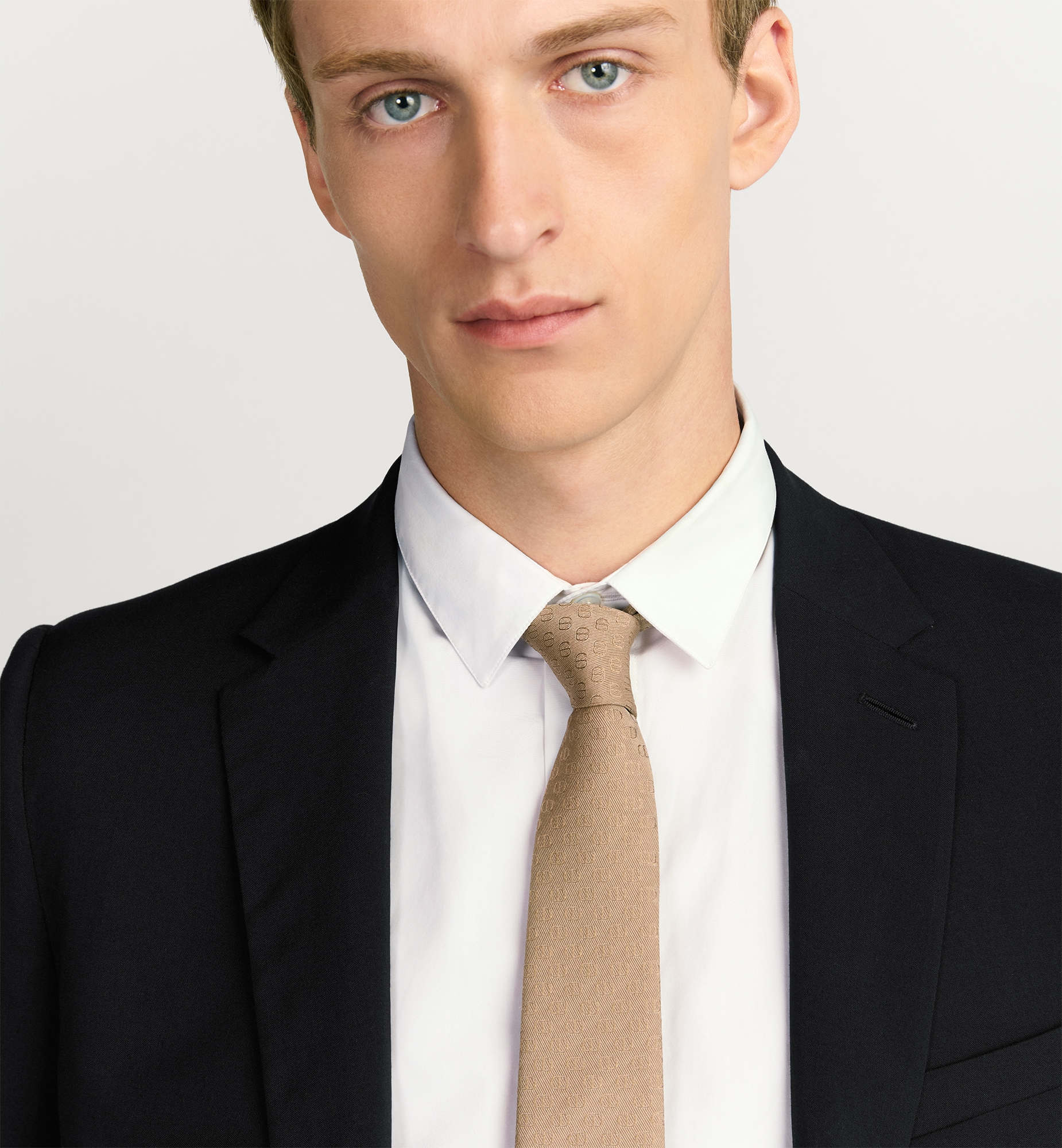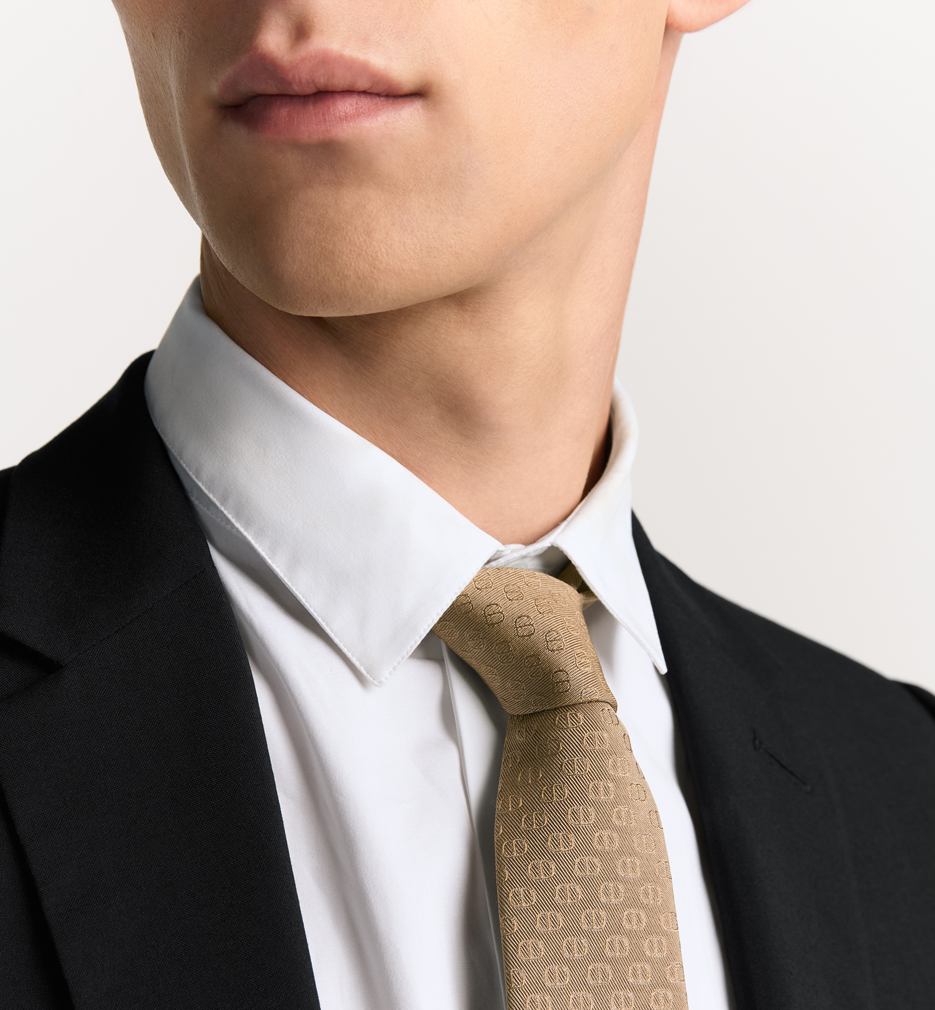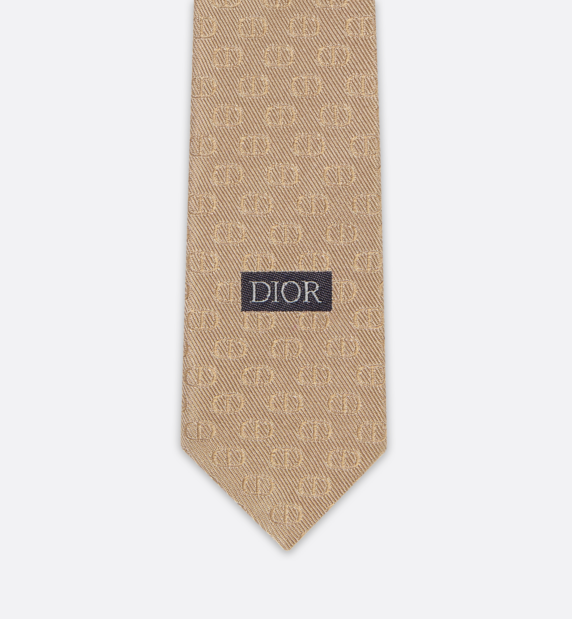 The camel tie showcases the CD Icon motif in a tonal version. Crafted in silk, the refined style will elevate suits with a graphic touch. Tonal allover CD Icon jacquard. Dior jacquard signature on the exterior of the tail. 100% silk. Made in Italy