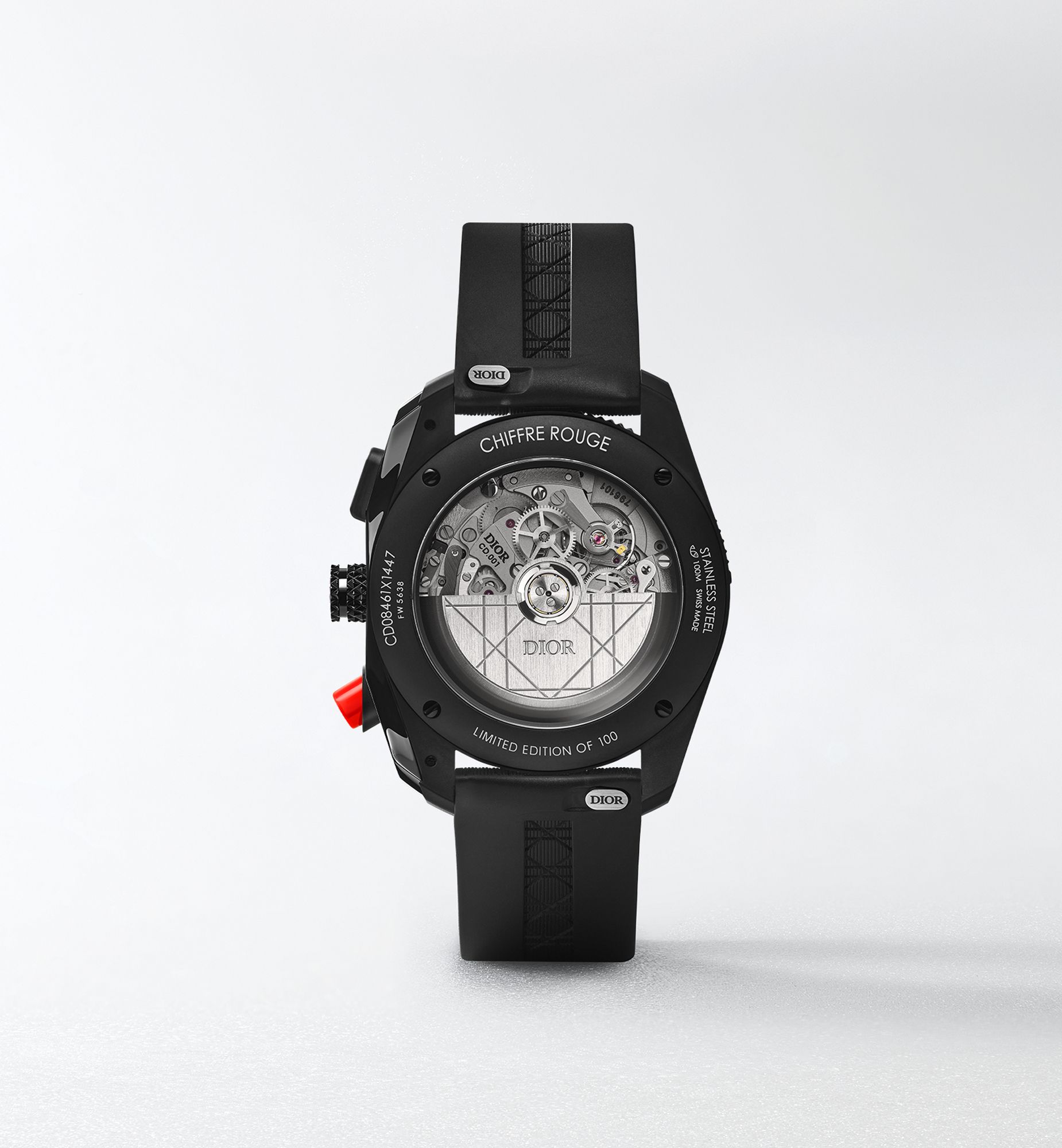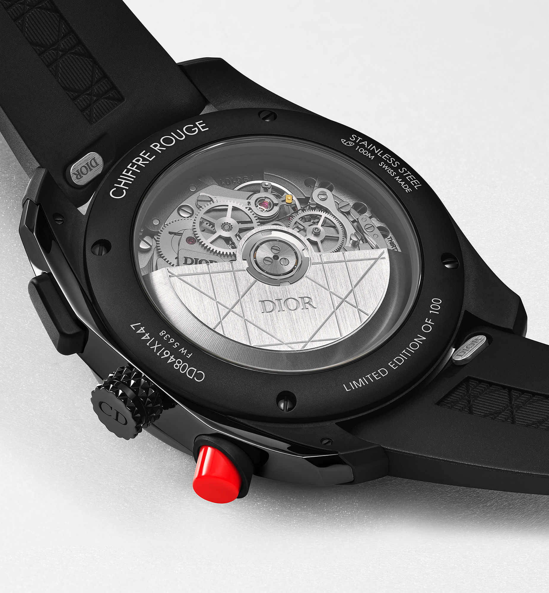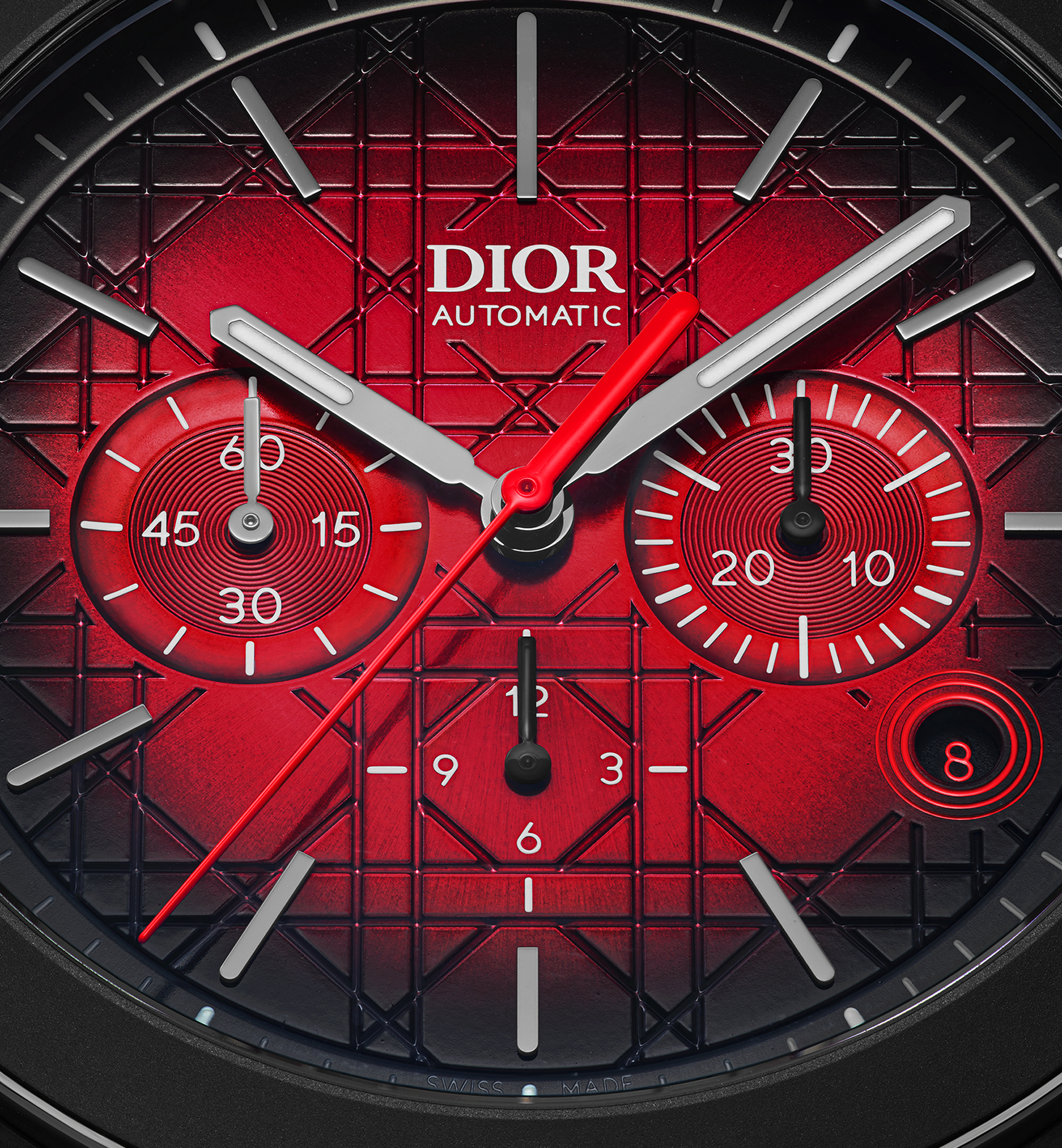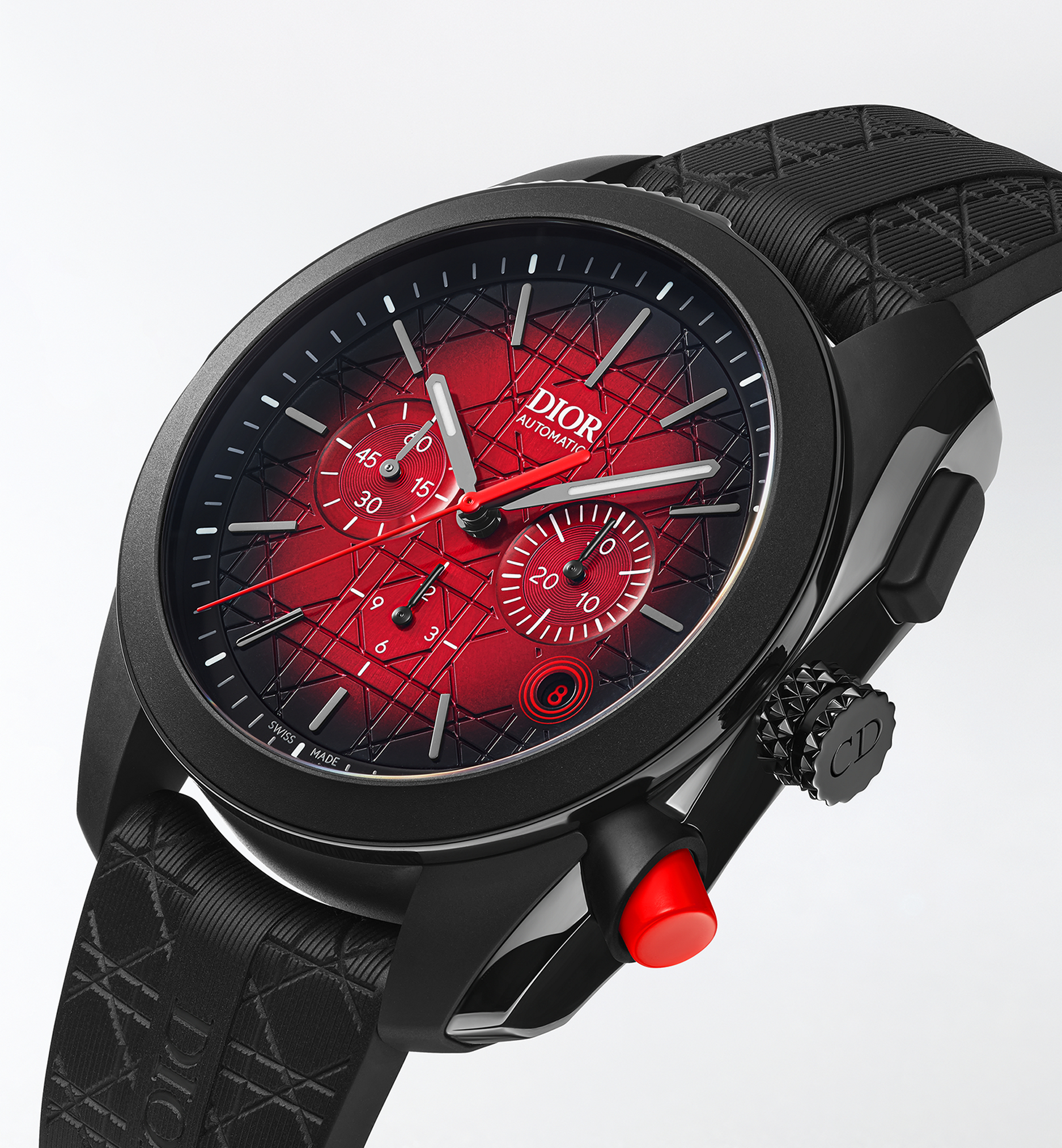 Case: 41 mm (1.5) black DLC-coated steel. Black DLC-coated steel bezel, notched between 9 o’clock and 12 o’clock. Black chronograph push button at 2 o’clock, start/stop function. Red chronograph push button at 4 o’clock for resetting to zero. CD-engraved black screw-down crown. Water resistant: 100 meters (328 feet). Gradient red brass dial with embossed Cannage motif. Luminescent hour and minute hands and brass indices. Red chronograph second hand. Anti-glare sapphire crystal. Black rubber strap with Microcannage motif, standard size. Ultramatte black steel folding clasp with easy-fastening system. The design is compatible with Chiffre Rouge interchangeable straps for Ø 41 mm. If the standard size Chiffre Rouge strap is not the right fit, we recommend visiting a boutique for a more suitable size. CD.001 automatic movement (Zenith El Primero, designed and embellished for Dior). Approximately 48-hour power reserve. Functions: Hours – Minutes – Seconds – Date. Chronograph: second, 30-minute and hour counters. Oscillations: 36,000/hour. Frequency: 5 hertz. Five-year warranty. Made in Switzerland