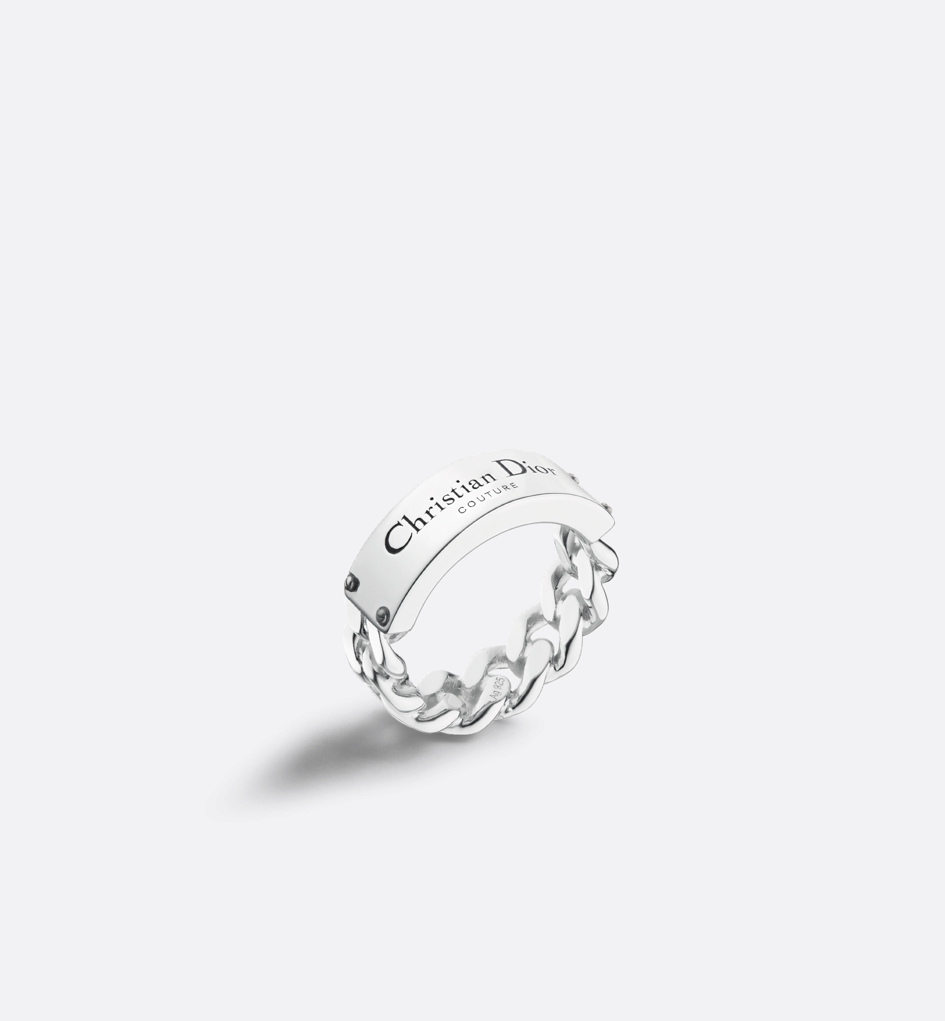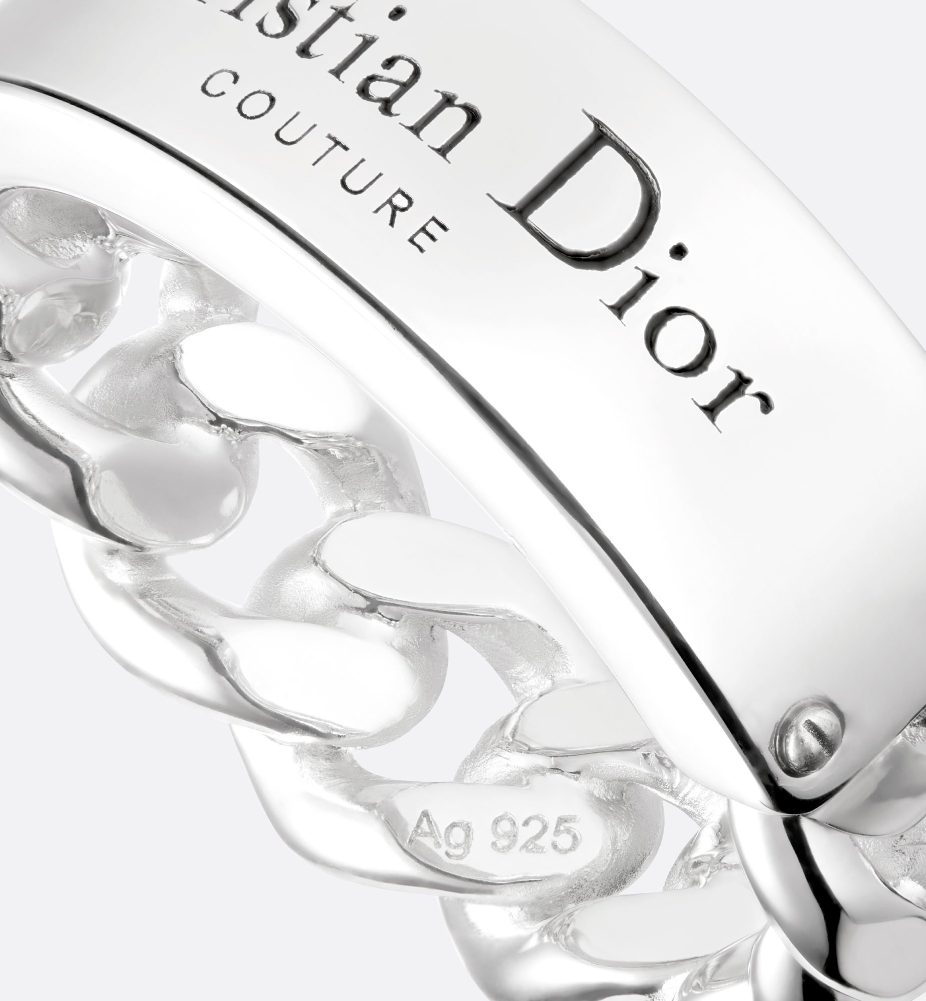 The ring revisits the timeless chain design in a modern, bold creation. The thick silver chain links showcase a Christian Dior Couture signature plate for a hallmark touch. The ring can be coordinated with the matching necklace and bracelet to complete the look. Christian Dior Couture signature plate. 100% sterling silver. Made in Germany