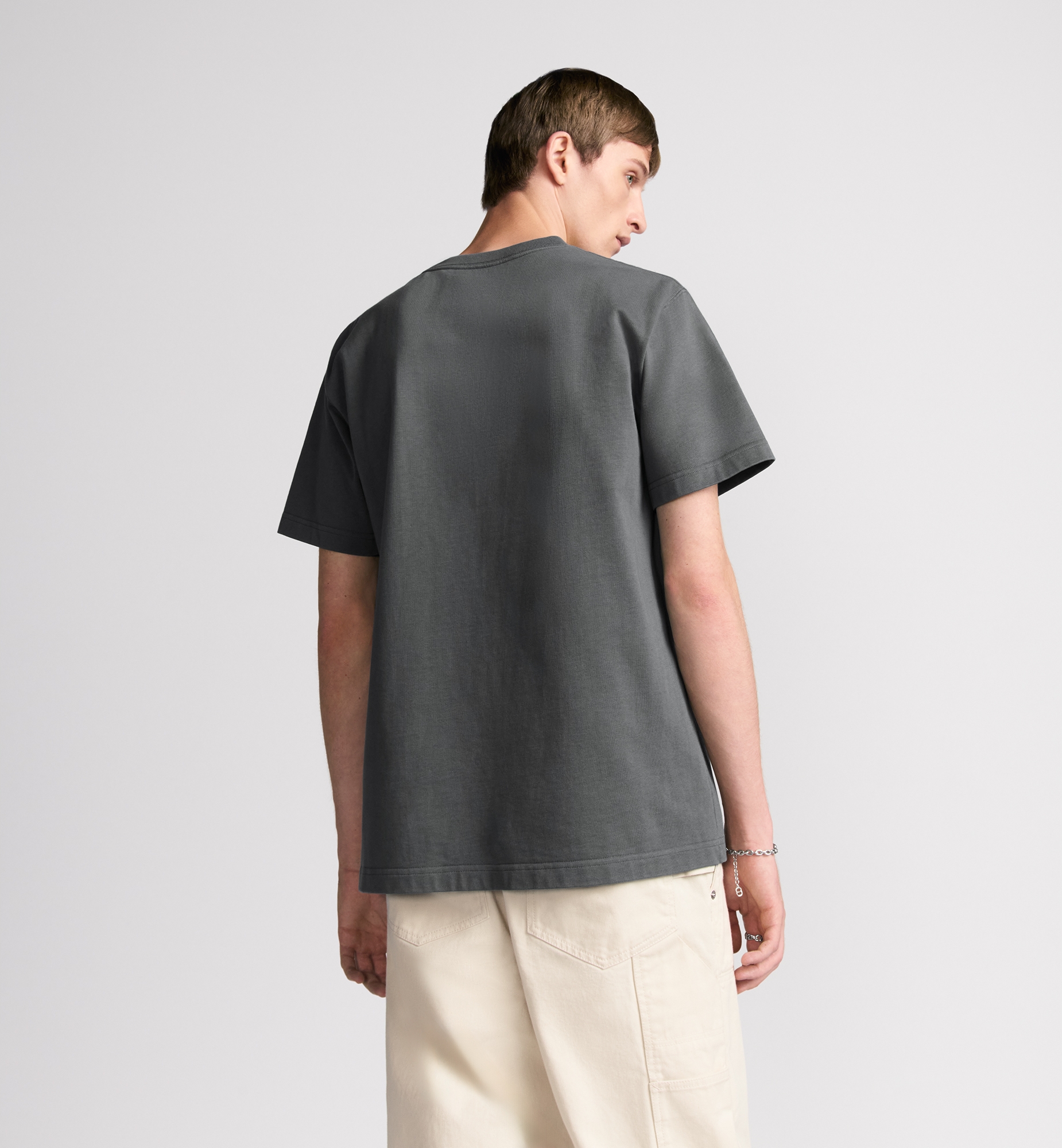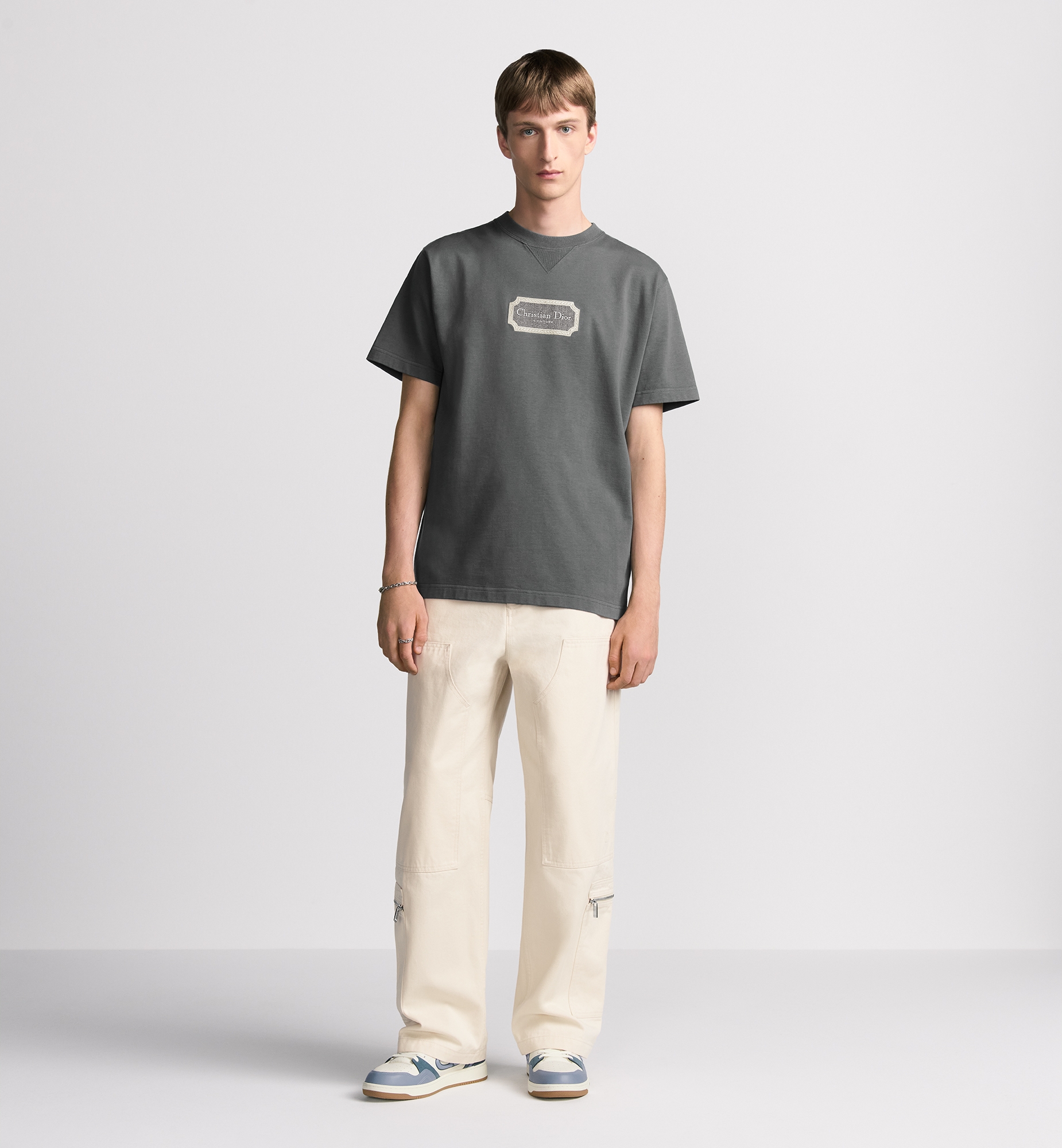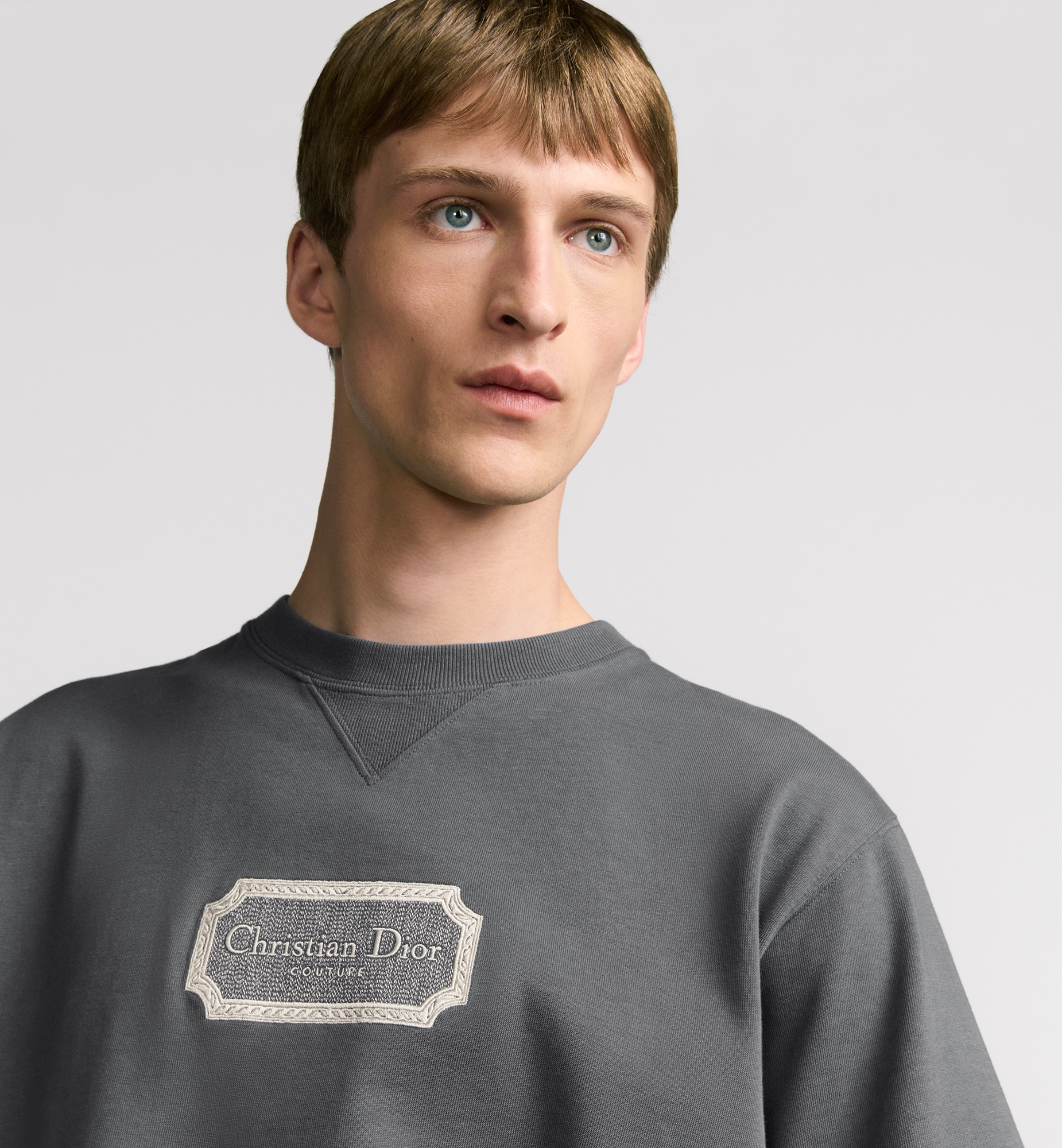The T-shirt is a laid-back and modern piece. Crafted in gray cotton jersey, it features a Christian Dior Couture signature in a contrasting embroidered frame on the chest. Thanks to its relaxed fit and ribbed crew neck with V-neck topstitching, the T-shirt will pair effortlessly with any jeans for a contemporary look. Contrasting Christian Dior Couture embroidery on the front. Ribbed crew neck with V-neck topstitching. 100% cotton. Made in Italy