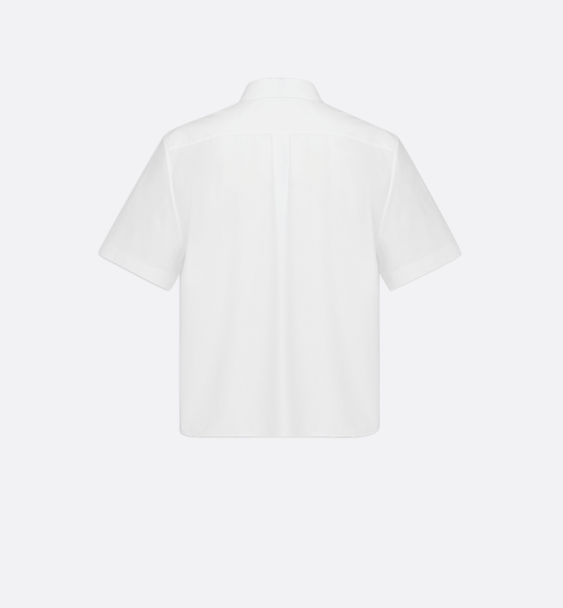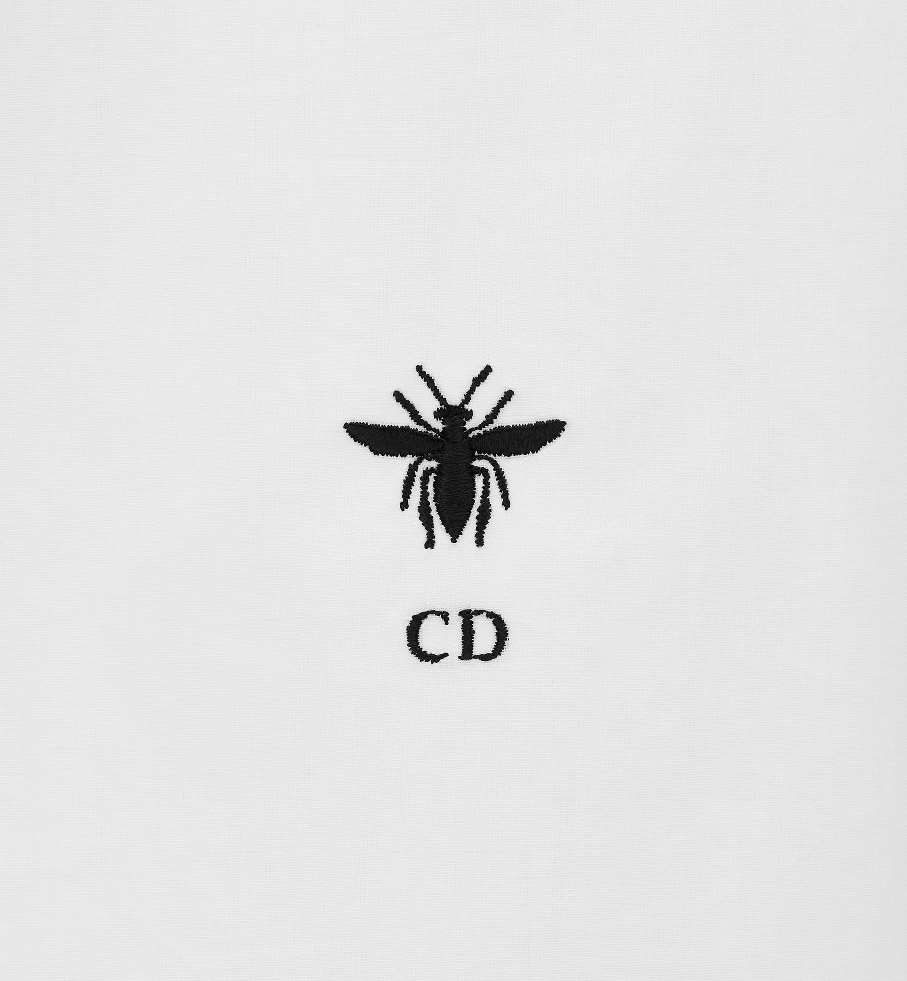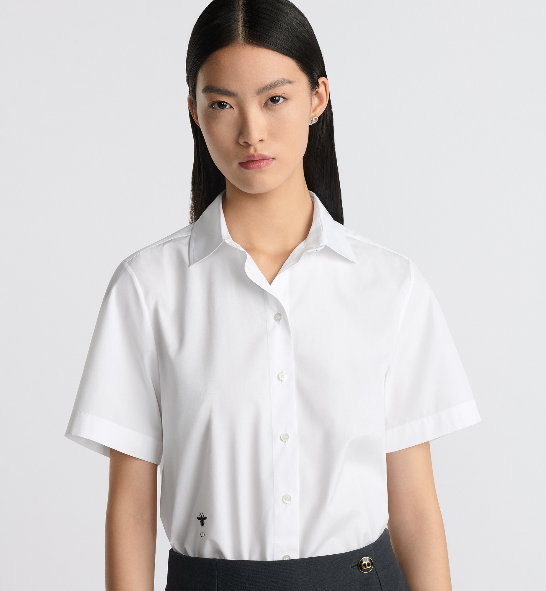 The white blouse is a timeless and essential wardrobe piece. Crafted in cotton poplin, the cropped style has a shirttail hem for a modern look. An embroidered bee, a beloved House emblem, discreetly signs the piece. The short-sleeved blouse can be worn with a mid-length skirt for a true Dior silhouette. Embroidered hallmark bee and CD signature. Front button closure. Christian Dior Paris mother-of-pearl buttons. Shirttail hem. Unlined. 100% cotton. Made in Italy