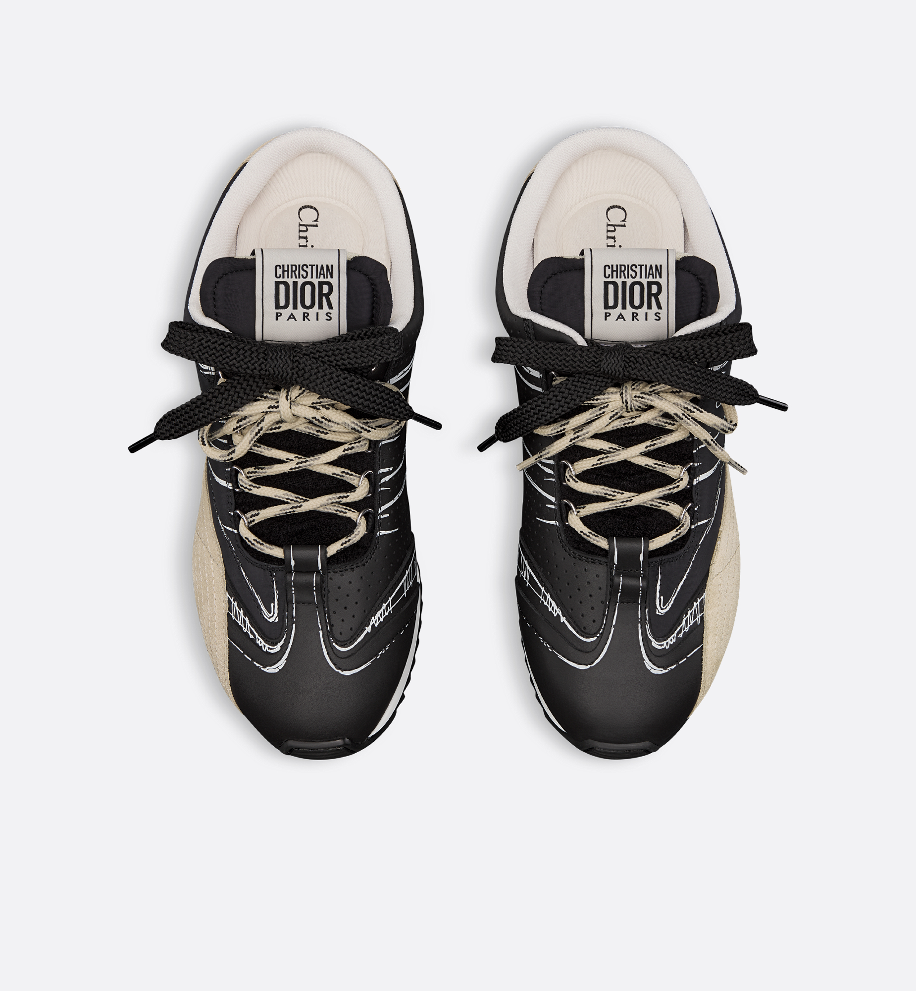 The D-Sketch sneaker offers a hallmark retro aesthetic in the form of a mule. Constructed in black nylon and calfskin, it stands out with printed markings inspired by the production stages of shoemaking, panels in beige suede calfskin and double lacing. The handwritten Christian Dior Paris signature appears on the sides, while a Christian Dior Paris tag adorns the tongue. Complete with a thin sole in two-tone rubber, the sneaker will lend a couture touch to any casual look. Main composition: calfskin, technical fabric and cotton. Technical fabric and calfskin lining. Christian Dior Paris signature on the sides and tongue. TPU insole. Two-tone thin rubber sole with star, Christian Dior’s lucky symbol. Made in Italy