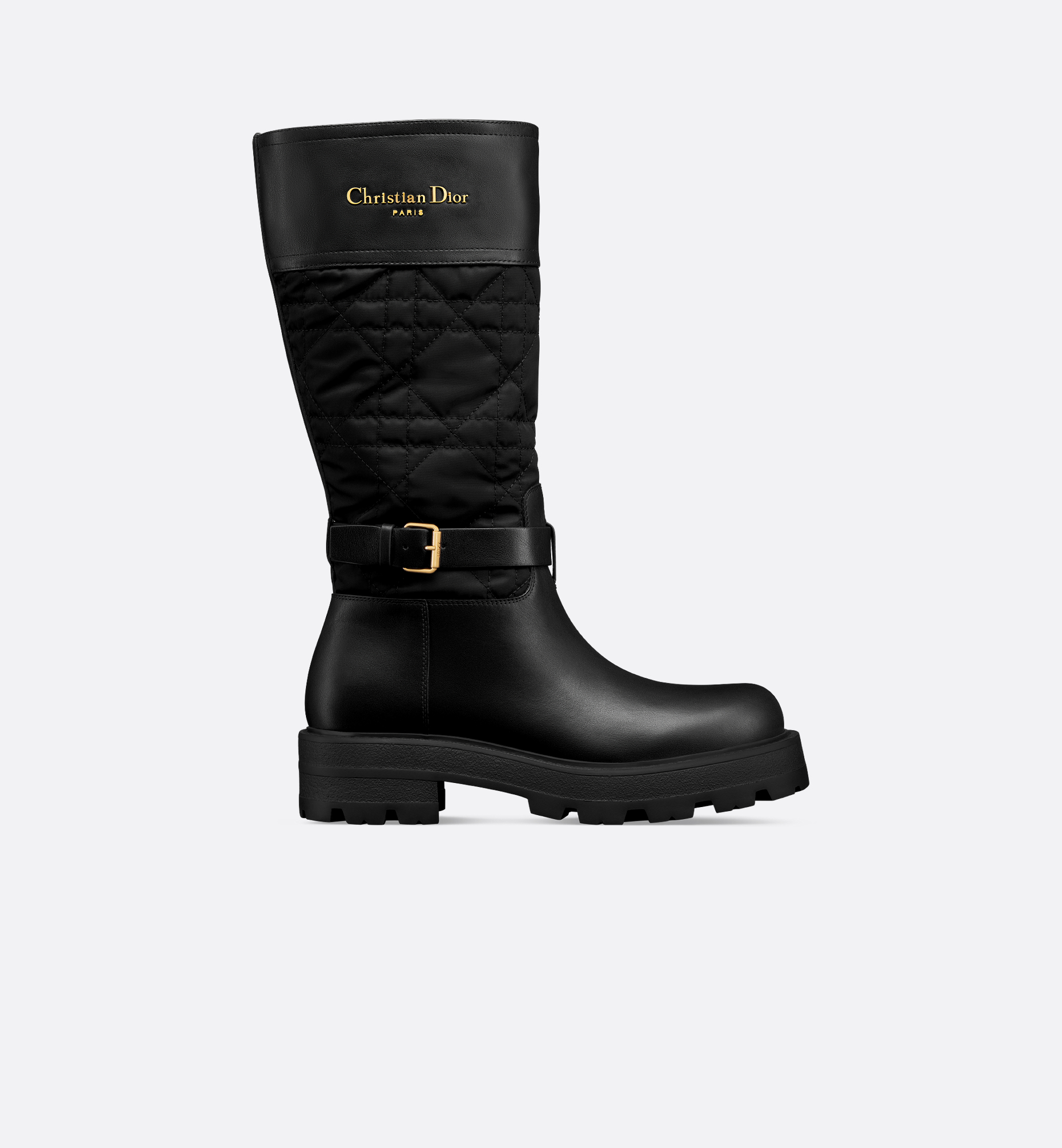 The D-Town boot showcases bold, modern appeal. The upper pairs black calfskin and nylon with Cannage stitching, and is accented by a gold-finish metal Christian Dior Paris signature on the side and an adjustable buckled strap highlighting the ankle. The thick yet ultralightweight notched sole will lend a contemporary touch to any look. Main composition: calfskin and technical fabric. Calfskin and technical fabric lining. Gold-finish metal Christian Dior Paris signature on the side. Adjustable buckled ankle strap. Side zip closure. Notched EVA sole with star, Christian Dior’s lucky symbol. Made in Italy