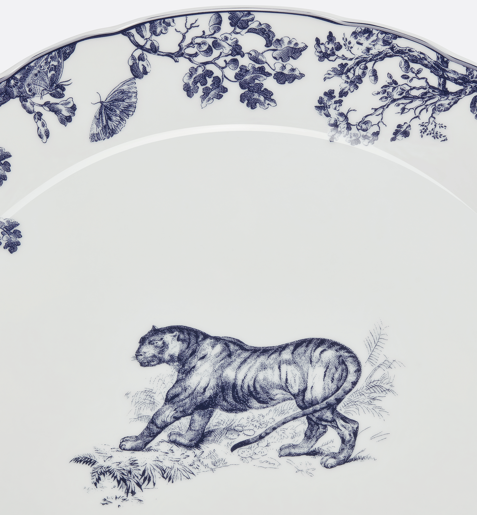 A symbol of French savoir-faire and the Dior spirit, Toile de Jouy is constantly reimagined by Maria Grazia Chiuri and adorns new creations in Limoges porcelain. Shaped pieces, including a coffee pot and a trinket tray, showcase the mythological scene in shades of blue and gray. A celebration of the art of hosting dear to Mr. Dior. 100% Limoges porcelain. Made in France