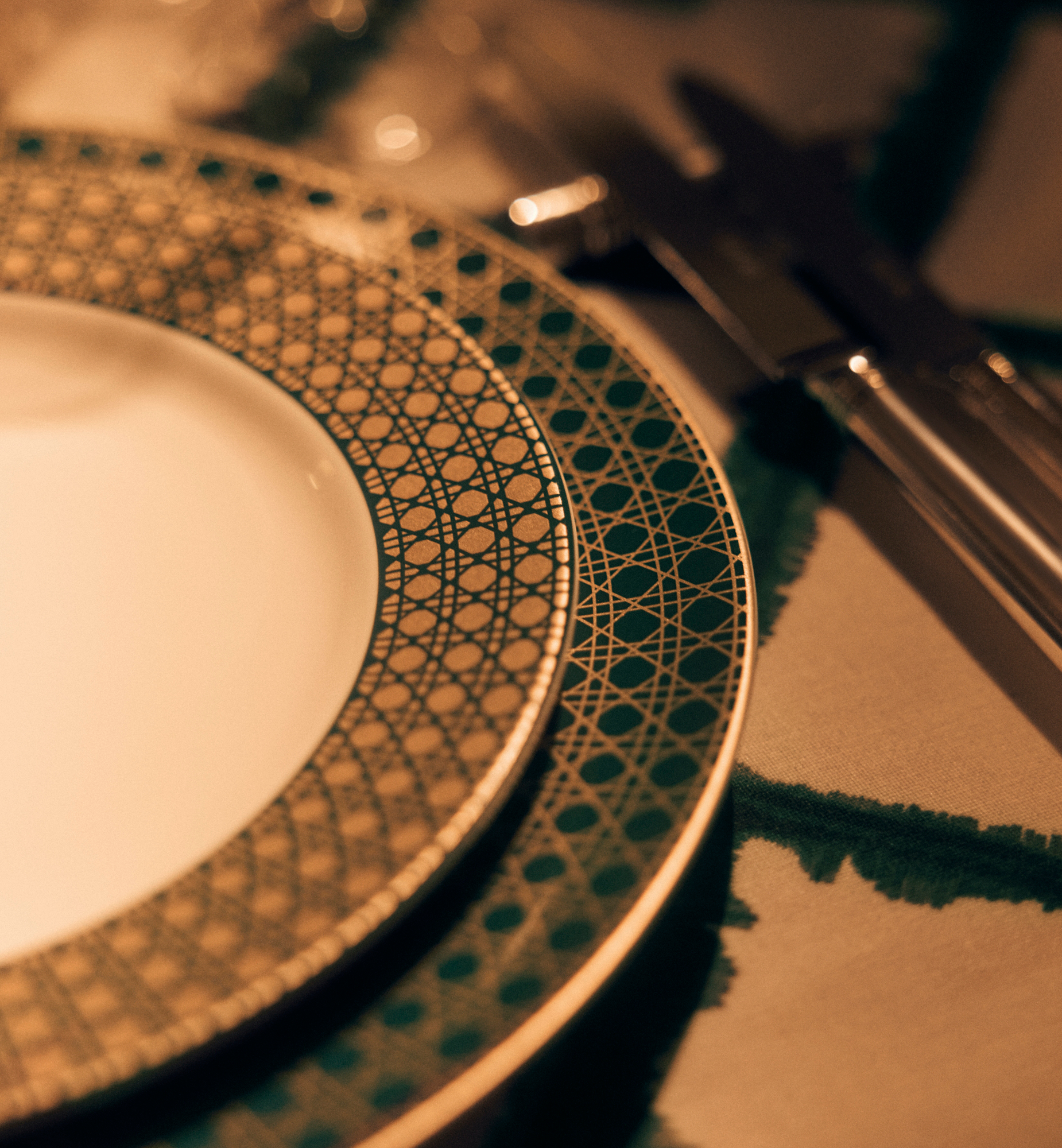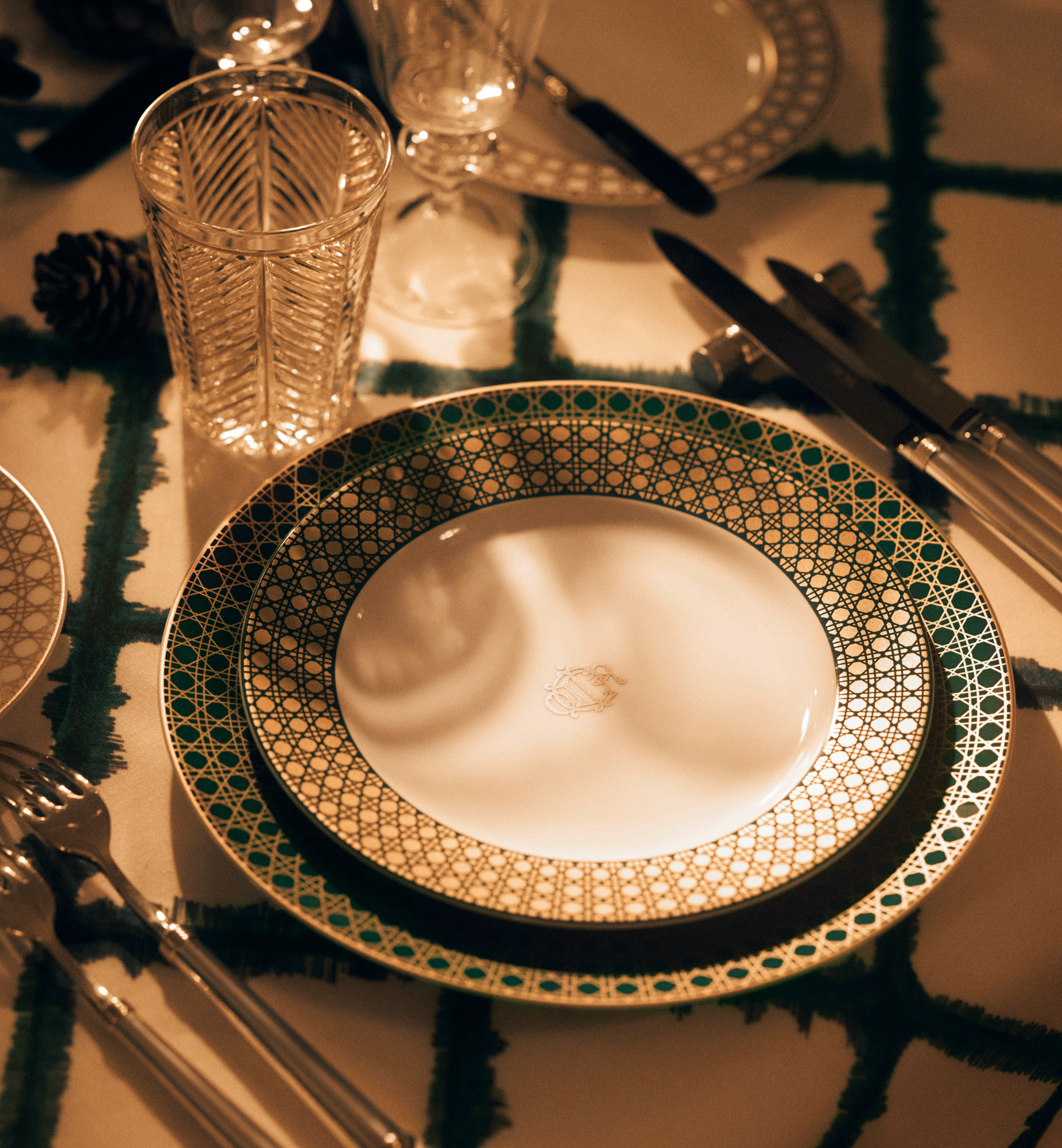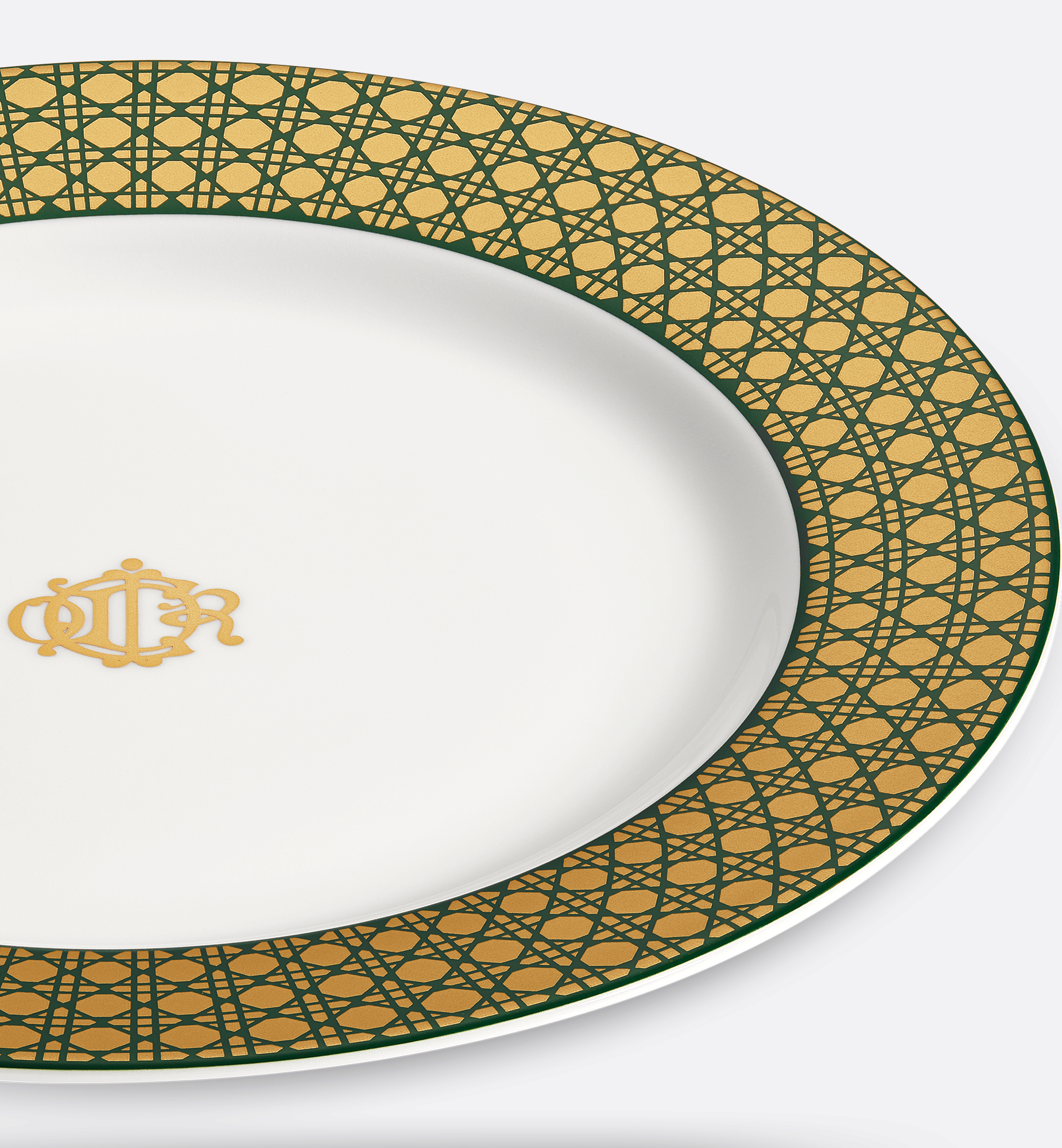 The dessert plate is unveiled as part of the Le Noël de Monsieur Dior collection and is adorned for the occasion with festive colors. Crafted in white porcelain with the Cannage motif in contrasting green and 24-carat gold, the plate is further embellished with the Le Noël de Monsieur Dior lettering on the back, as well as a monogram inspired by the founding couturier’s birth announcement. The iconic design will enhance tables during holiday celebrations. 100% Limoges porcelain. Made in France. Dishwasher safe on delicate setting. Do not put in the microwave
