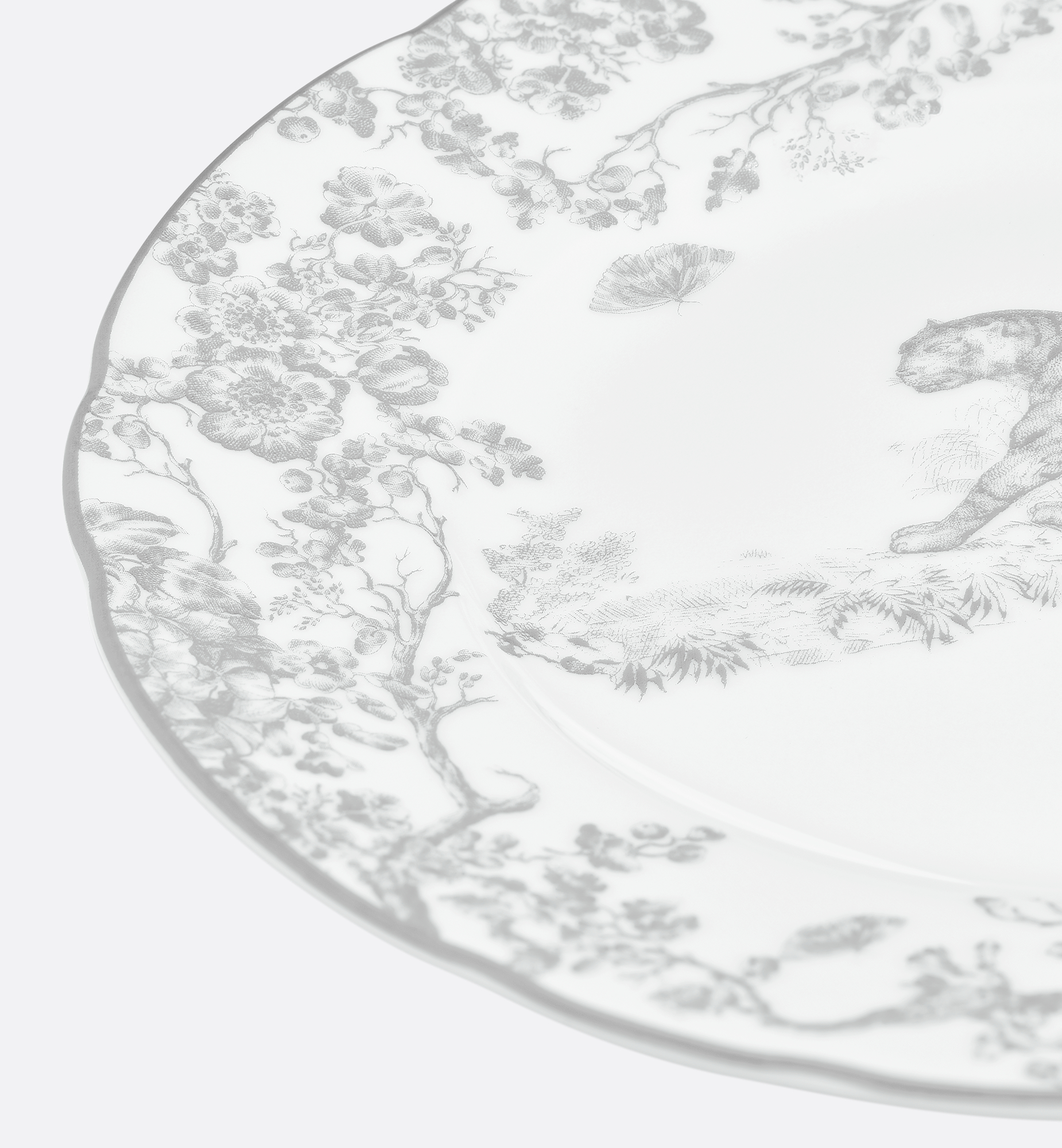 Dessert plate crafted in extra fine Limoges porcelain with a hand-painted filet border and Toile de Jouy Tiger motif. A timeless House code cherished by Christian Dior, Toile de Jouy is constantly reimagined and still adorns Dior Maison’s creations as a tribute to the founding couturier. 100% porcelain. Made in France