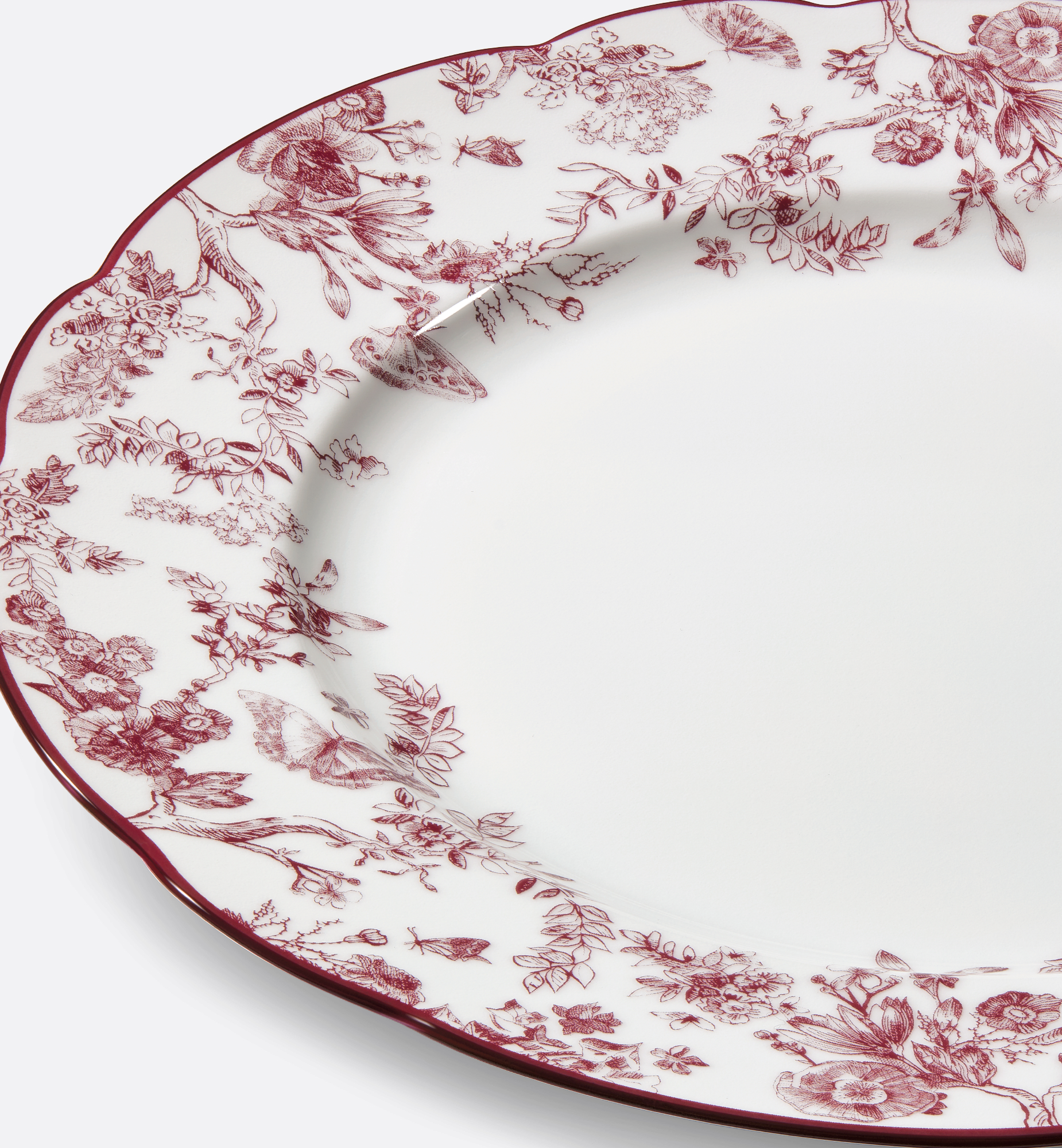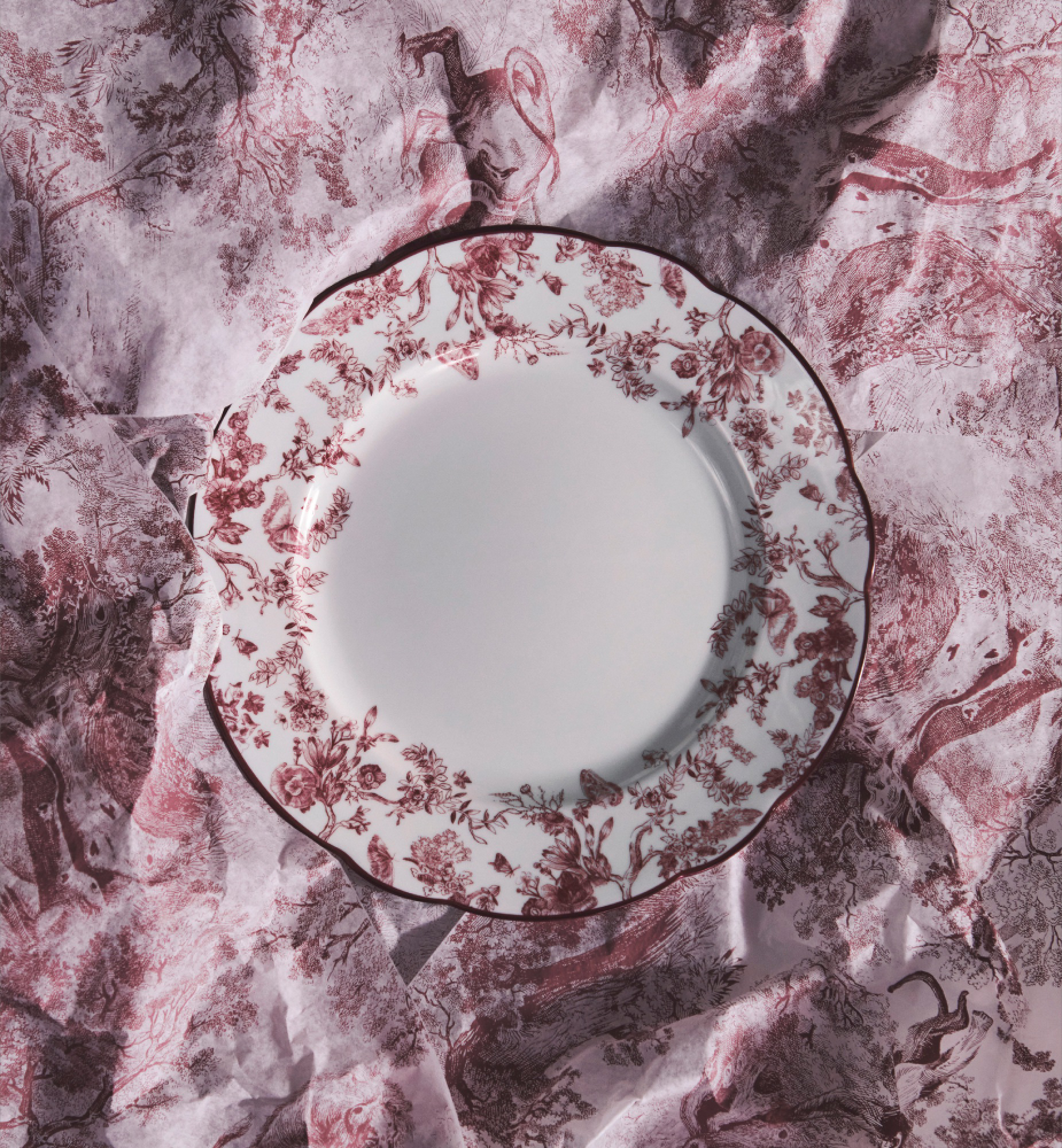 A symbol of Dior’s savoir-faire and excellence, Toile de Jouy is constantly reimagined by Maria Grazia Chiuri and adorns new creations in Limoges porcelain. Plates, coffee ware and other stylized pieces are embellished with the burgundy motif. Intense and bewitching, the color also enhances a placemat and napkin set, embroidered pillow, small candle and trinket tray. A celebration of the art of hosting dear to Mr. Dior. 100% Limoges porcelain. Made in France