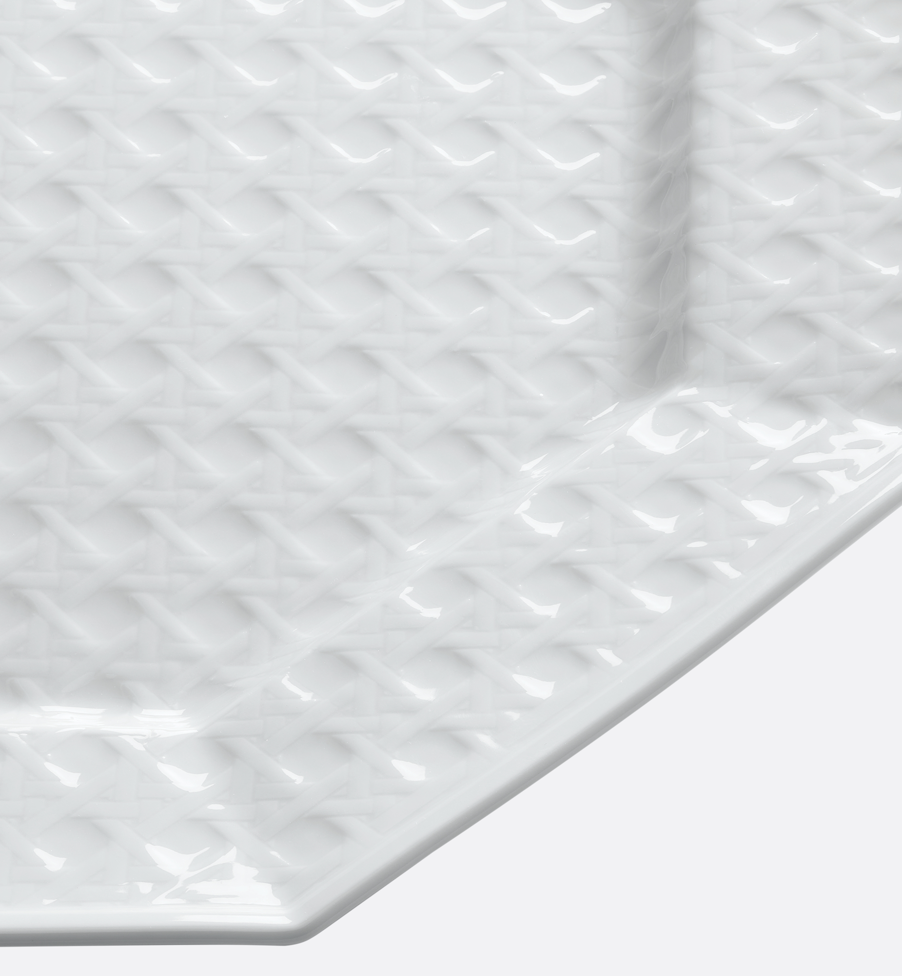 Designed by Cordelia de Castellane, the Miss Dior Cannage line features a brand-new exclusive octagonal shape developed for Dior Maison in tribute to Mr. Dior’s lucky number 8. Enhanced by the iconic intaglio-engraved Cannage motif, the dinner plate boasts an architectural style dear to the founding couturier. 100% porcelain. Made in France