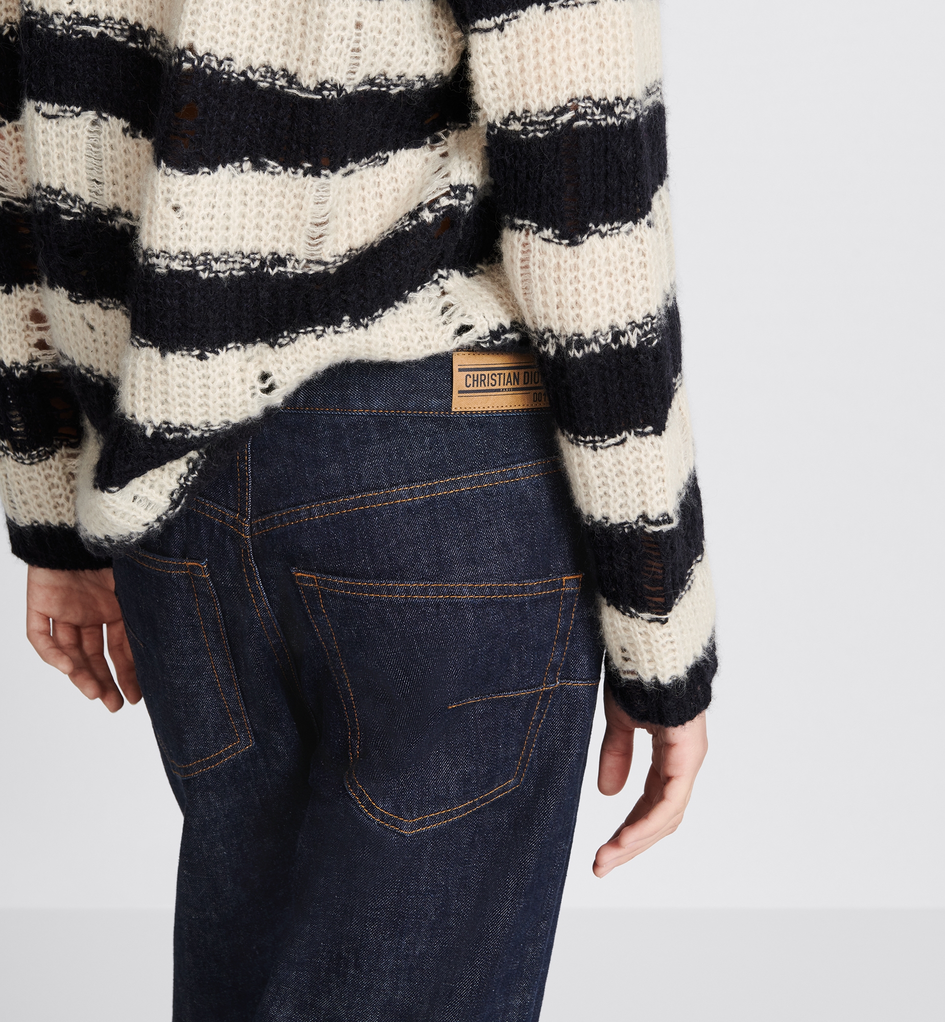 Part of the Dior 8 capsule, the boyfriend jeans are an essential style staple. Crafted in deep blue raw denim, they feature a Christian Dior label on the back that is further enhanced by two horizontal bands and the style number, D01. The jeans will complete any casual look. Belt loops. Concealed zip and clasp closure. Christian Dior D01 jacron label. Unlined. 100% cotton. Made in Italy