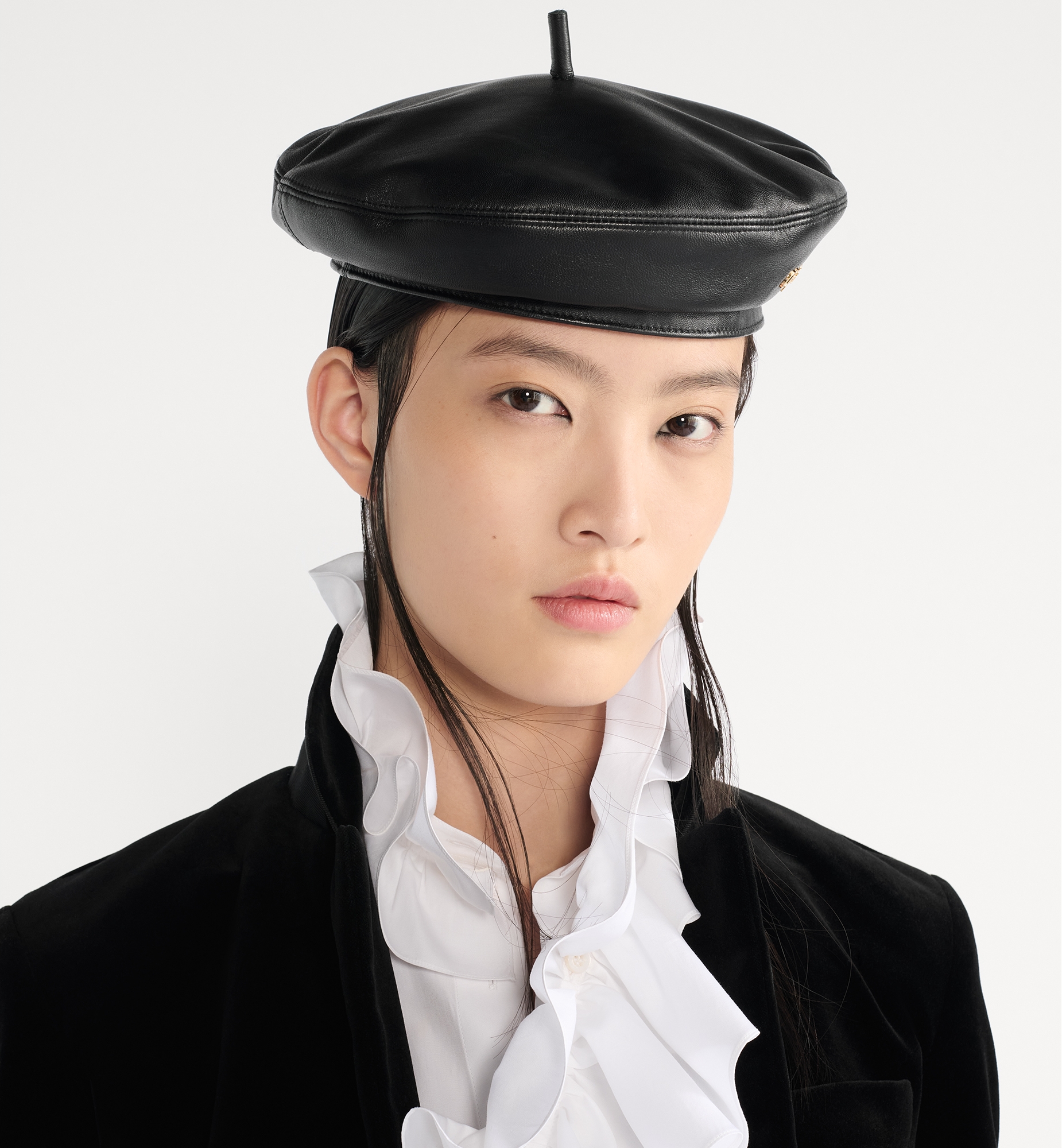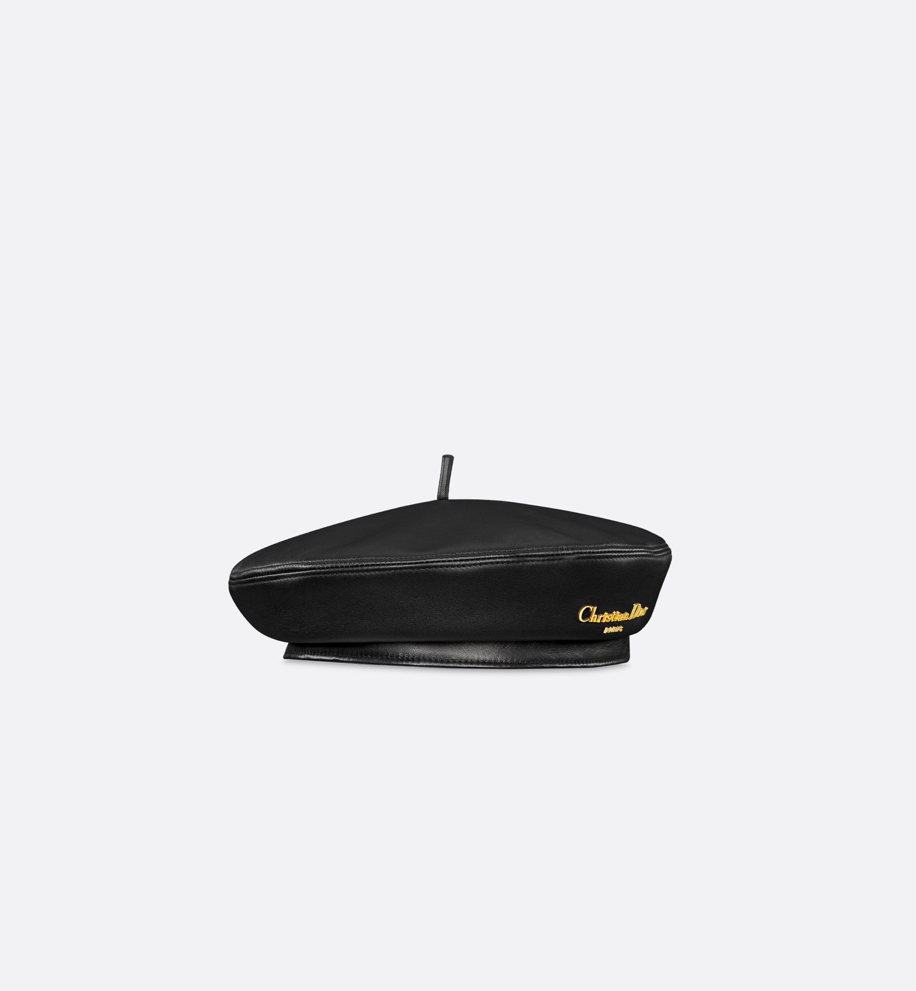 The Dior Arty beret is revisited in a couture variation. Crafted in black lambskin, the style is accented by a gold-finish metal Christian Dior Paris signature on the front. The beret will lend a modern touch to any outfit and can be coordinated with other pieces from the collection. Gold-finish metal Christian Dior Paris signature on the front. 100% lambskin and lining: 100% cotton. Made in Italy