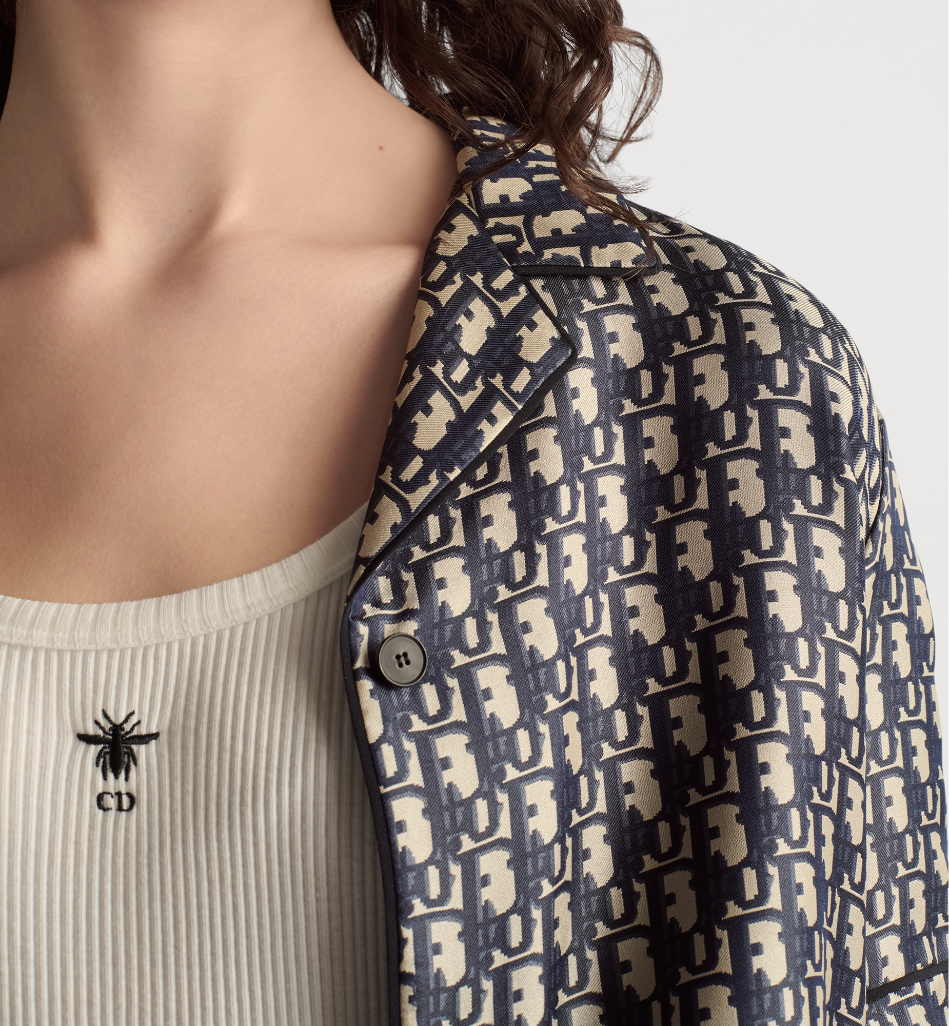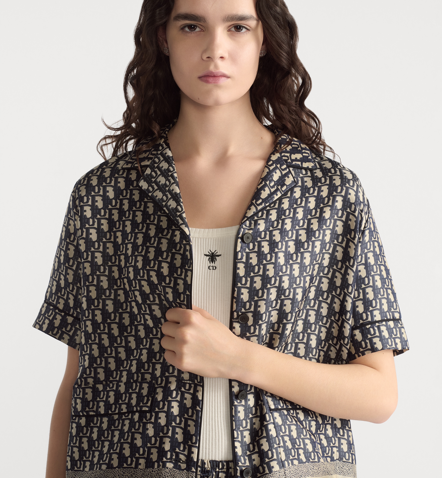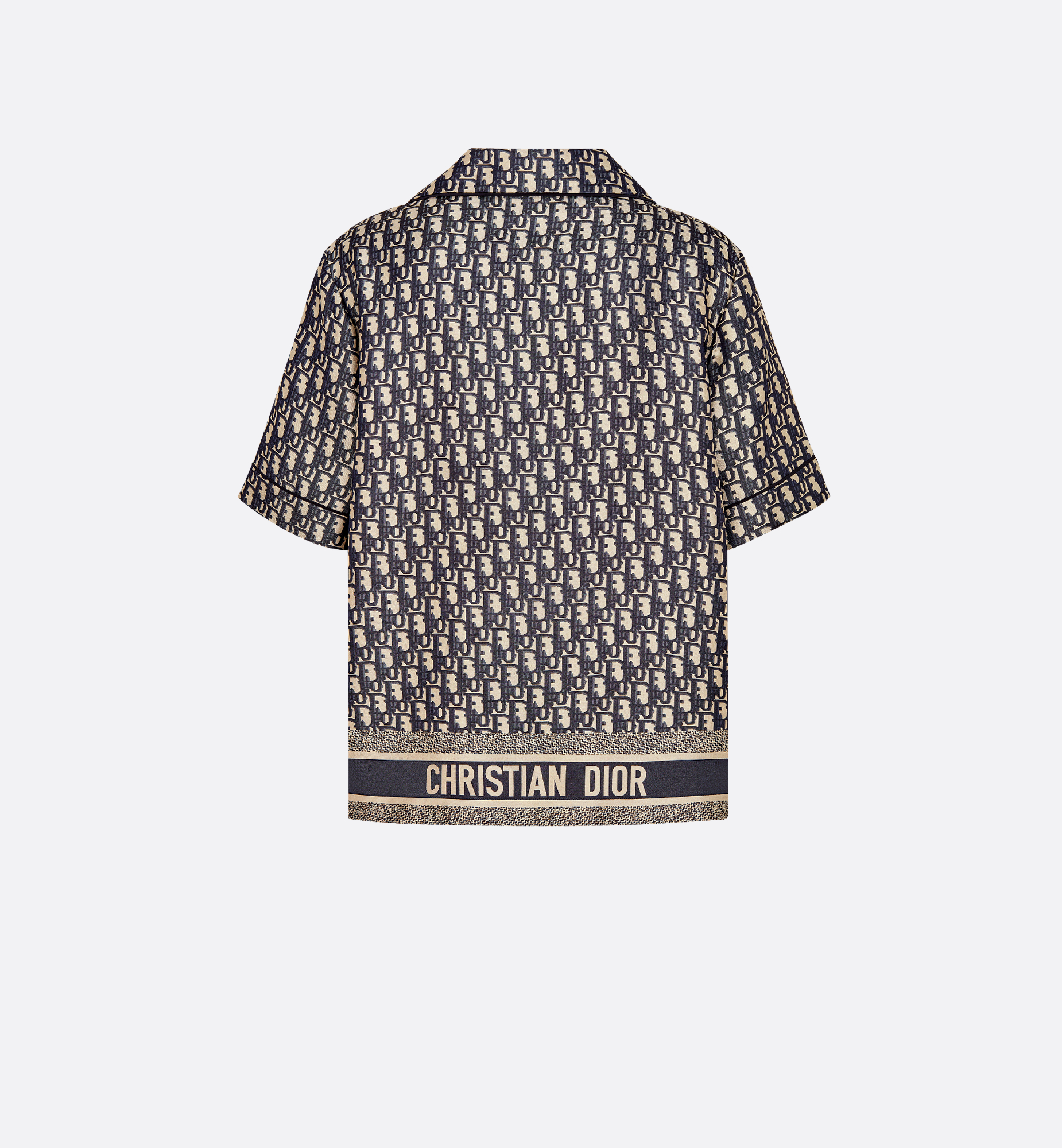 The shirt highlights the hallmark blue Dior Oblique motif. Crafted in silk twill, the design is embellished with a Christian Dior signature contrasting hem, while a button closure and two pockets adorn the front. The lightweight and refined short-sleeved shirt may be paired with the matching pants or shorts to complete the look. Contrasting hem with Christian Dior signature. Piping. Front button closure. Horn buttons. Unlined. 100% silk. Made in Italy