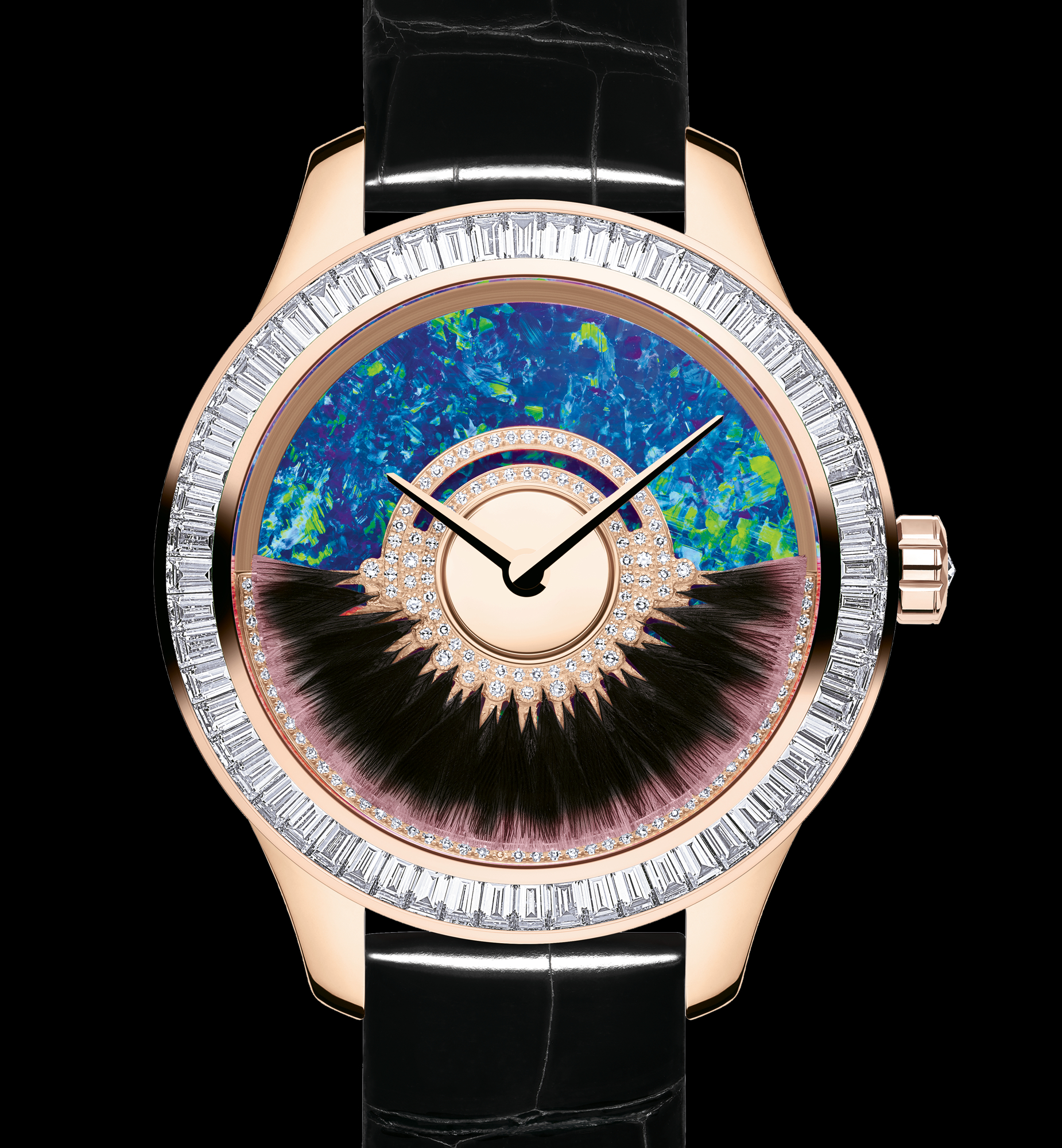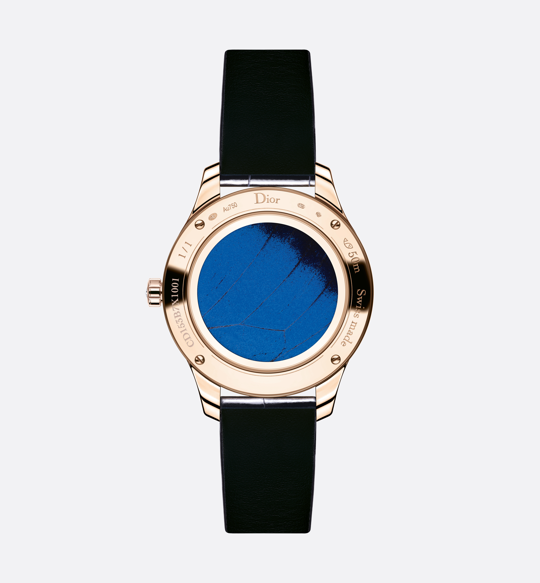 36 mm pink gold case, bezel in pink gold set with baguette-cut diamonds, bezel rim set with round-cut diamonds, crown in pink gold set with a rose-cut diamond, case back in transparent sapphire crystal embellished with a blue butterfly wing.. Water resistant up to 50 meters (164 feet).. Dial in Australian white blue fire opal, faceted hour and minute hands in pink gold.. Shiny black alligator strap with a pin buckle in pink gold set with round-cut diamonds.. Automatic movement Dior Inversé 11 1/2 caliber. Dial-side functional oscillating weight in pink gold set with round-cut diamonds and embellished with feathers. 42-hour power reserve. Functions: Hours – Minutes