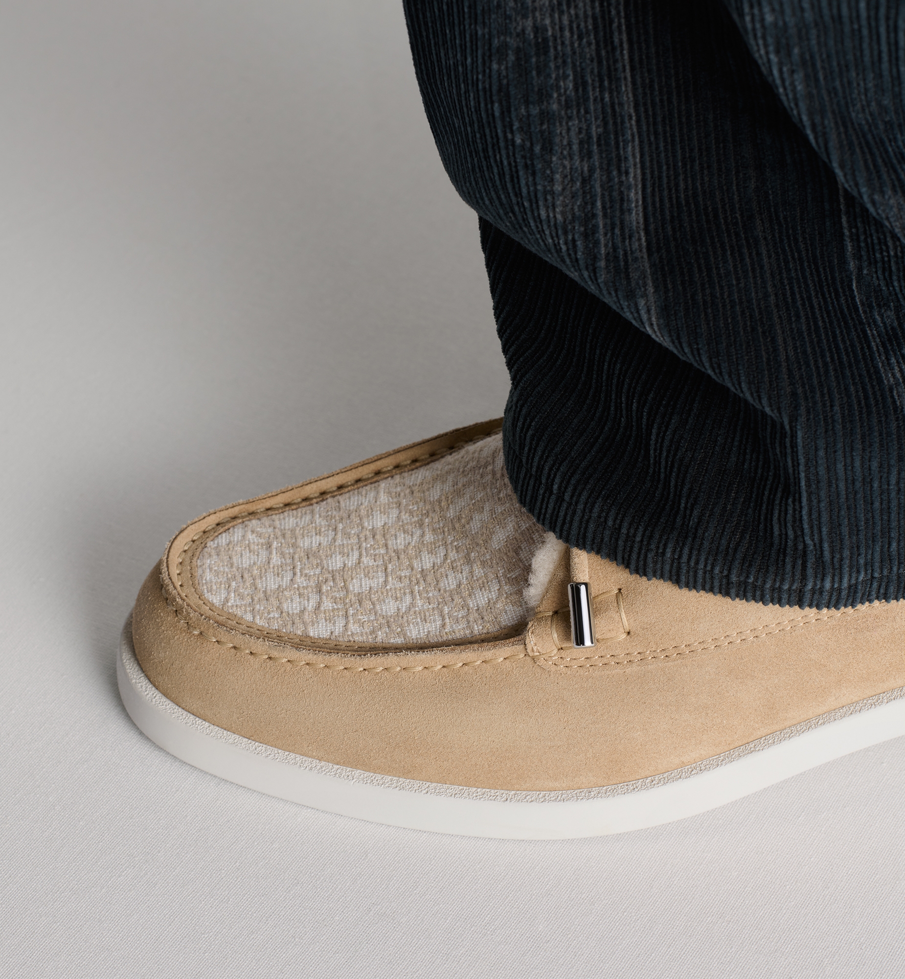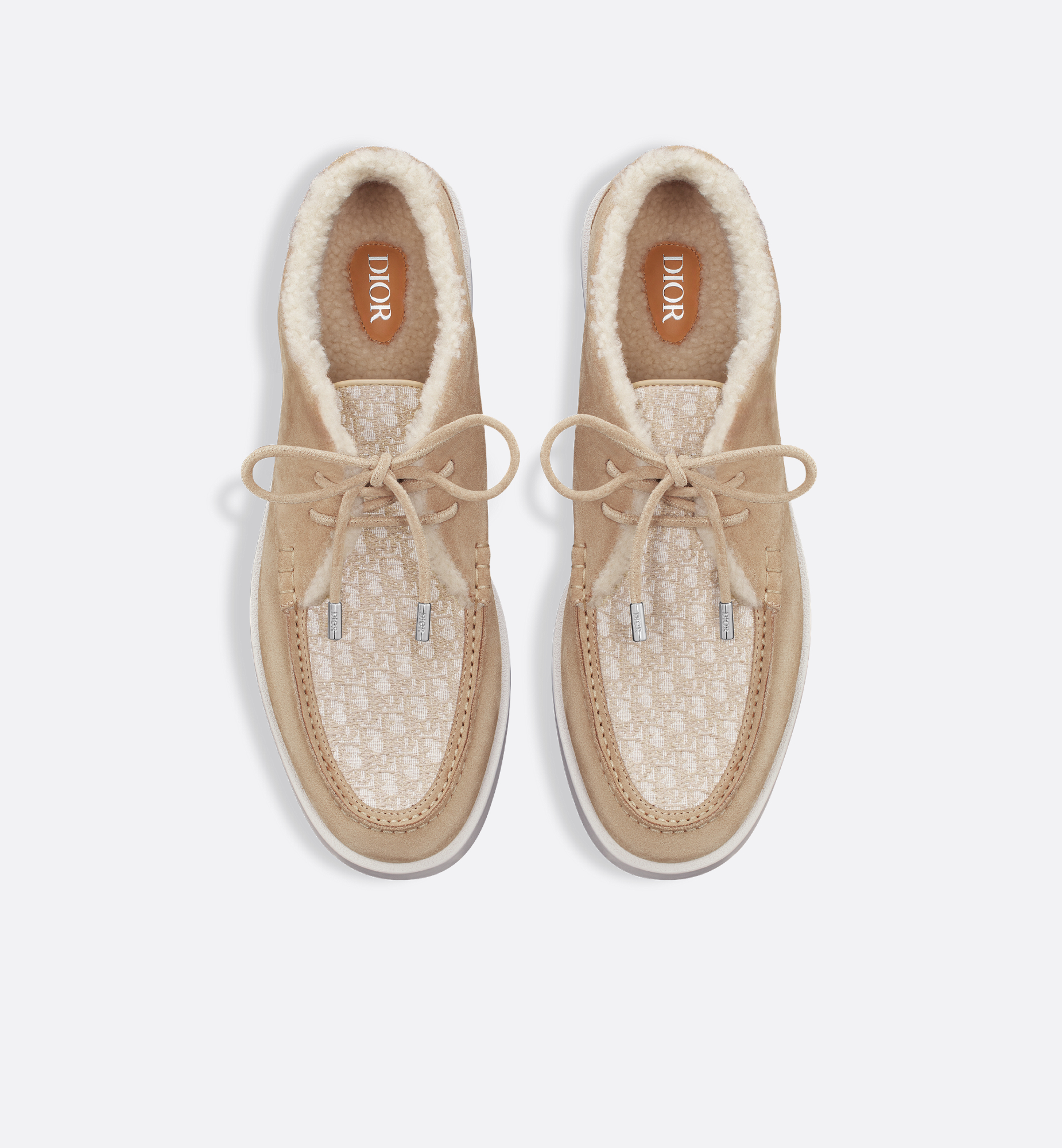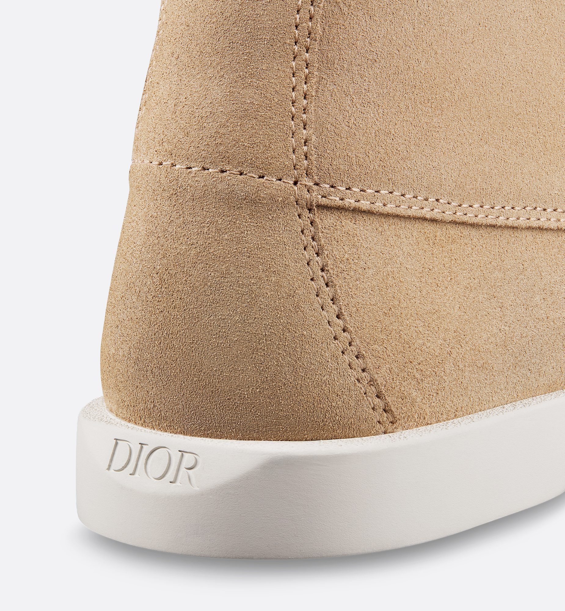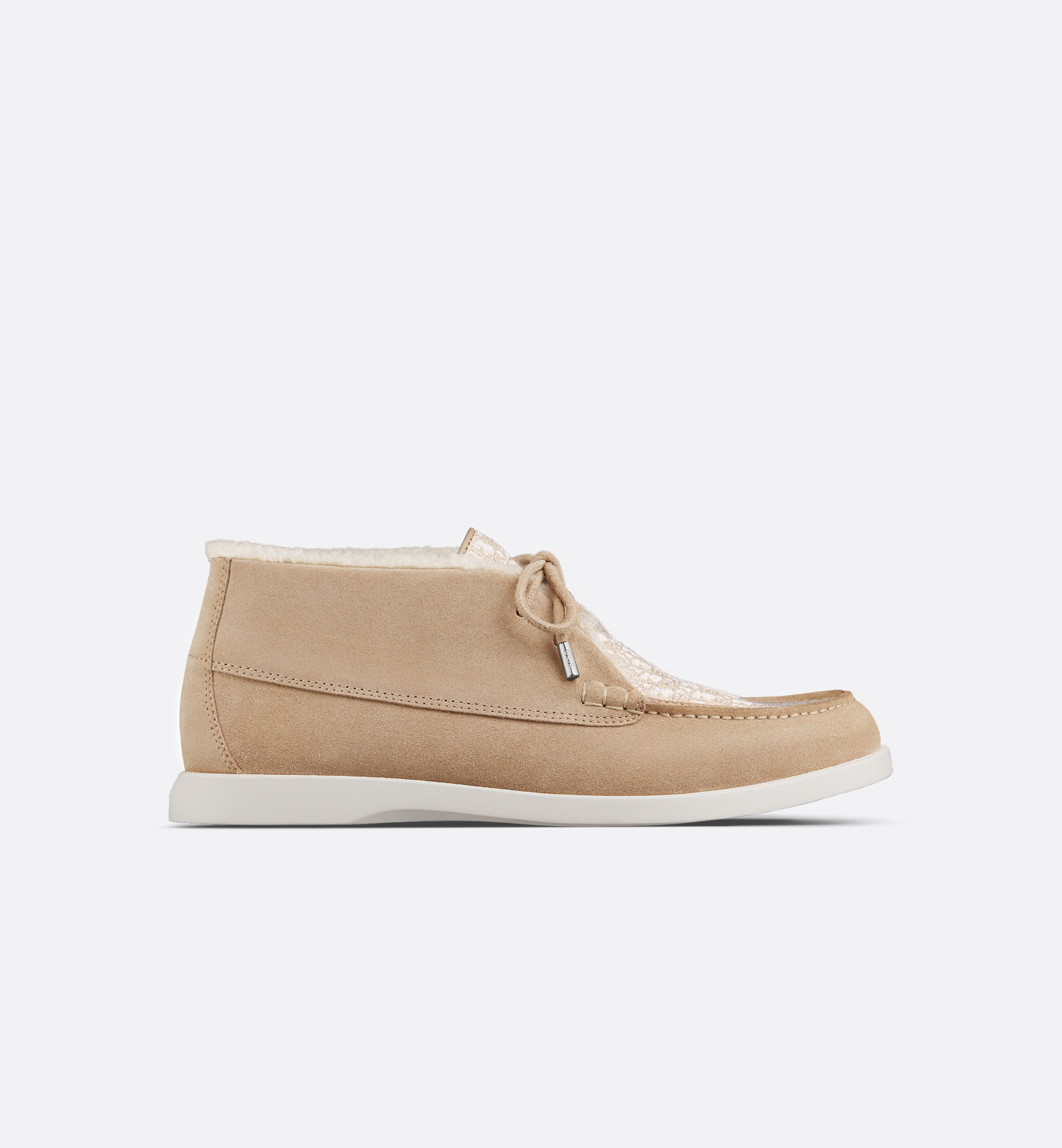 The Dior Granville chukka boot offers a relaxed version of a timeless silhouette. Crafted in luxurious and ultrasoft beige suede, the style is adorned with a tonal Dior Oblique jacquard panel and tonal leather laces on the vamp, while the interior is fully lined in cream sheepskin shearling. The creation is completed by a white lightweight rubber sole and is enhanced by an engraved Dior Oblique motif on the outsole and the Dior signature engraved on the rear. The warm and comfortable shoe will lend an elegant touch to casual looks. Main composition: suede calfskin, calfskin and cotton. Sheepskin shearling lining. Dior signature on the back. High top. Leather lace-up closure. White rubber outsole engraved with the Dior Oblique motif. Welded construction. Dust bag included. Made in Italy