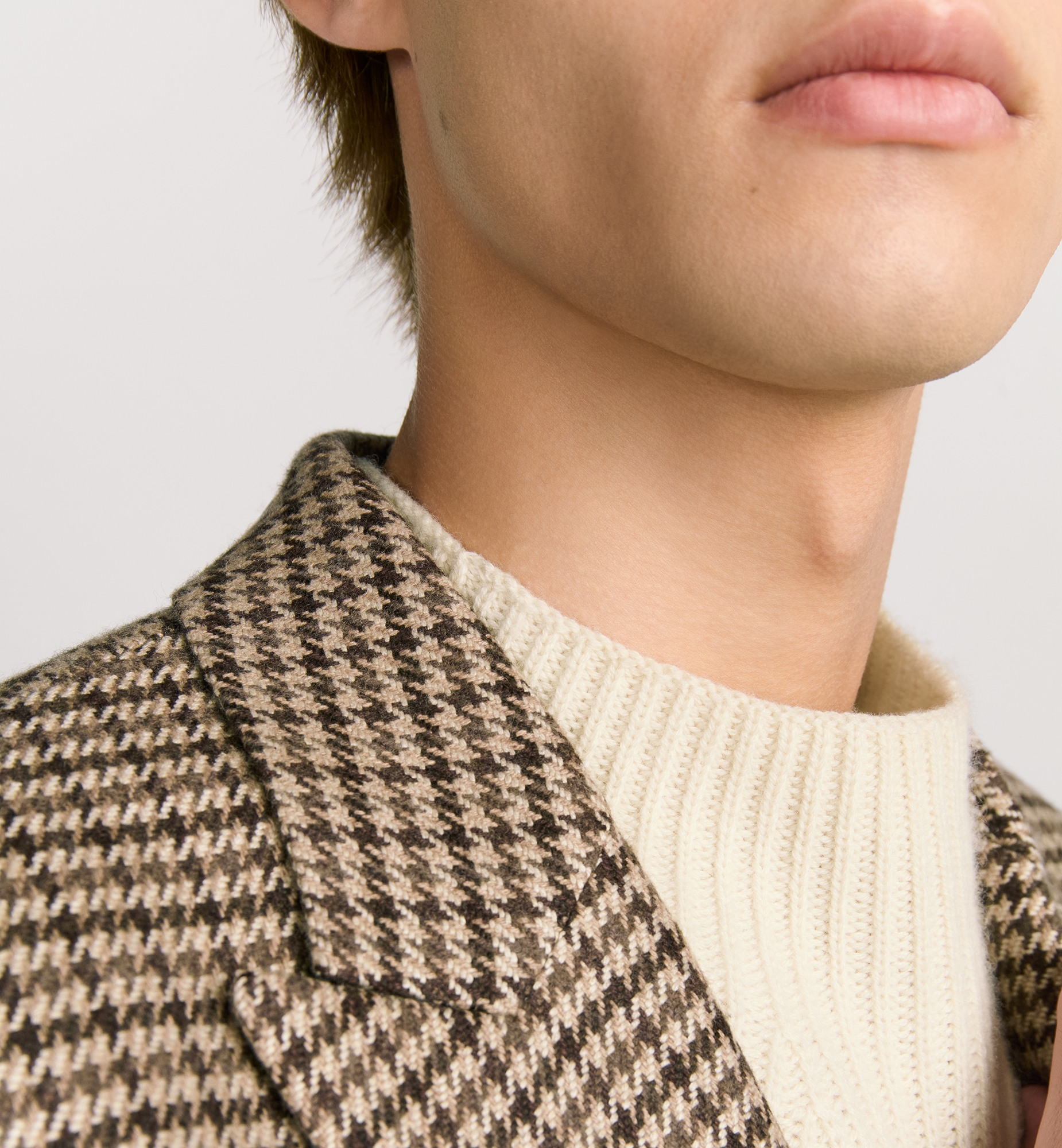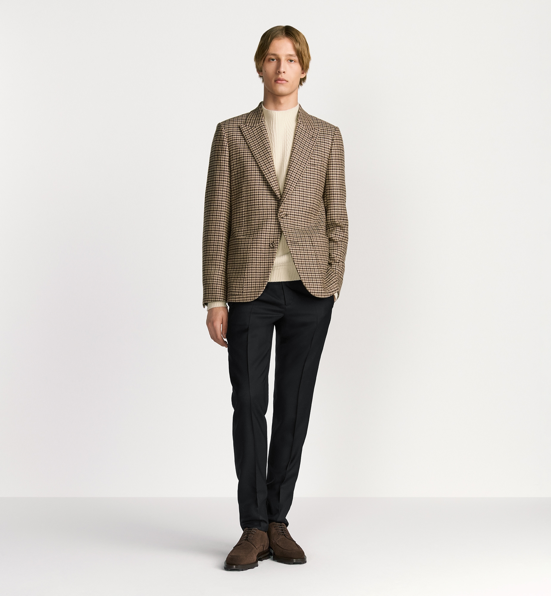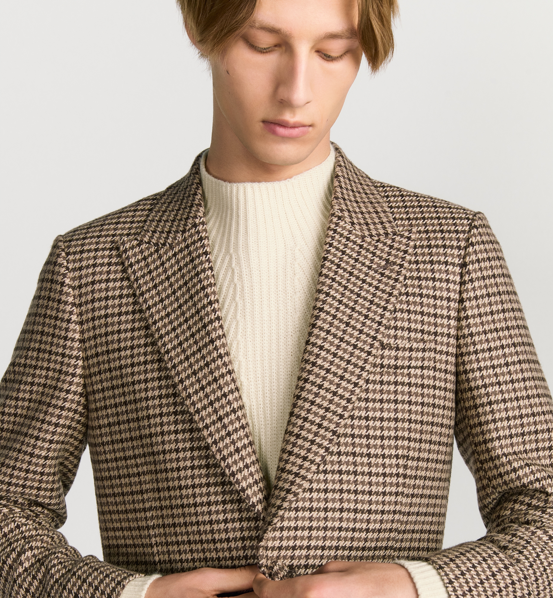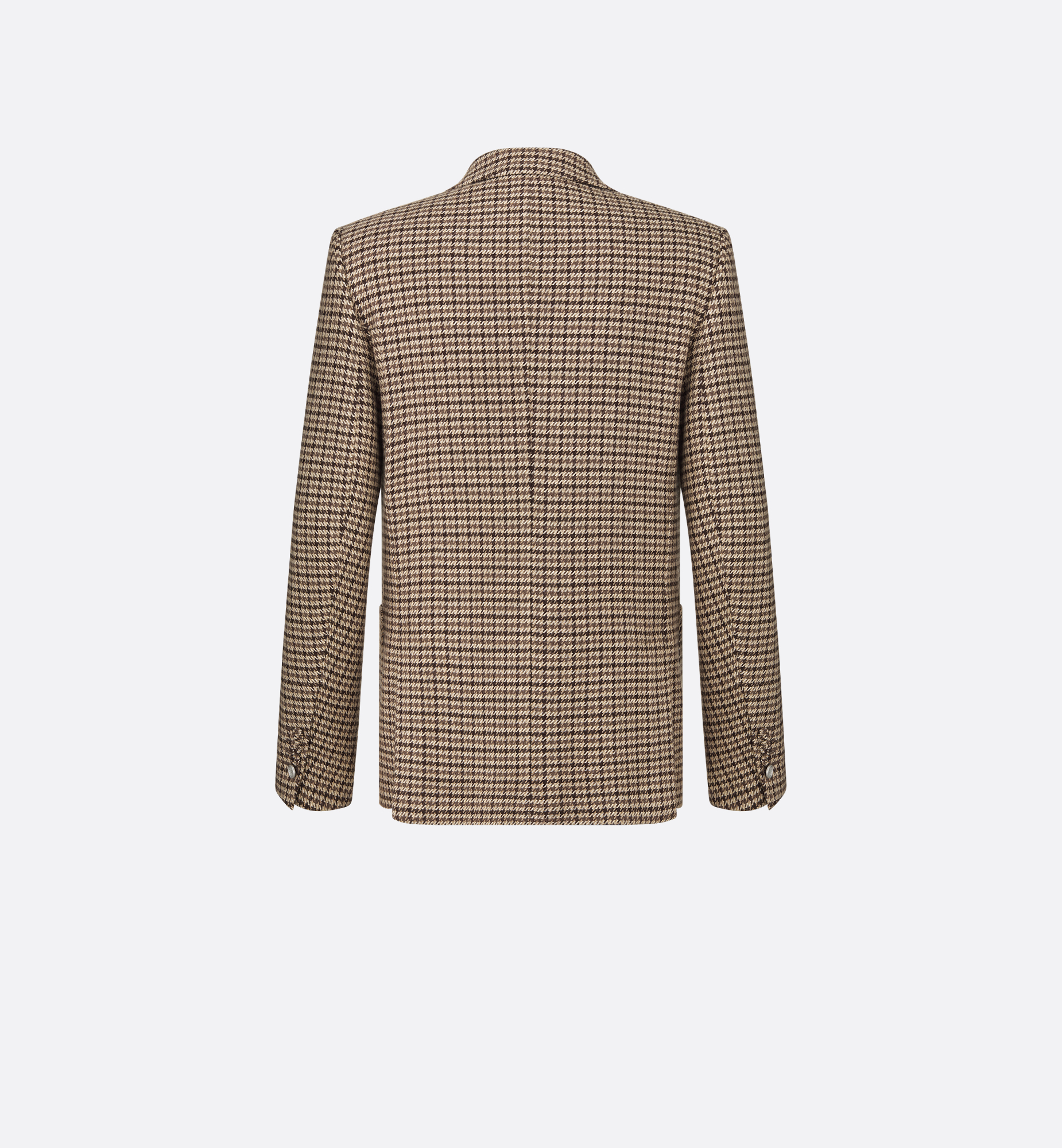 The Dior Icons line showcases the House’s savoir-faire and traditions with an understated and elegant style. Made in brown cashmere and silk featuring a houndstooth motif, the jacket has classic peak lapels and side patch pockets. Pared-back and timeless, the jacket will pair effortlessly with pants from the Dior Icons line. Peak lapels. Single-breasted with two covered buttons. Welt chest pocket and side patch pockets. 52% silk, 48% cashmere and lining: 100% cupro. Made in Italy
