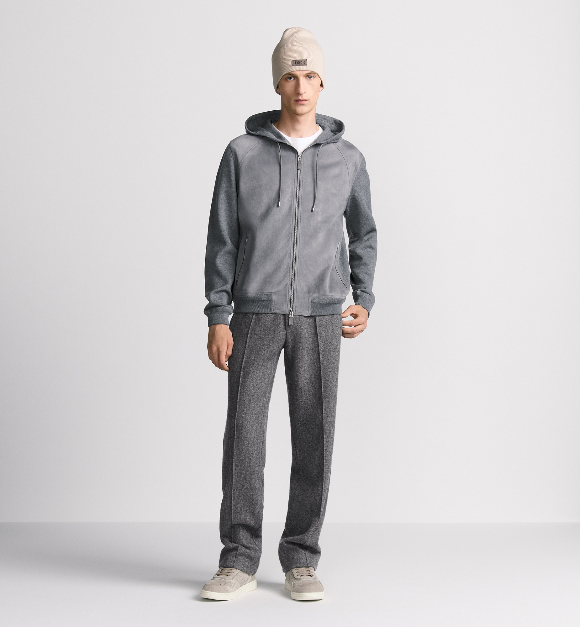 The zipped hooded sweatshirt from the Dior Icons line showcases the House’s savoir-faire and traditions with an understated and elegant style. Crafted in a gray virgin wool Punto Milano knit, it features suede on the front embossed with the Dior signature in an interplay of contrasting fabrics. The practical and elegant piece can be worn with track pants. Embossed Dior signature on the front. Suede on the front. Drawstring hood. Two-way zip fastening with Dior signature zipper pulls. Zip side pockets. Ribbed cuffs and hem. 100% virgin wool and lining: 100% cupro (18 gauge)*. Made in Italy