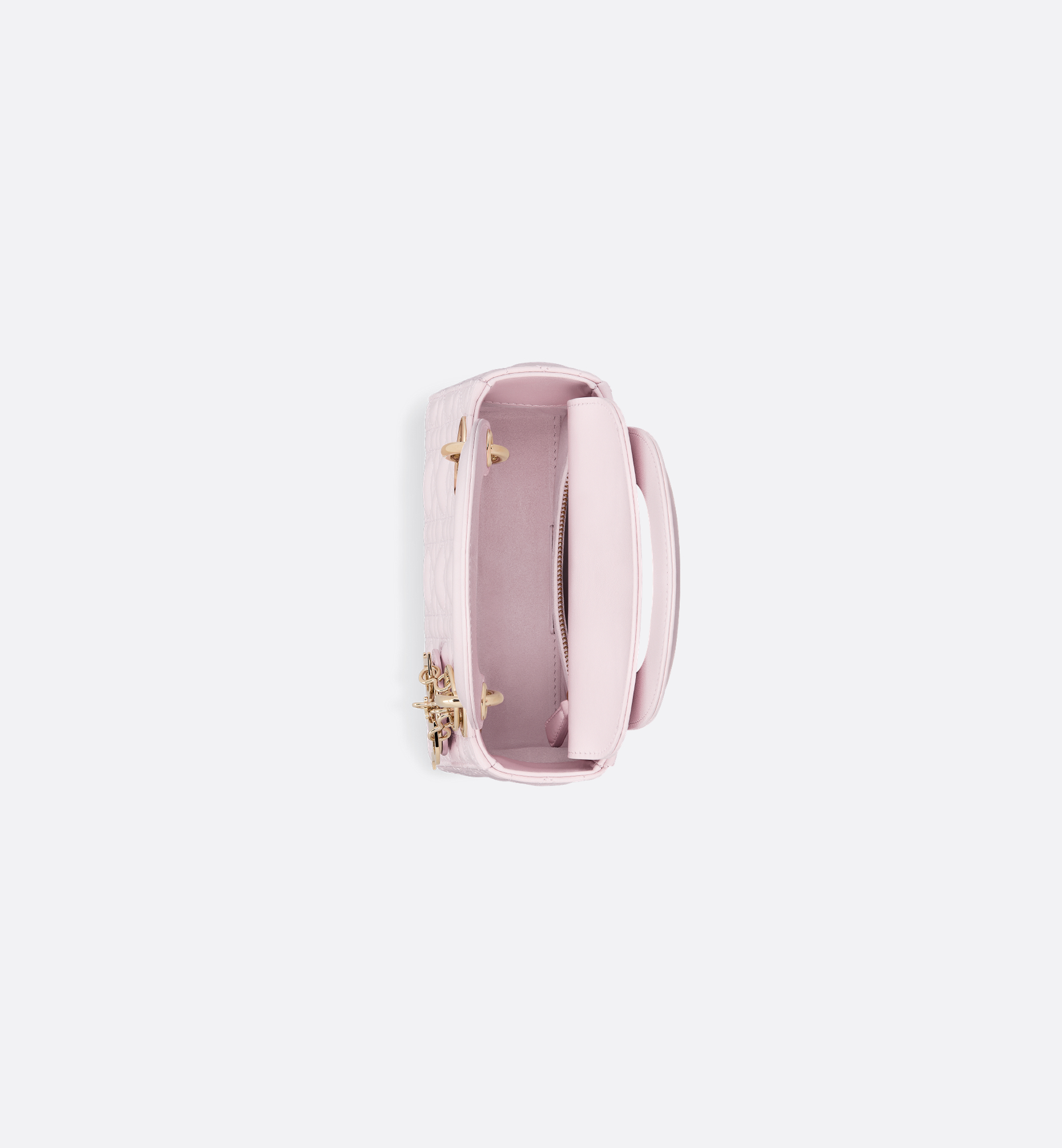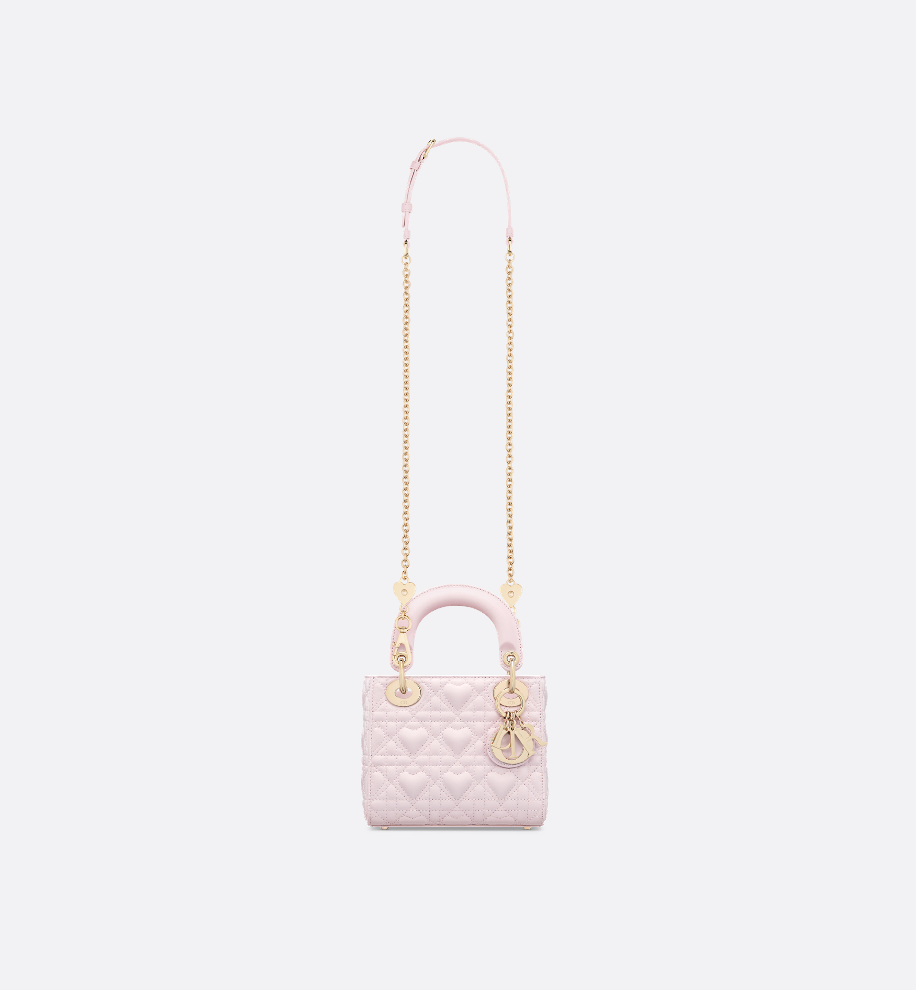Part of the Dior Lucky capsule, the Lady Dior bag epitomizes the House’s vision of elegance and beauty. Sleek and refined, the timeless style is crafted in pale pink lambskin showcasing Cannage topstitching with a heart motif. Pale gold-finish metal D.I.O.R. charms further illuminate the silhouette. Featuring a removable chain elevated by a heart charm with a white resin pearl at the center, the miniature Lady Dior bag can be carried by hand, worn over the shoulder or crossbody, and it will pair well with other creations from the Dior Lucky capsule. Main composition: lambskin. Goatskin and lambskin lining. Detachable chain with heart charm and white resin pearl. Interior zip pocket. The bag may be paired with the House’s different embroidered straps. Dust bag included. Made in Italy