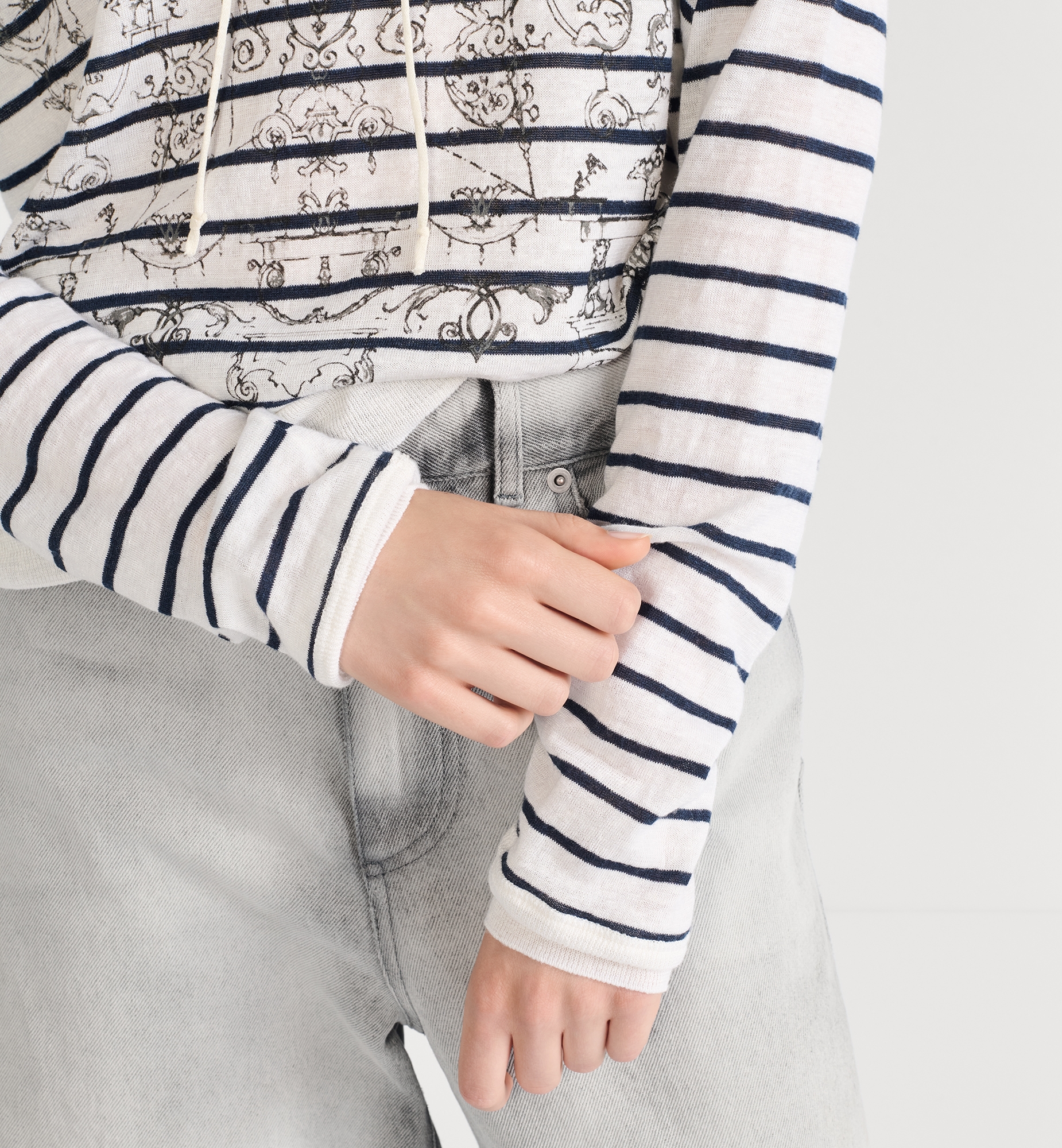 The Dior Marinière sweater, knit in navy blue and white linen, cashmere and silk, showcases Pietro Ruffo’s Dioresque Stella motif, offering a new take on the House’s lucky star in a delicate architectural framework inspired by the grotesque paintings of ancient Rome. Featuring a relaxed fit, a drawstring hood and ribbed trim, the sweater will enhance looks throughout the seasons, and can be paired with other Dioresque Stella creations. Drawstring hood. Ribbed cuffs and hem. Unlined. 75% linen, 18% cashmere, 7% silk (16 gauge)*. Made in Italy. Treat with extra care and gently dry clean