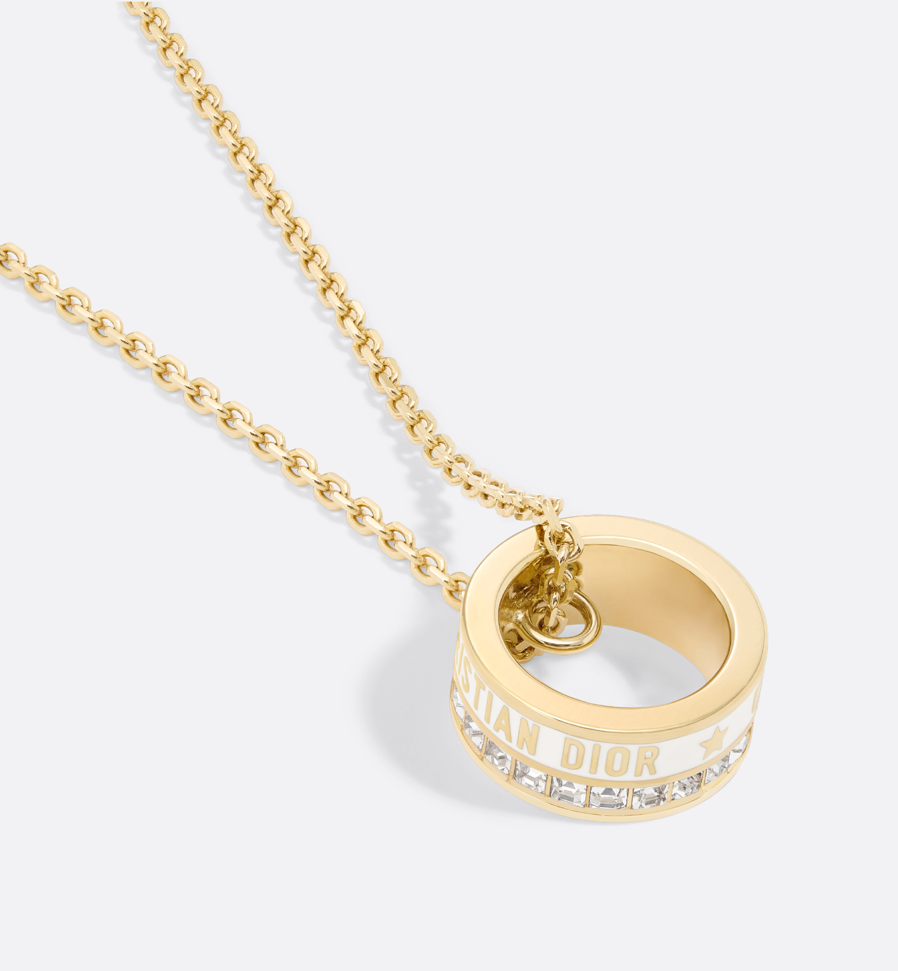 The Dior Night Code necklace has a modern and refined look. Finely crafted in gold-finish metal, the thin chain showcases a ring adorned with the Christian Dior signature enhanced by white lacquer, while the edge features a delicate pavé of sparkling crystals. The necklace can be paired with other Dior Night Code creations. Sparkling crystals. Christian Dior signature. White lacquer. Gold-finish metal. Lobster clasp. Made in Germany