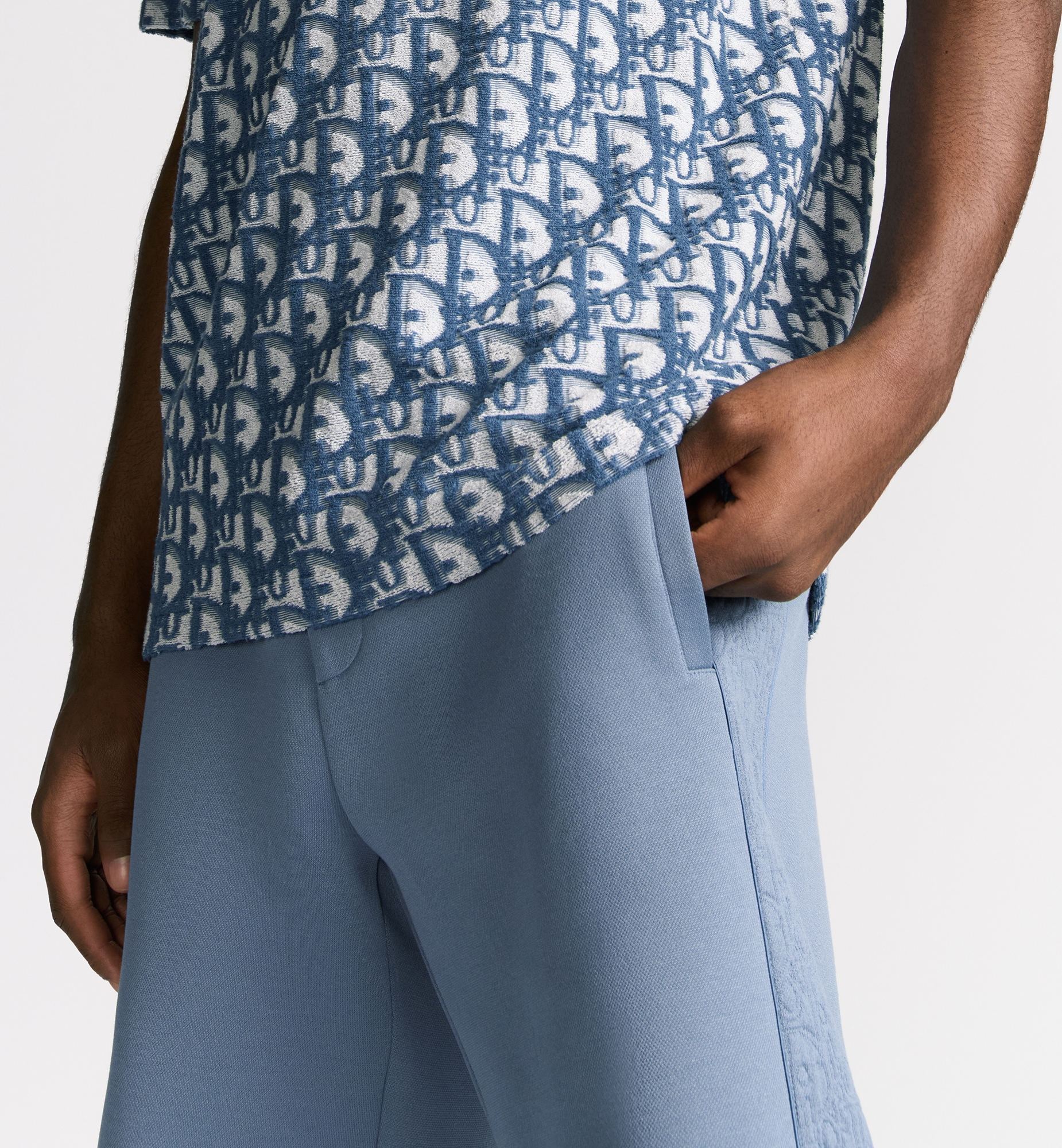 New for Fall 2025, the Bermuda shorts showcase the House’s hallmark Dior Oblique motif. Crafted in sky blue cotton-blend jersey, they are distinguished by quilted Dior Oblique inserts on the sides. Featuring subtle detailing, the Bermuda shorts can be paired with the matching blouson jacket from the collection. Dior Oblique inserts on the sides. Elastic drawstring waistband. Rear welt pockets. Side welt pockets. 38% cotton, 32% polyester, 30% polyamide. Made in Italy