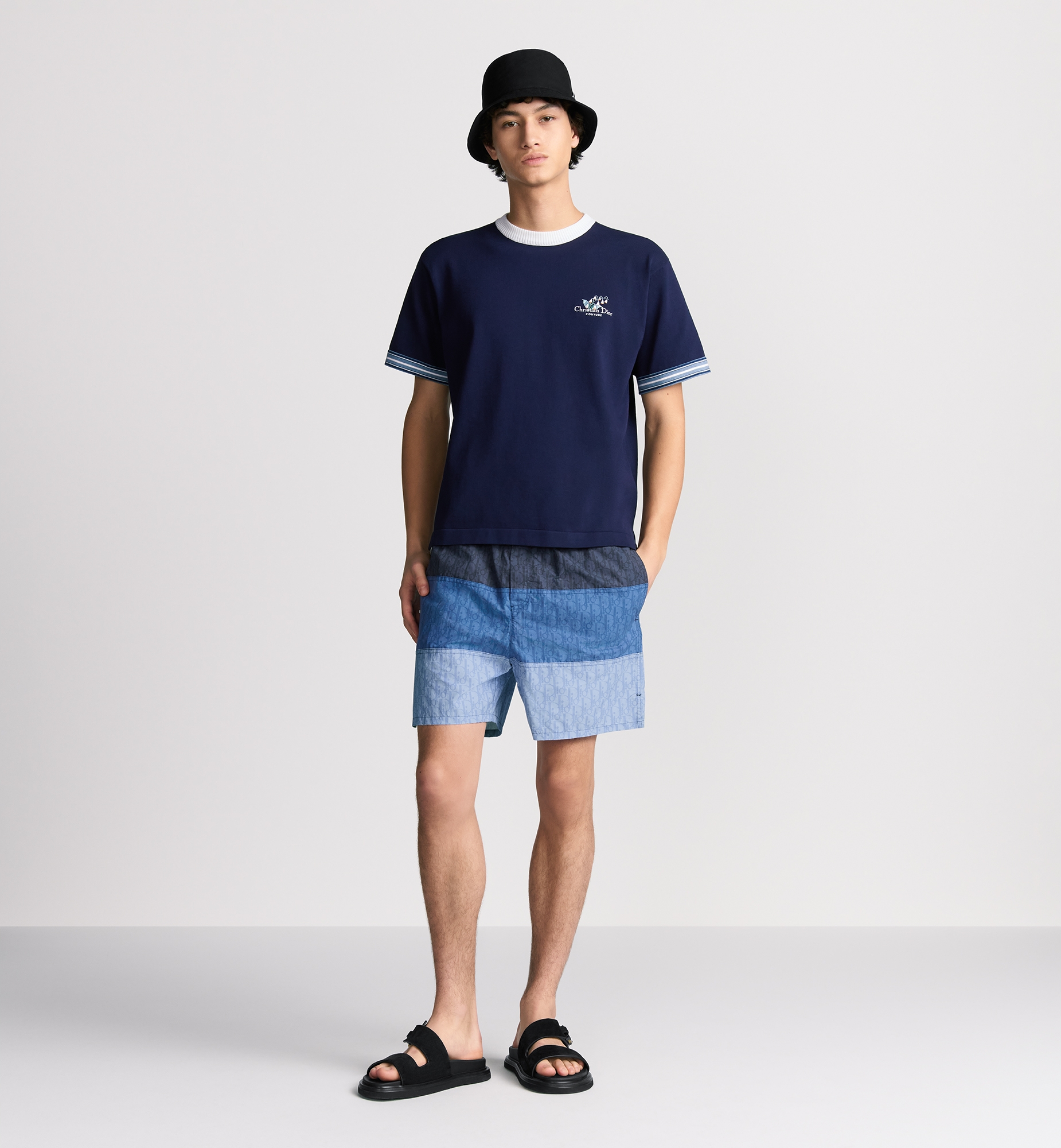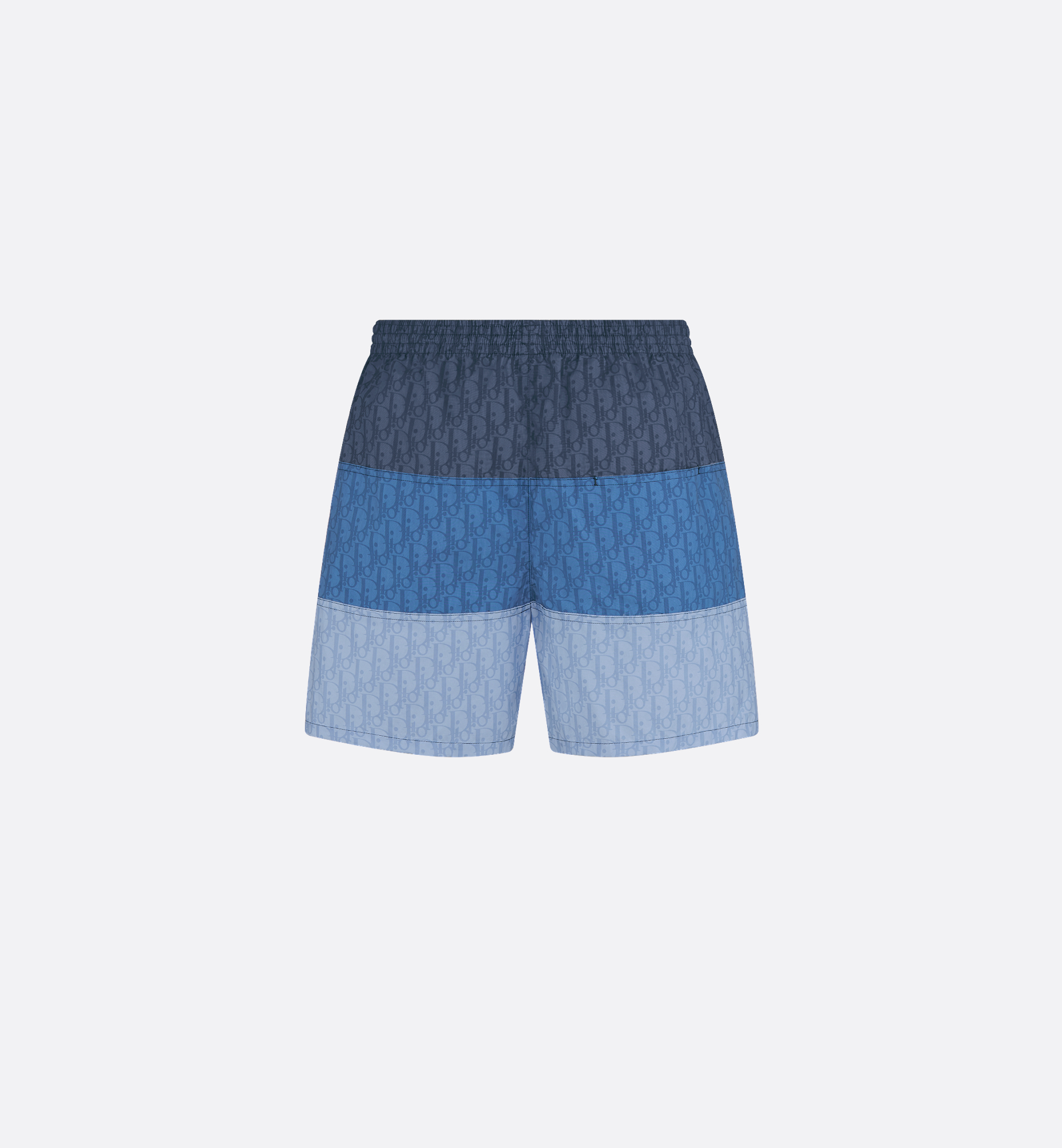 New for Fall 2025, the swim shorts showcase the hallmark Dior Oblique motif. Crafted in technical fabric, they feature three blue color-block bands and side slit pockets. Elastic waistband. Side slit pockets. 100% polyamide. Made in Italy