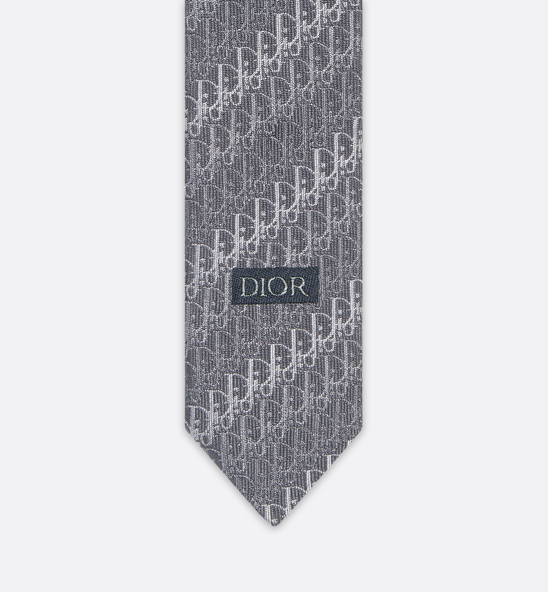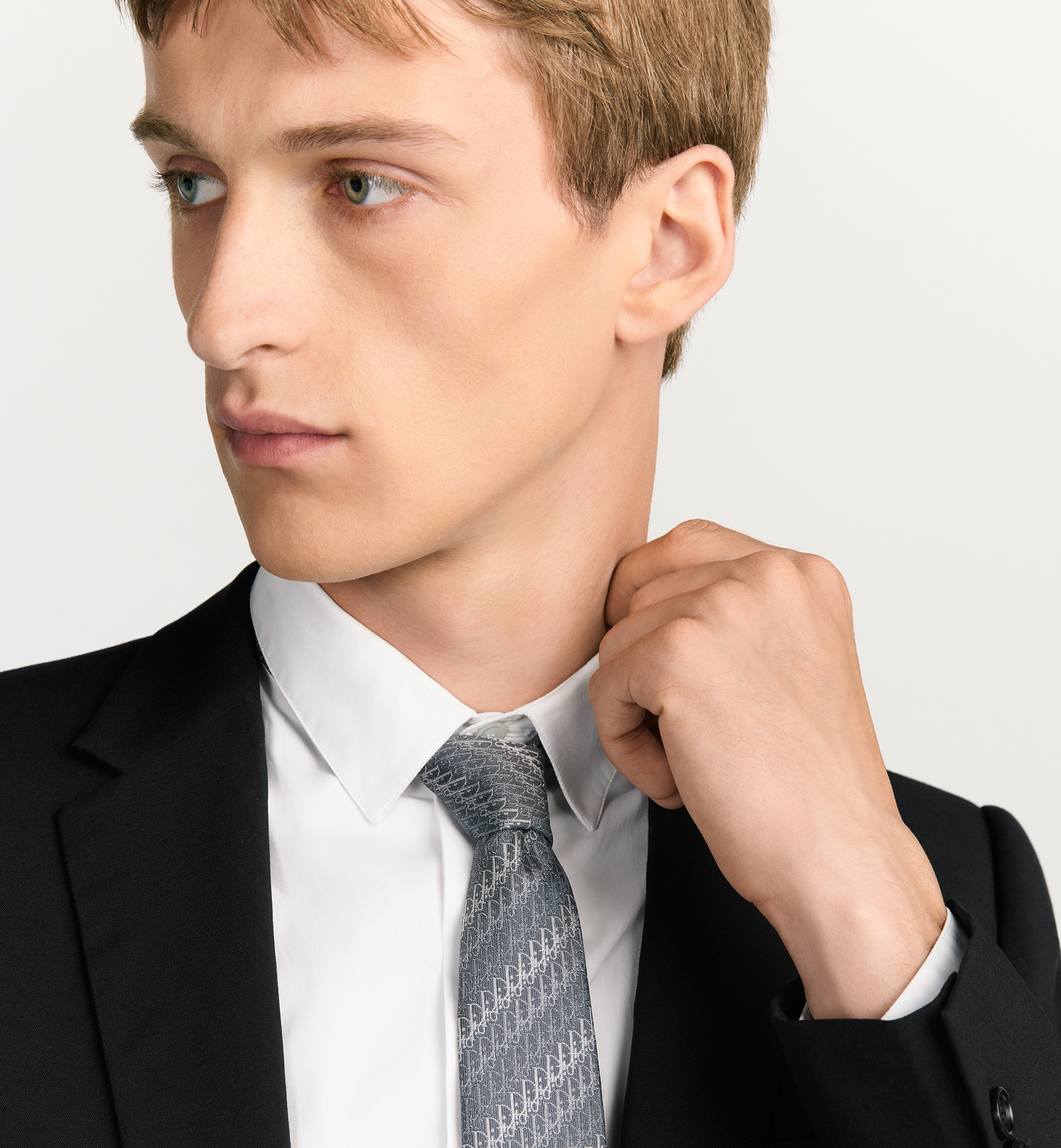 The gray tie showcases the Dior Oblique Trio motif, offering a new take on the iconic pattern with a subtle three-tone effect. Elegant and sophisticated, the silk creation will lend a graphic touch to any suit. Gray allover Dior Oblique Trio jacquard. Dior jacquard signature on the exterior of the tail. 100% silk. Made in Italy