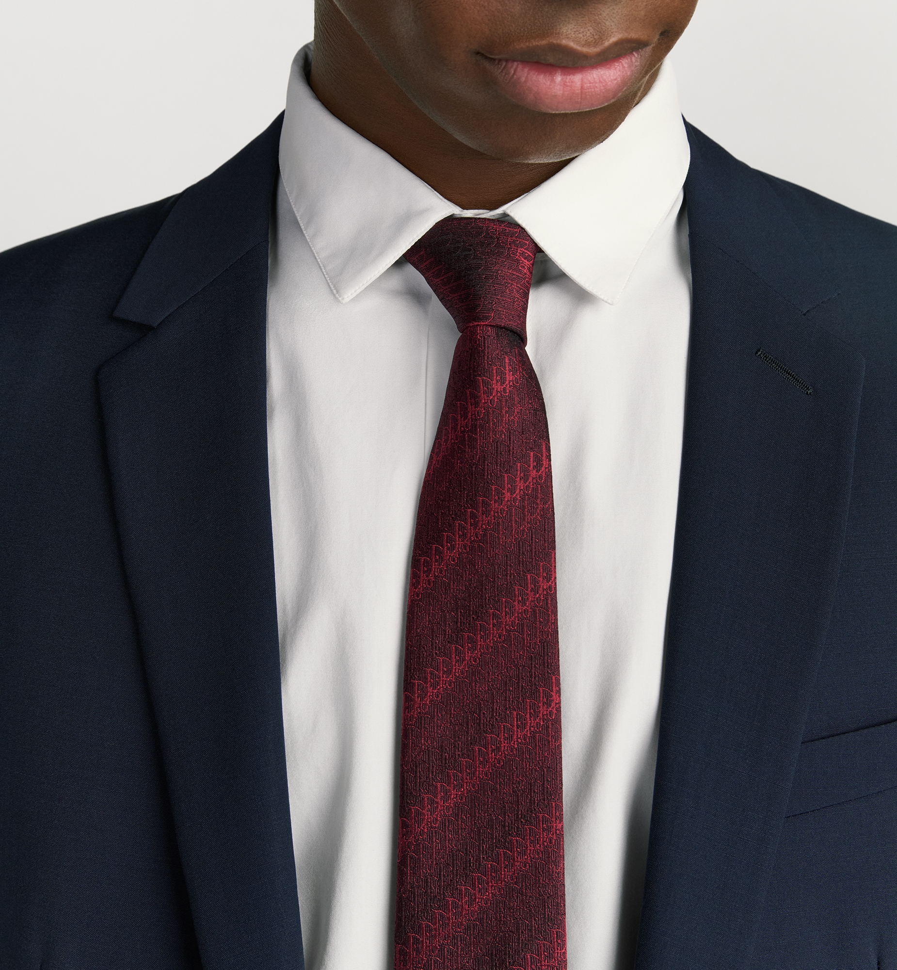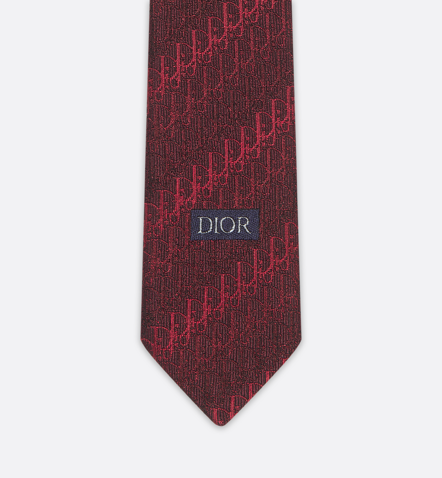 The red tie showcases the Dior Oblique Trio motif, offering a new take on the iconic pattern with a subtle three-tone effect. Elegant and sophisticated, the silk creation will lend a graphic touch to any suit. Red allover Dior Oblique Trio jacquard. Dior jacquard signature on the exterior of the tail. 100% silk. Made in Italy
