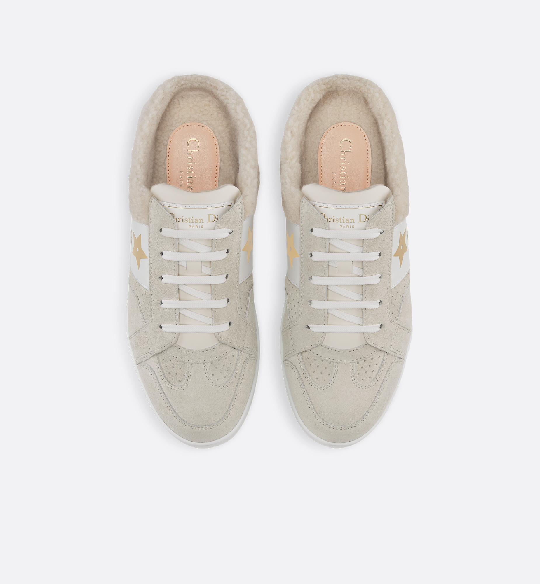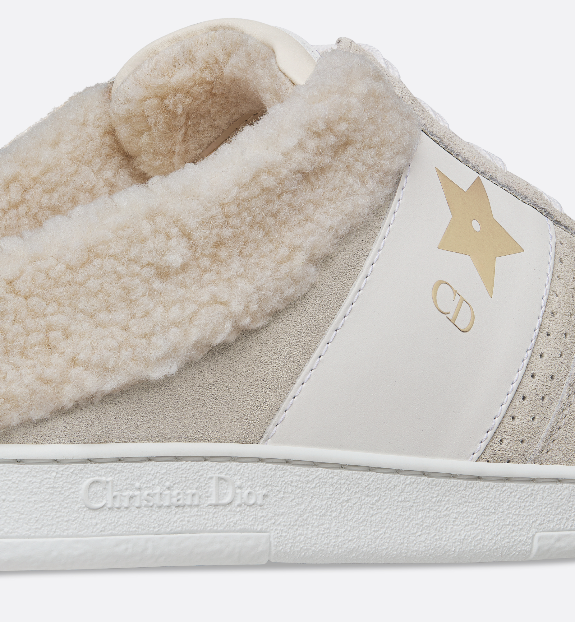 The Dior Star sneaker elevates the line with a modern creation. Its open-back design is distinguished by gray virgin wool. The gray suede calfskin upper is enhanced by a white calfskin panel adorned with a gold-tone CD signature and star. Completed by a thin signature sole, the lightweight sneaker will finish any relaxed outfit throughout the year. Main composition: calfskin, technical fabric and virgin wool. Technical fabric, virgin wool, calfskin and lambskin lining. Christian Dior Paris signature on the tongue. CD signature with gold-tone star on both sides. Rubber sole with star, Christian Dior’s lucky symbol. Made in Italy. Additional set of laces provided