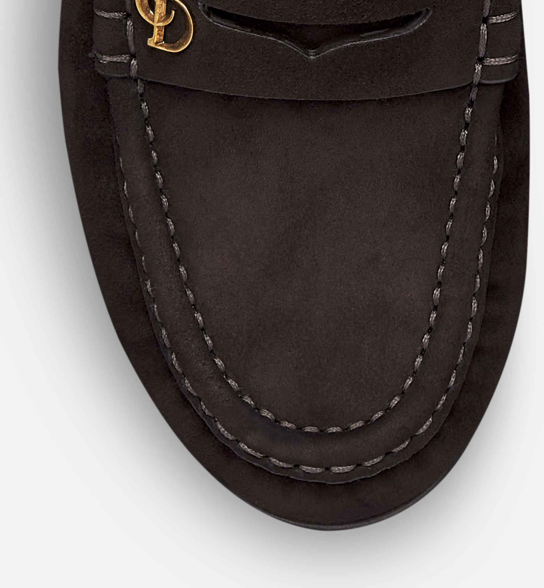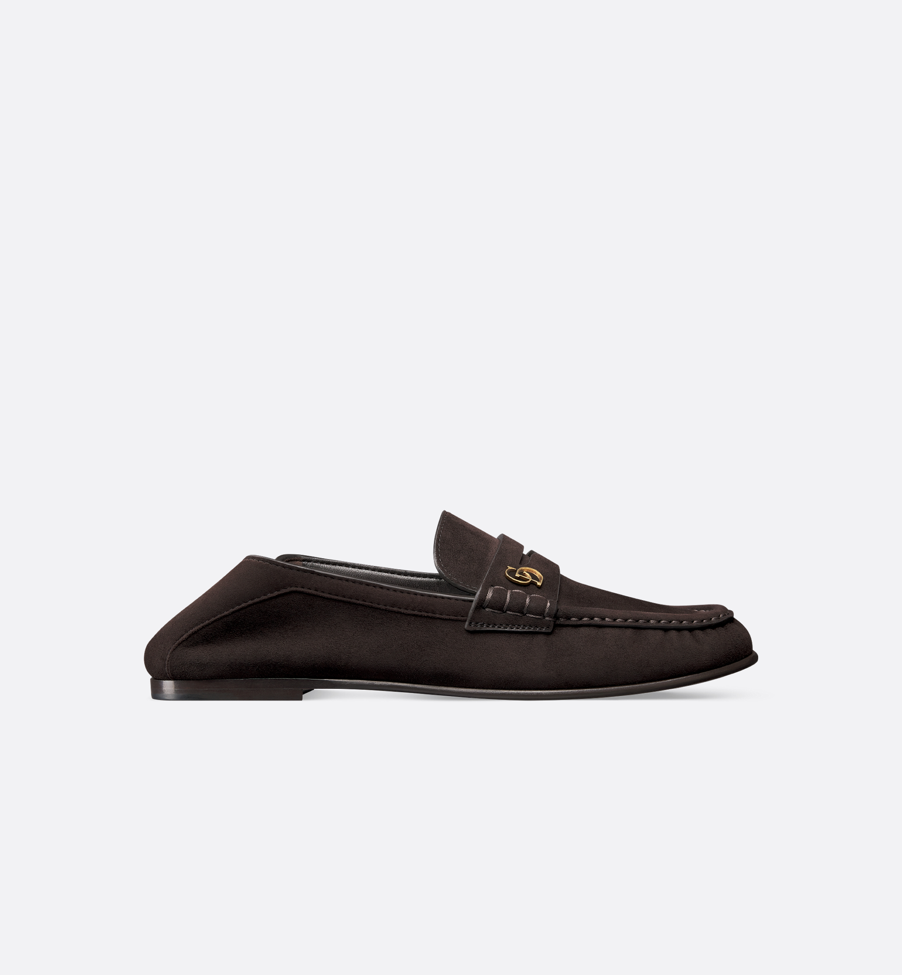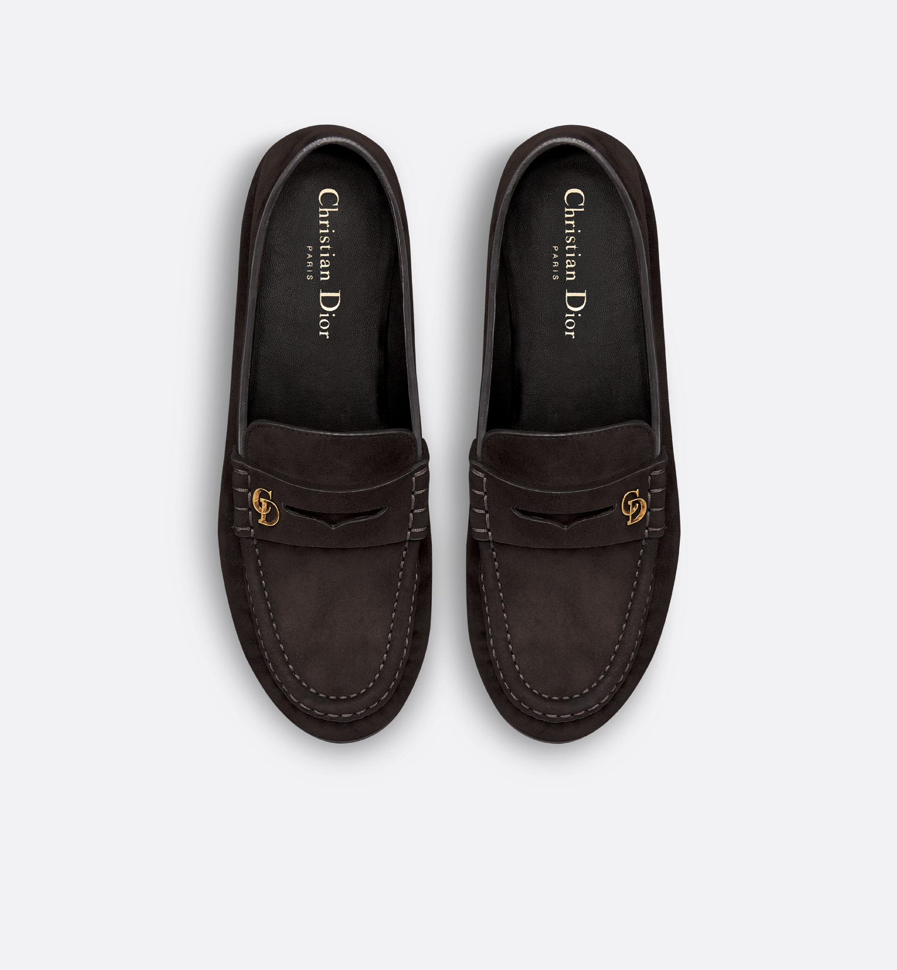 New for Winter 2025, the Dior Time loafer celebrates the House’s exceptional savoir-faire in a fresh take on a classic style. Crafted in chocolate brown suede goatskin, it showcases a gold-finish metal CD signature inspired by the archives on the vamp. Its supple, flexible construction and foldable heel counter allow the ultra-comfortable shoe to be worn traditionally or as a mule. Main composition: suede goatskin. Calfskin lining. Gold-finish metal CD signature on the front. Foldable heel counter. Leather sole with star, Christian Dior’s lucky symbol. Made in Italy