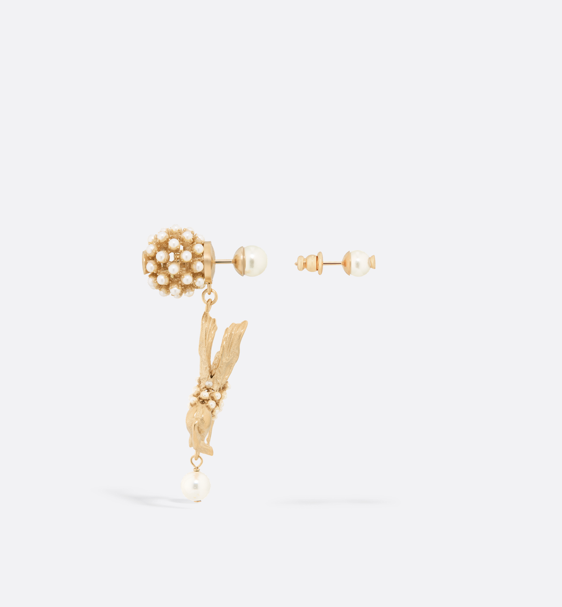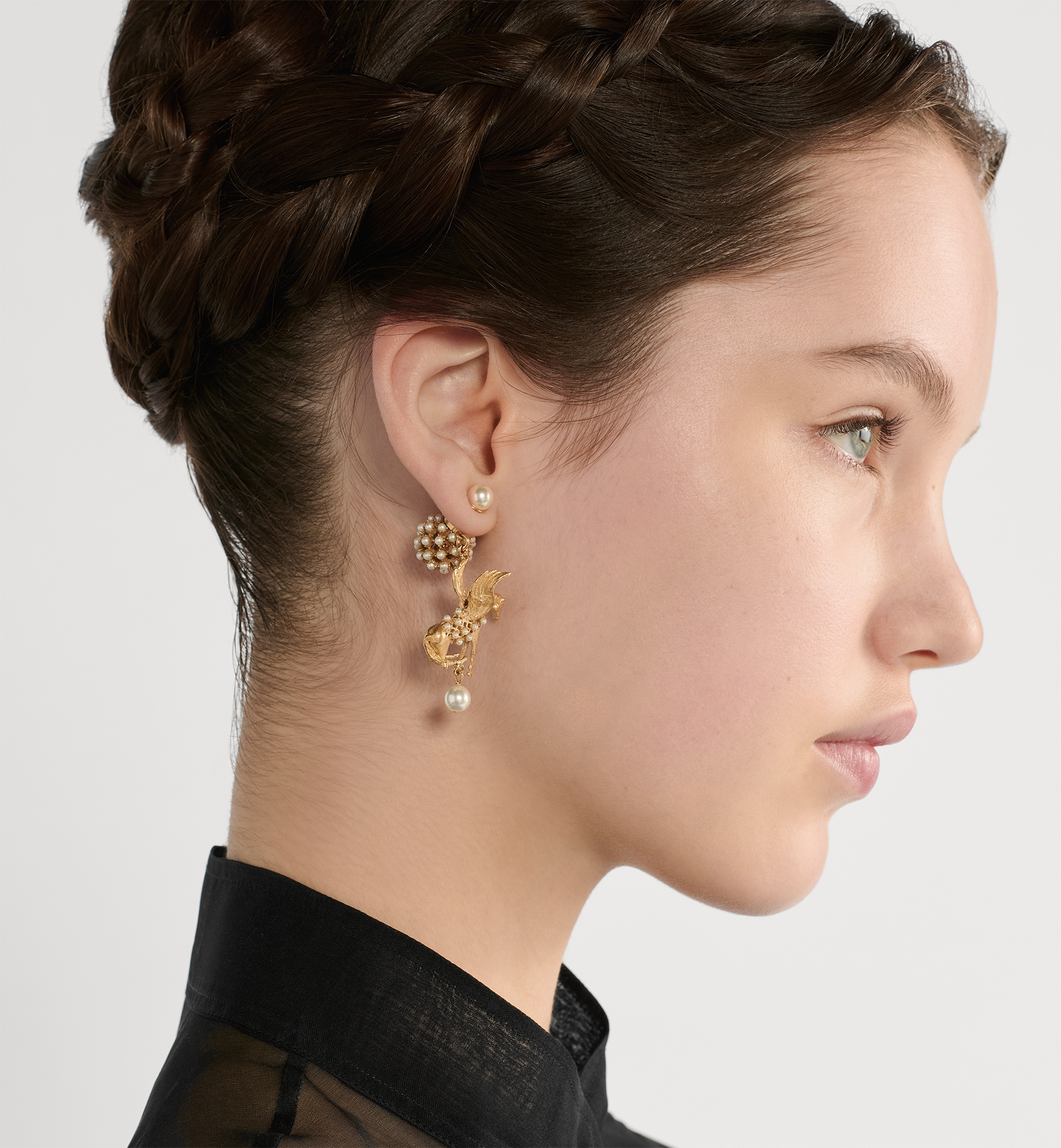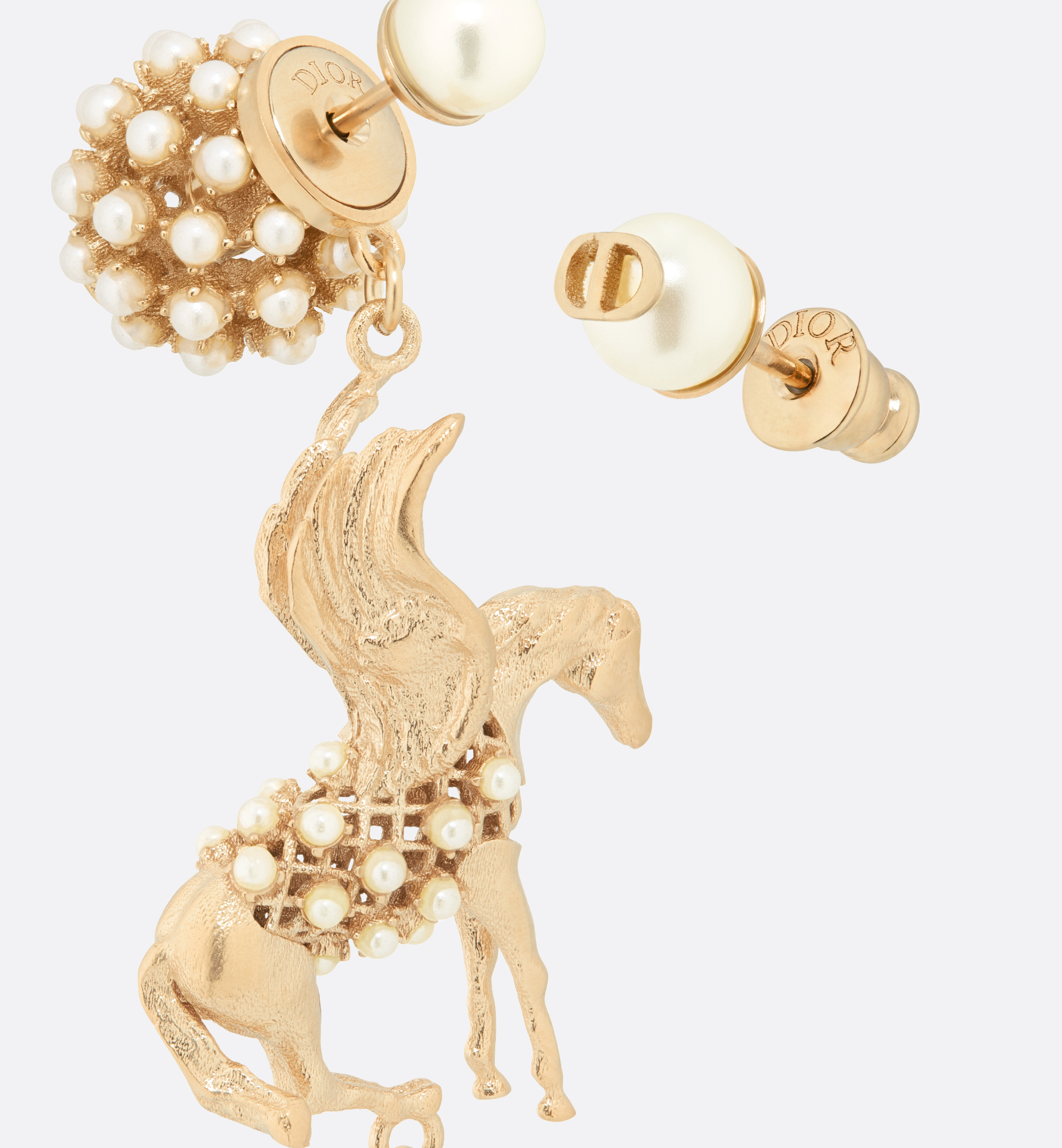 Unveiled at the Cruise 2026 Fashion Show, the Dior Tribales earrings channel the whimsical and theatrical energy of Rome. The asymmetrical design is distinguished on one side by the hallmark pearl, pavé-set in the back with small white resin pearls and accompanied by a finely carved gold-finish metal winged horse with white resin pearls. The other side takes the form of a stud earring with a white resin pearl featuring the CD signature. The exceptional earrings can be paired with other creations from the Dior Arabesque line. White resin pearls. CD signature. Winged horse charm. Gold-finish metal. Integrated clasp on the rear pearl. Sold as a pair. Made in Italy