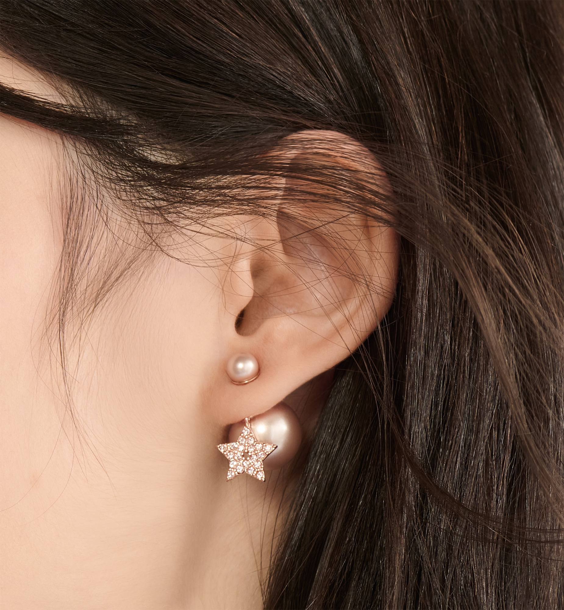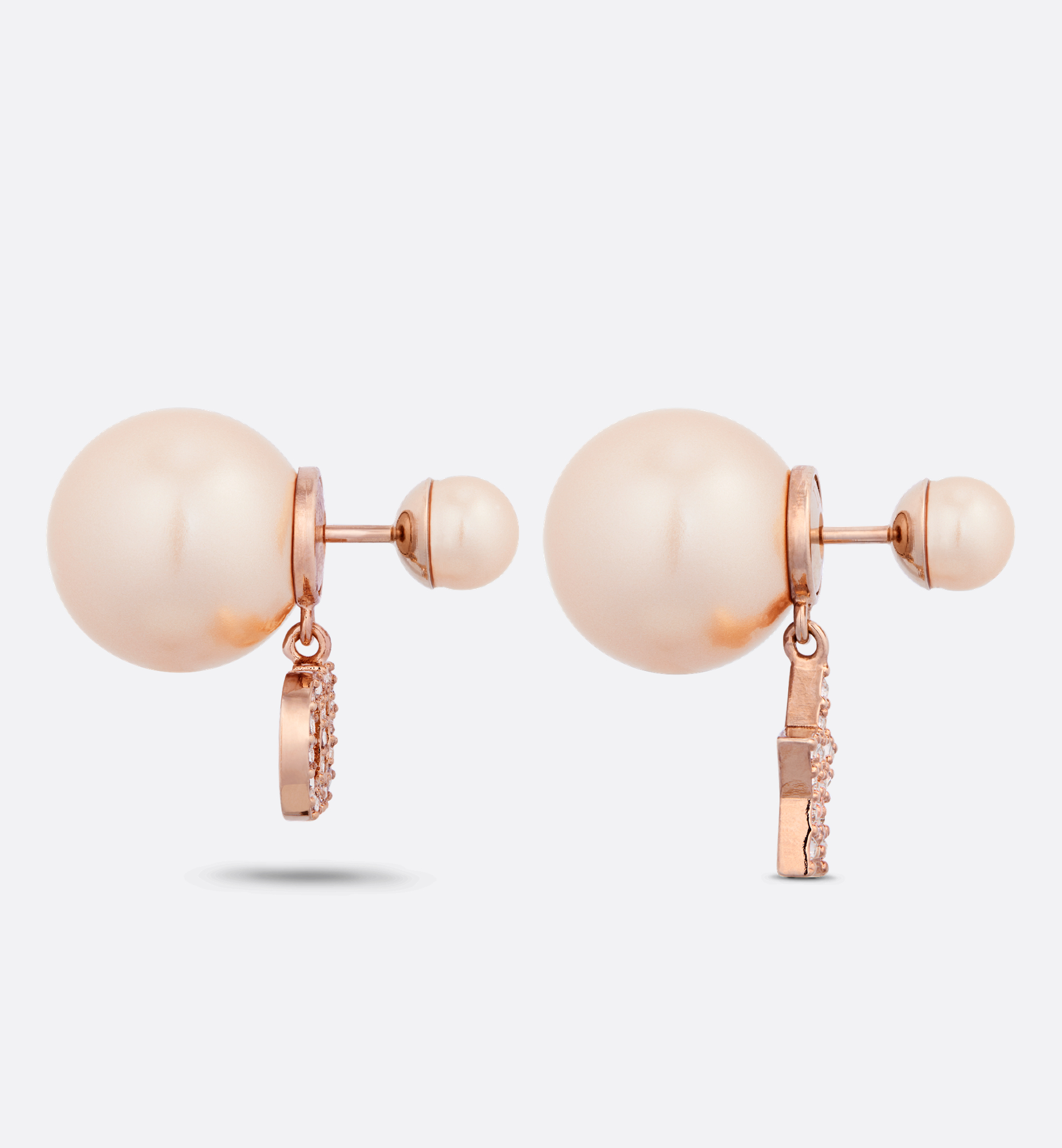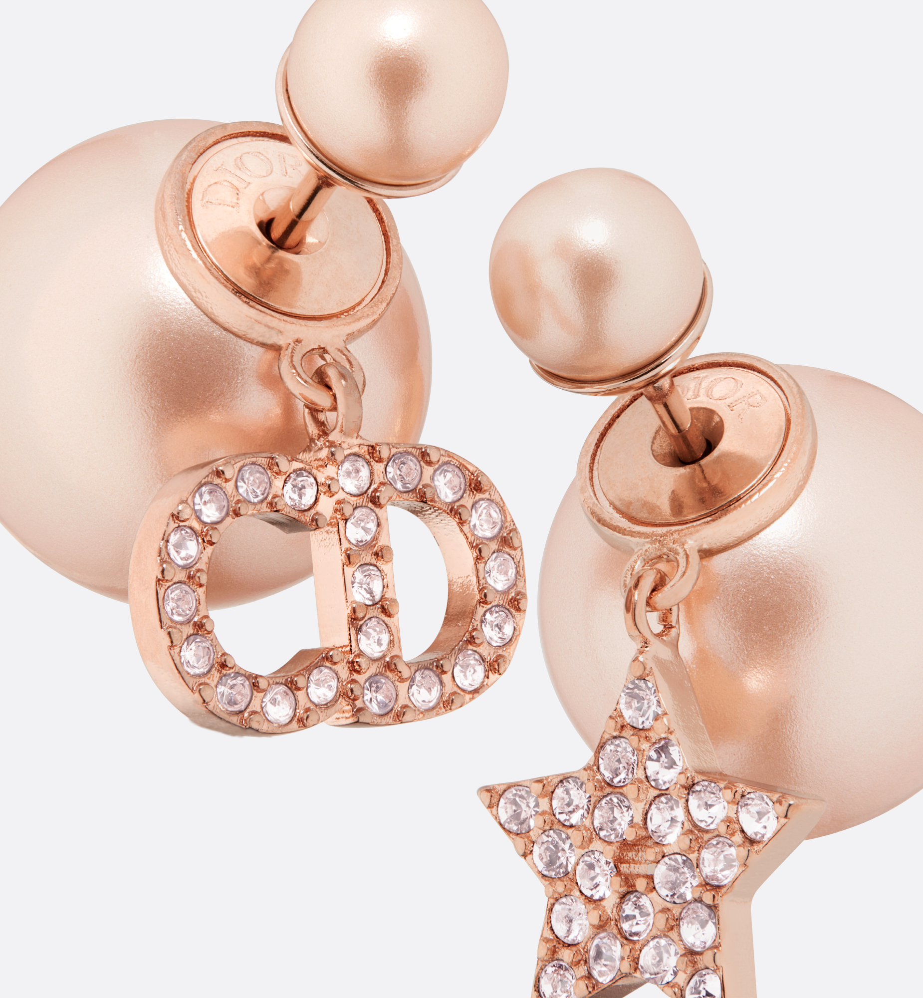 The Dior Tribales earrings are an iconic and modern style featuring two hallmark resin pearls. The asymmetric pair features a star on one rear pearl, and the CD initials on the other, both in a pavé of crystals with pink reflections. The front and the back may be mixed and matched with other Dior Tribales pieces, creating infinite possible looks. Pink resin pearls. Pink crystals. CD and star charms. Pink-finish metal. Integrated clasp on the rear pearl. Sold as a pair. Made in Germany