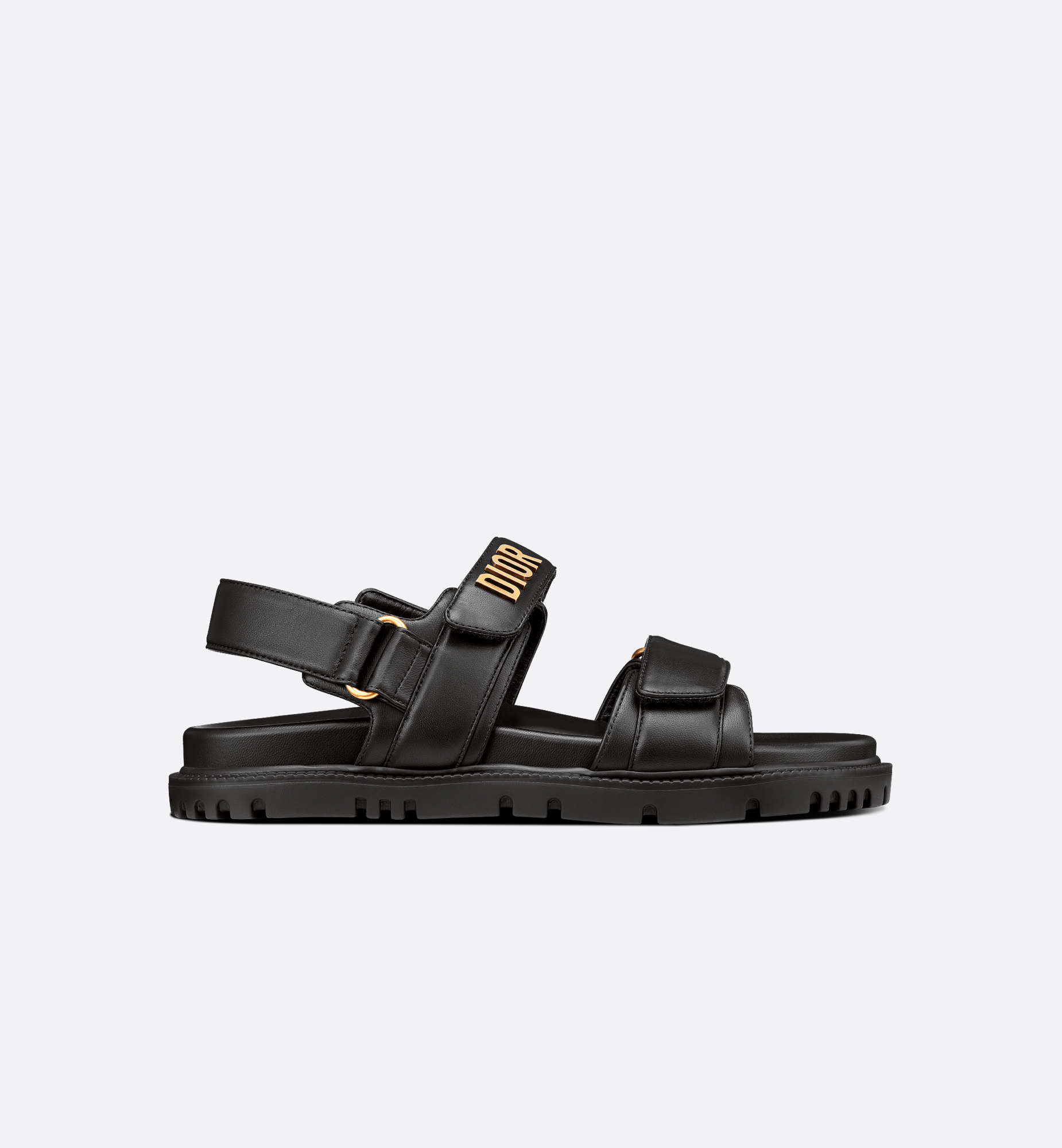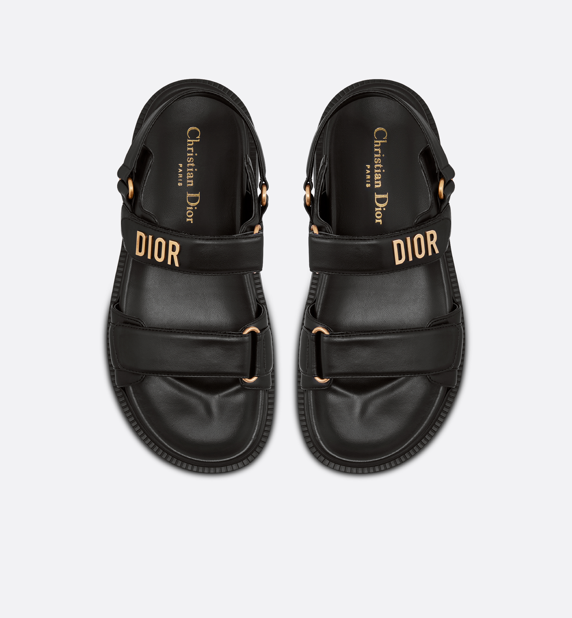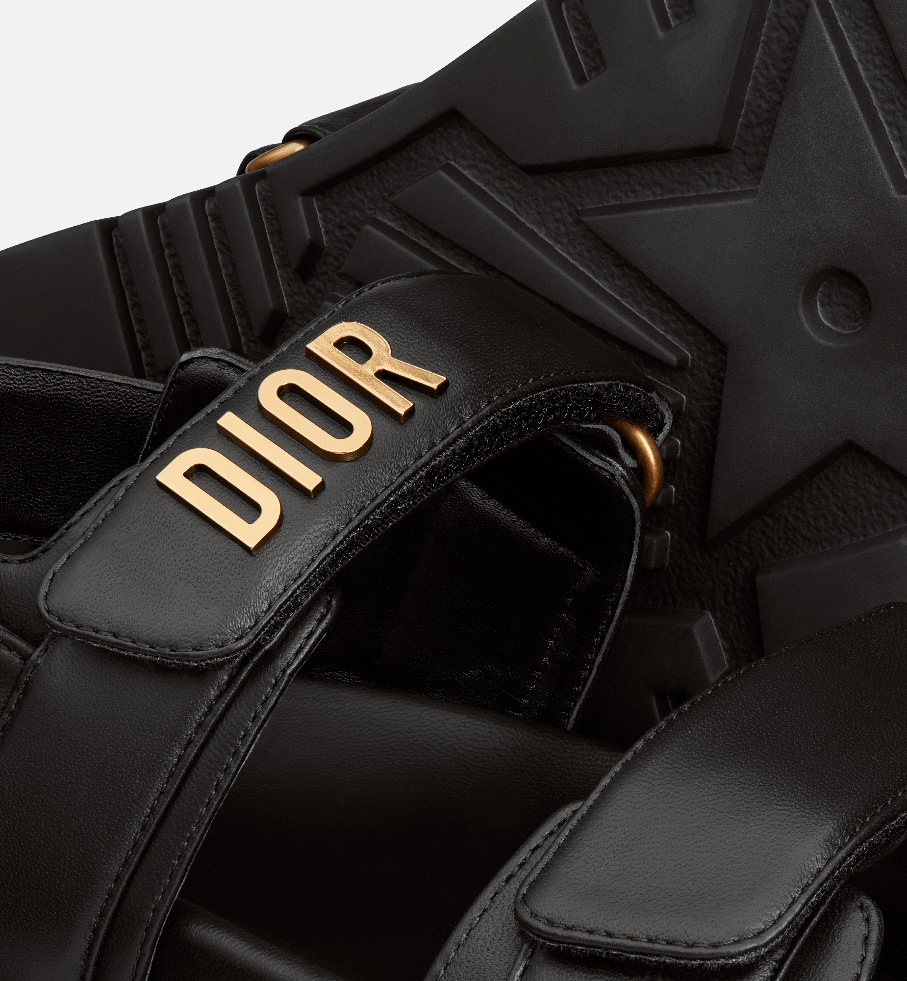 The black lambskin Dioract sandal showcases a modern silhouette. The style features an anatomically shaped insole made with ultralightweight and comfortable leather. Self-fastening straps further enhanced by a gold-finish metal Dior signature on the upper band complete the design. The sandal will lend a contemporary touch to any look. Main composition: lambskin, brass and zamak. Lambskin lining. Gold-finish metal Dior signature. Two adjustable self-fastening straps. Anatomically shaped leather insole. Rubber sole with star, Christian Dior’s lucky symbol. Made in Italy