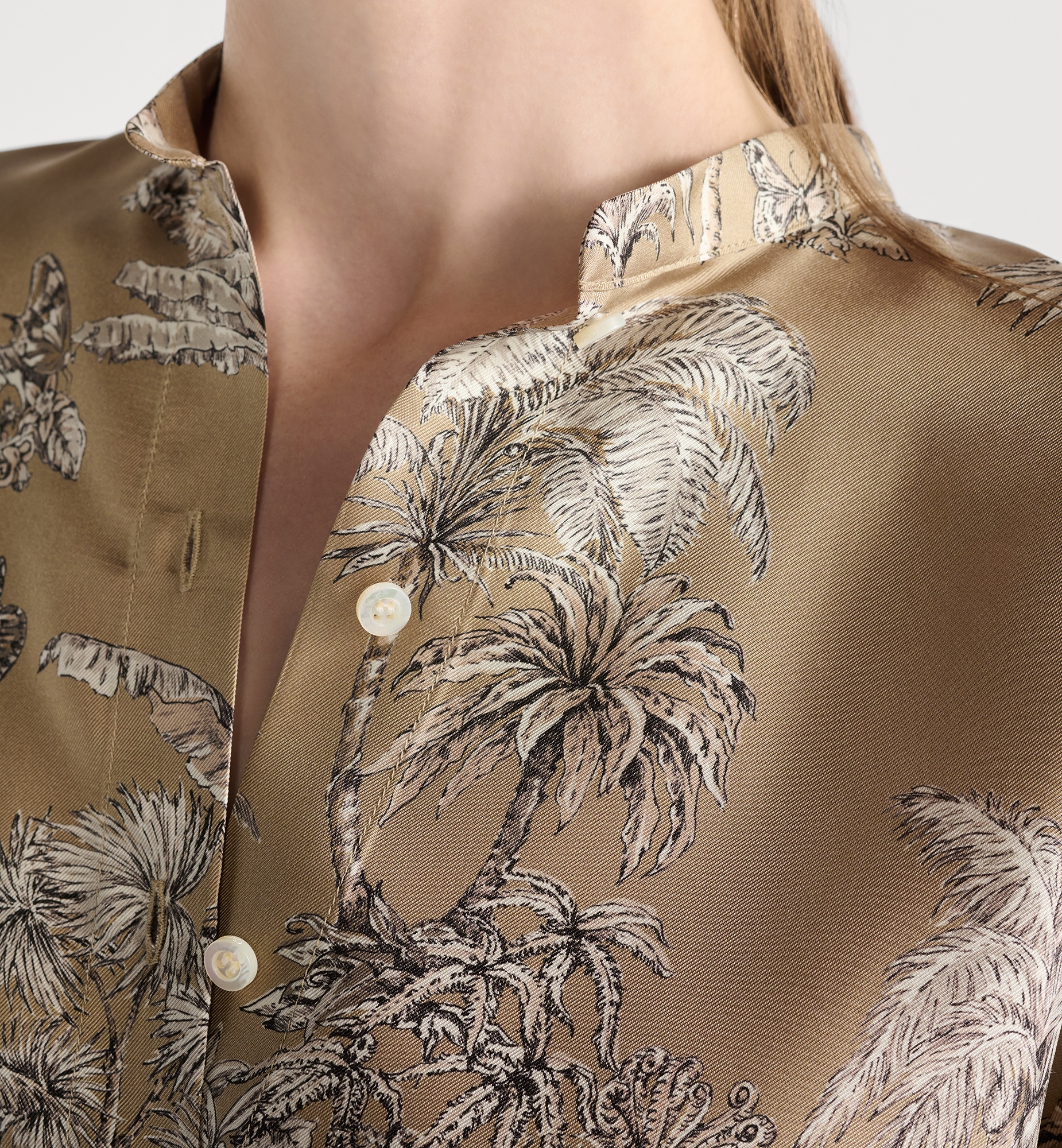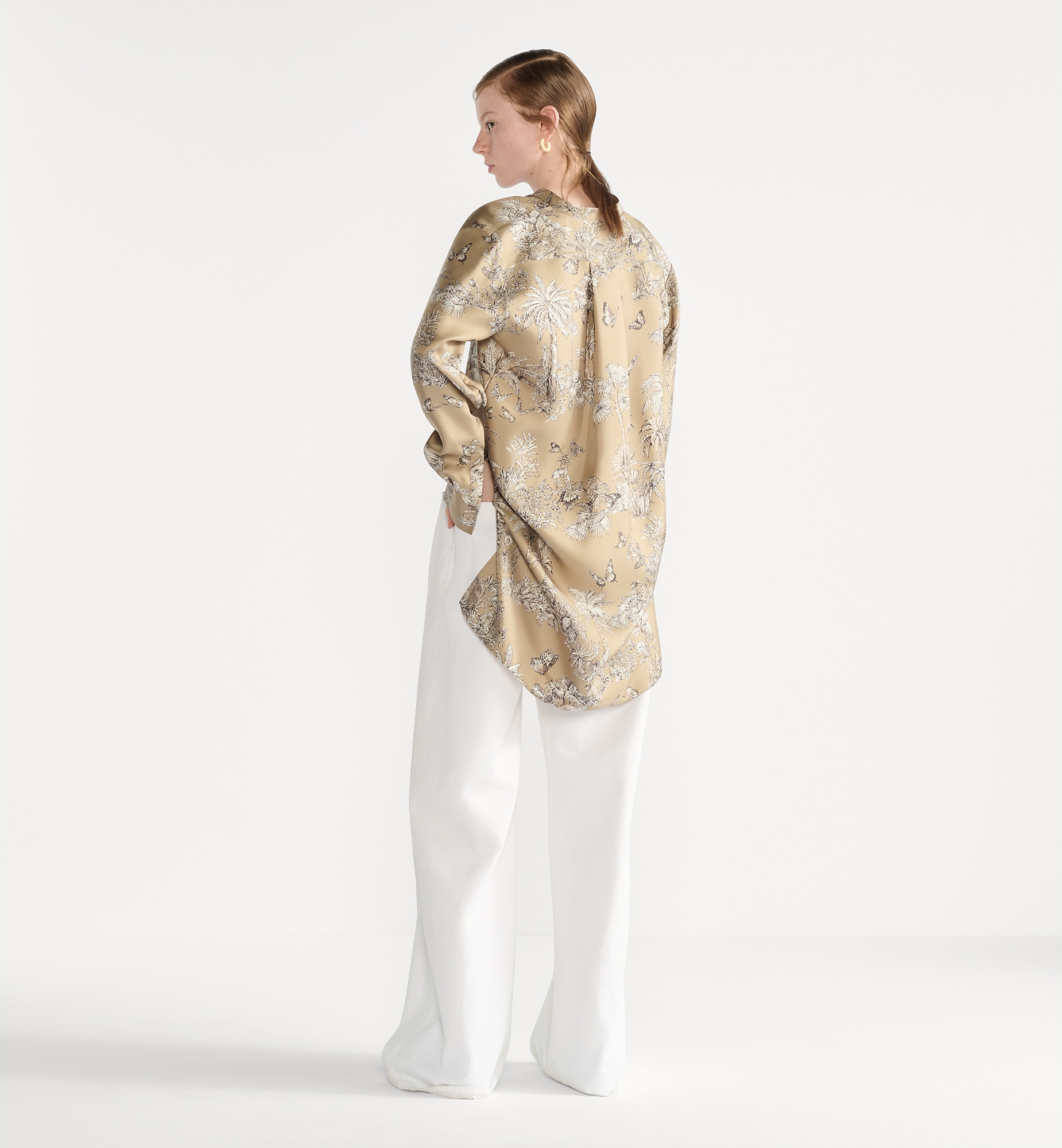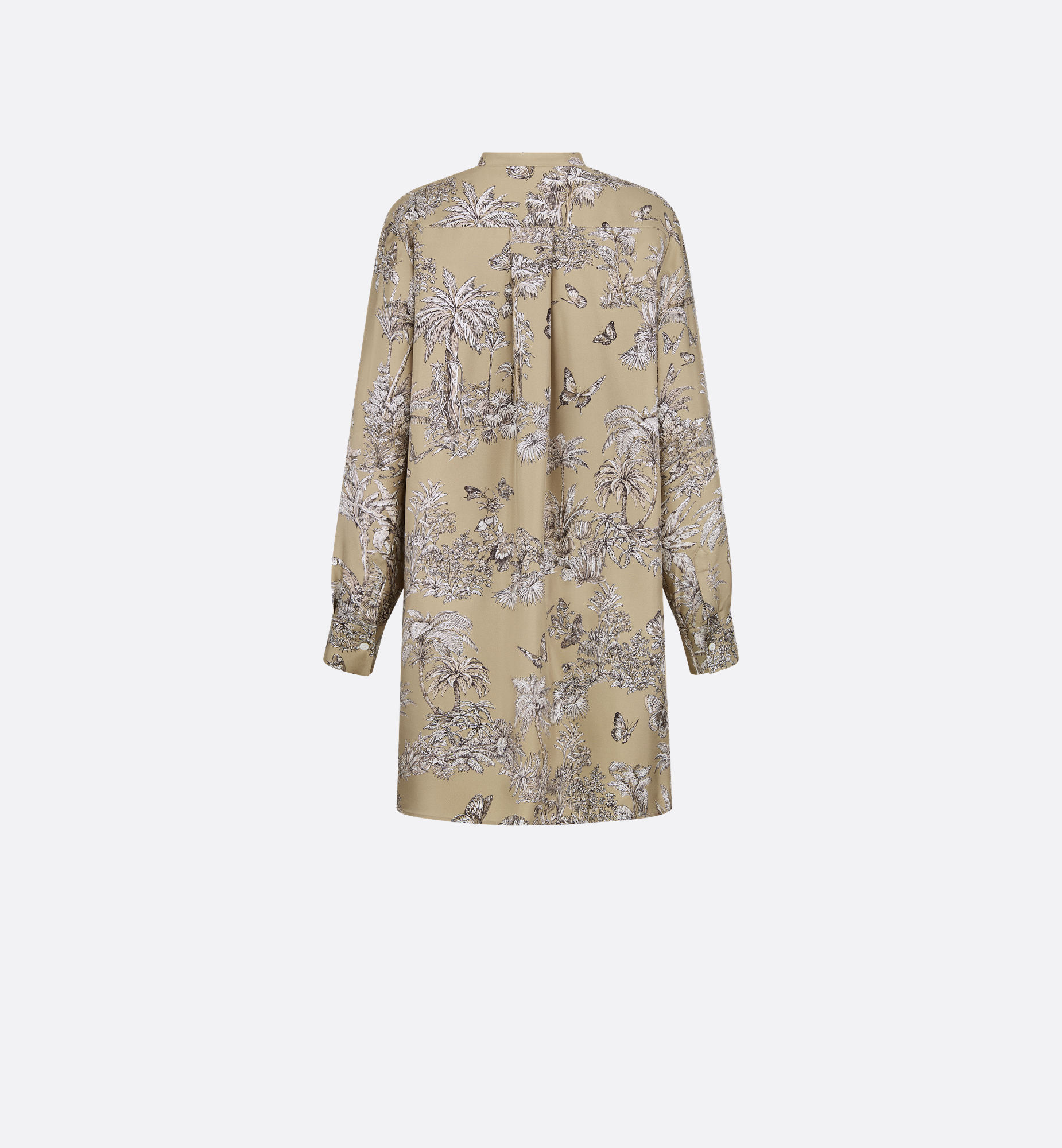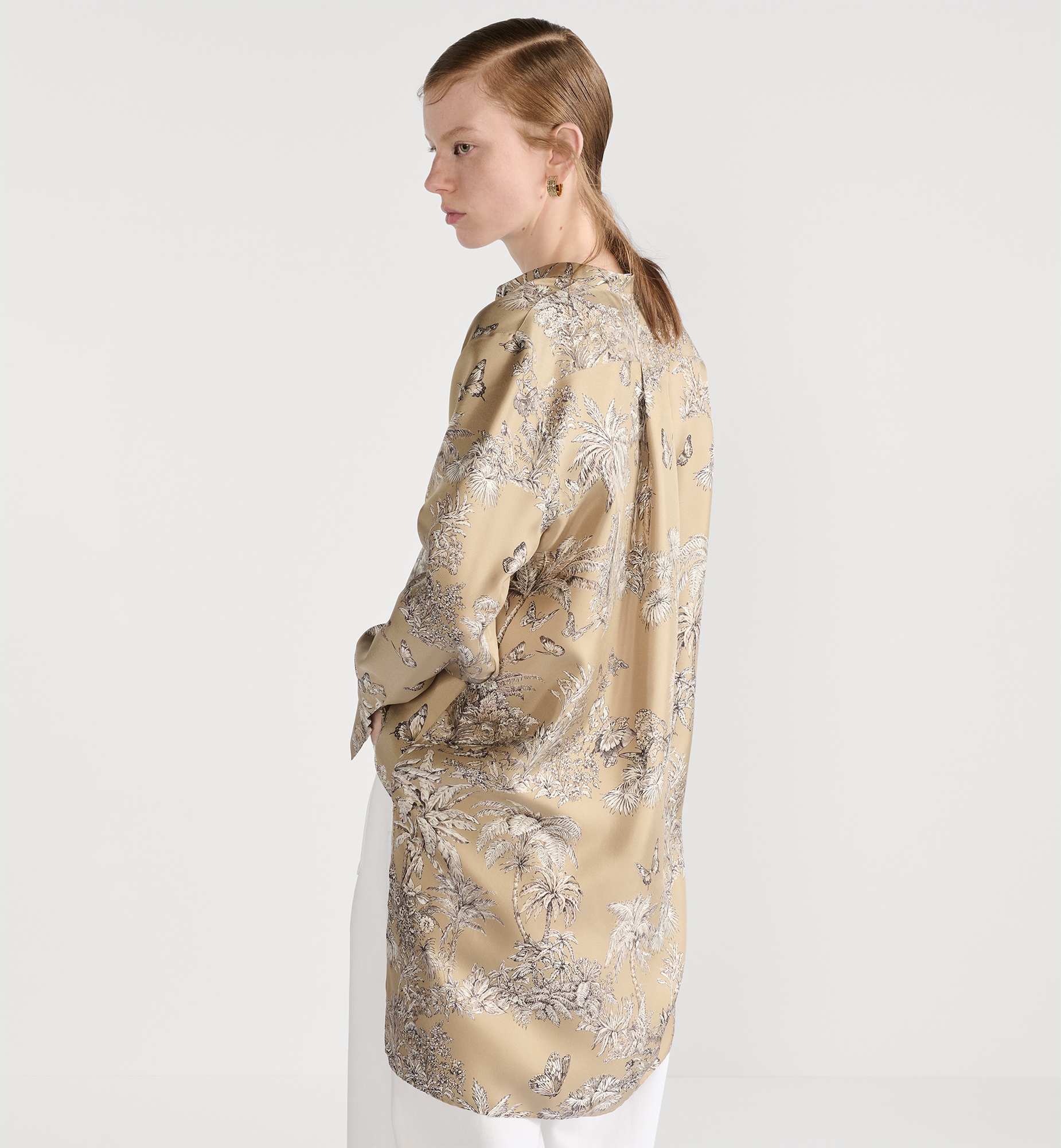 Part of the Dioriviera capsule, the blouse showcases Pietro Ruffo’s hazelnut and white Toile de Jouy Palms motif, capturing the beauty of nature with a vibrant jungle scene populated by diverse wildlife. Crafted in silk twill, it features a modern silhouette that is longer in the back, an officer collar and a front button closure. The blouse can be coordinated with other Toile de Jouy Palms creations to complete a Dioriviera look. Embroidered hallmark bee and CD signature. Buttoned collar and cuffs. Christian Dior Paris mother-of-pearl buttons. Unlined. 100% silk. Made in Italy
