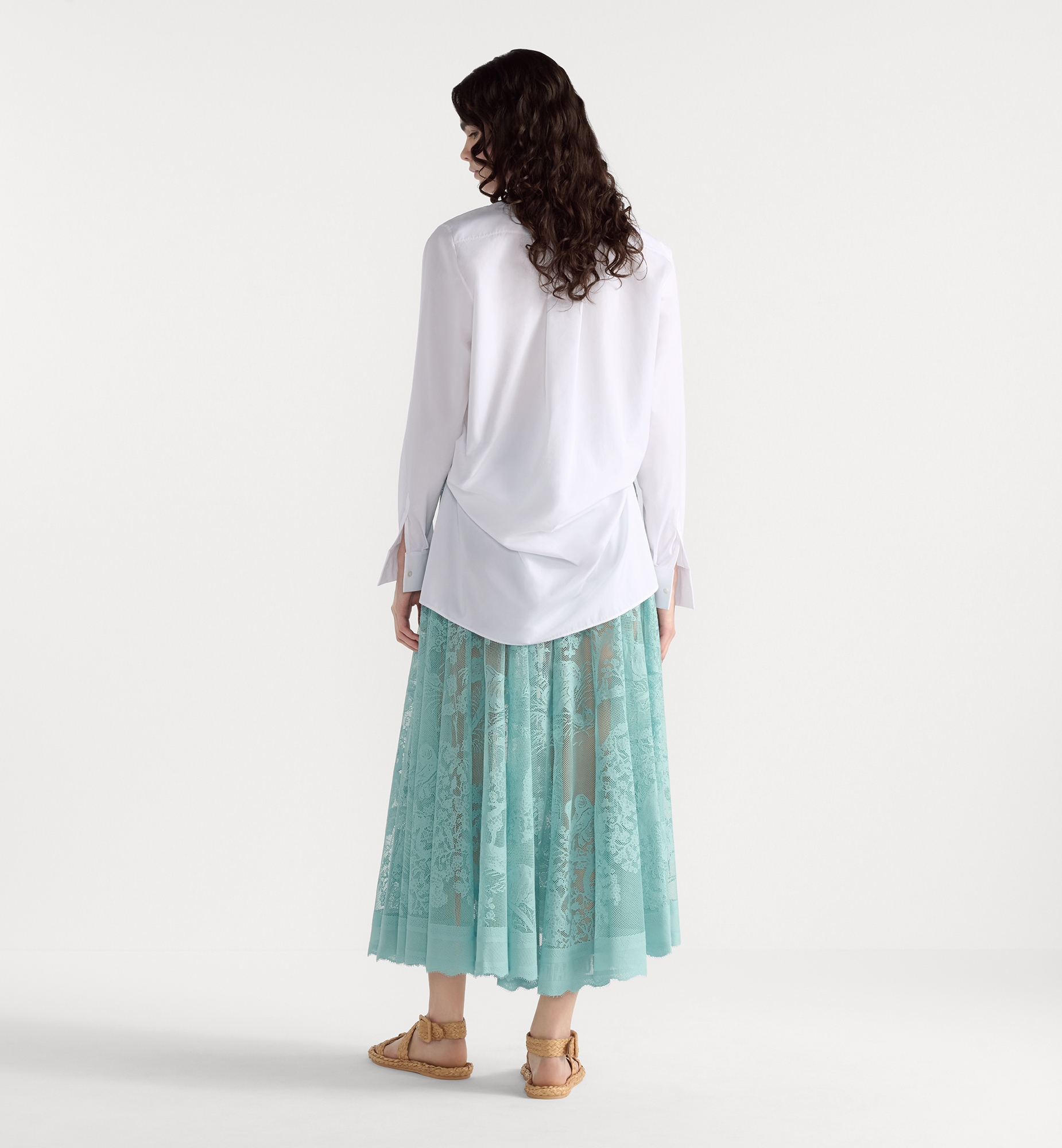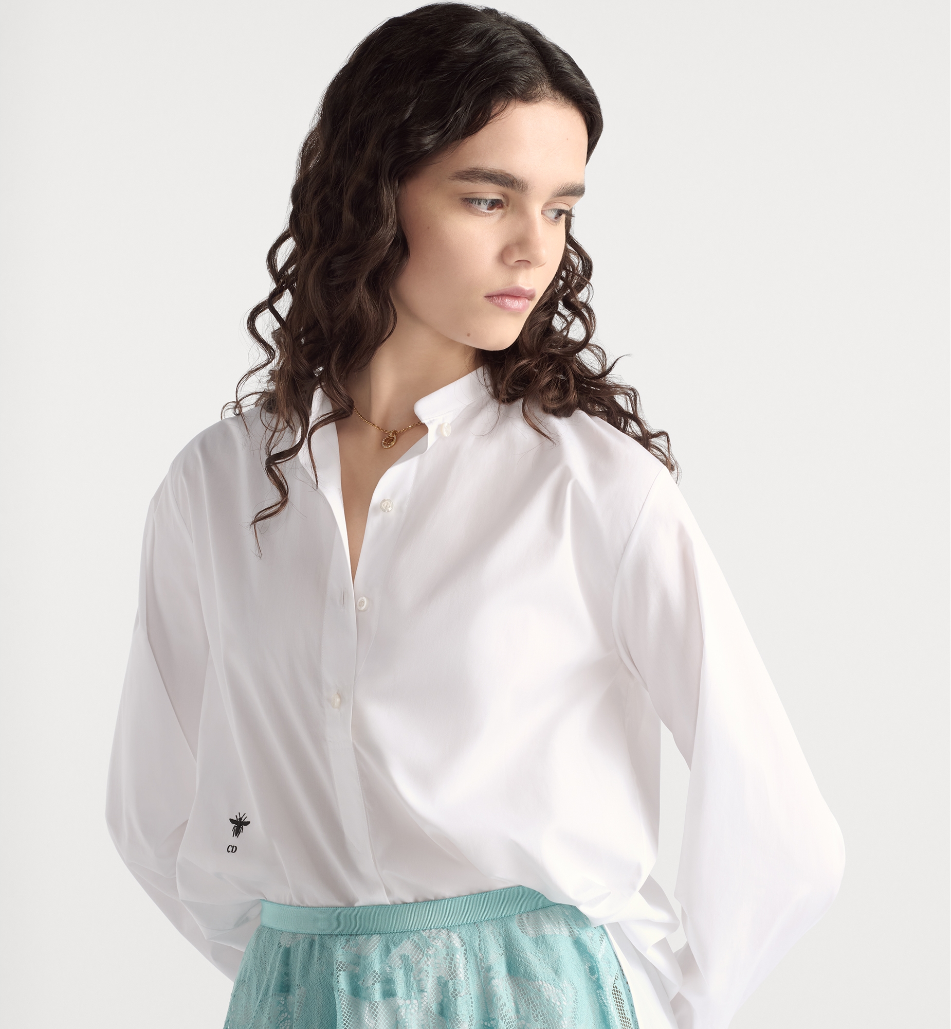 Part of the Dioriviera capsule and an essential Dior silhouette, the blouse is reimagined with a modern and comfortable style. Crafted in white cotton poplin, it is distinguished by a collarless design and a longer hem in the back. The long-sleeved blouse can be coordinated with other Dioriviera creations. Embroidered hallmark bee and CD signature. Buttoned collar and cuffs. Christian Dior Paris mother-of-pearl buttons. Unlined. 100% cotton. Made in Italy