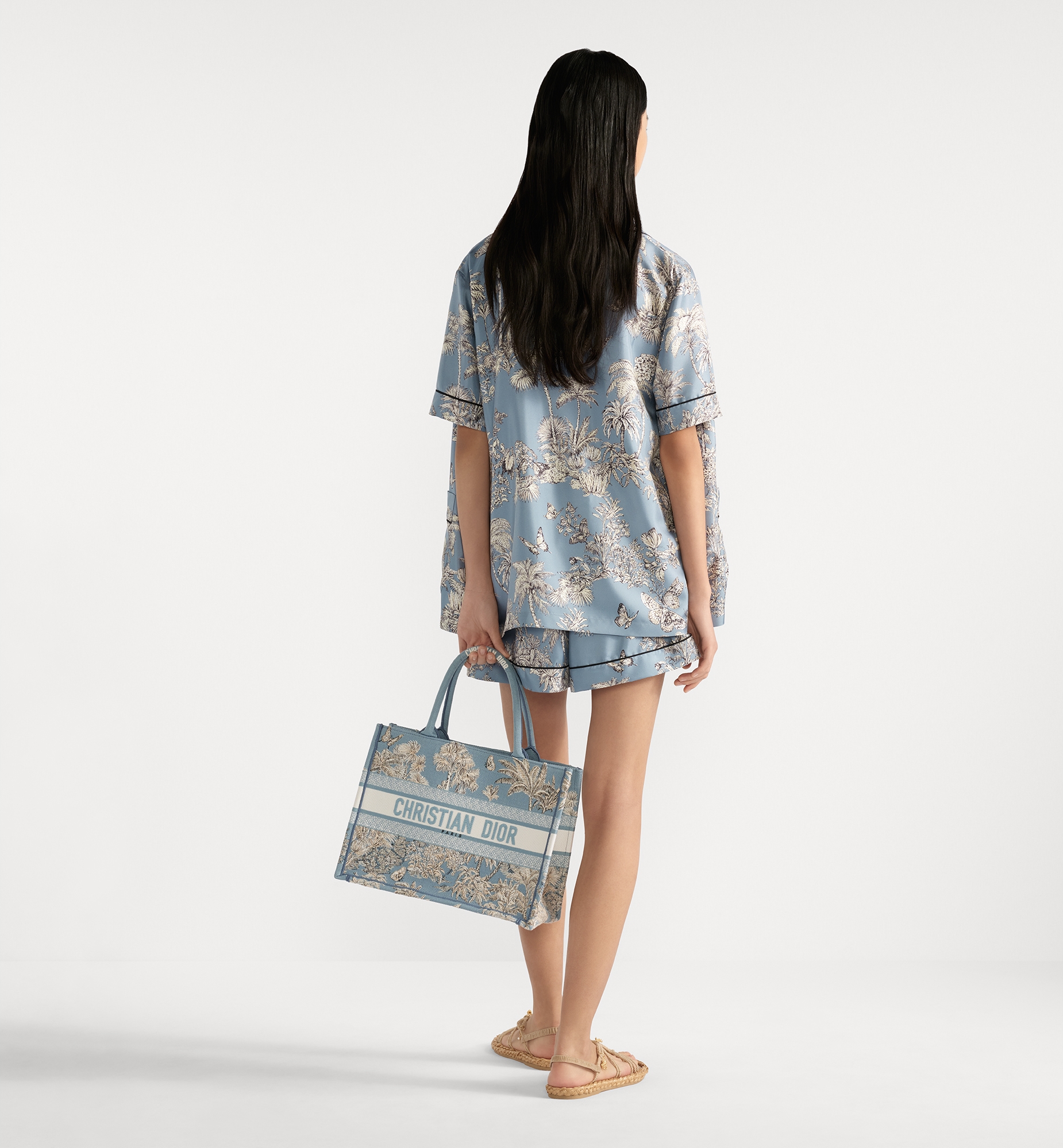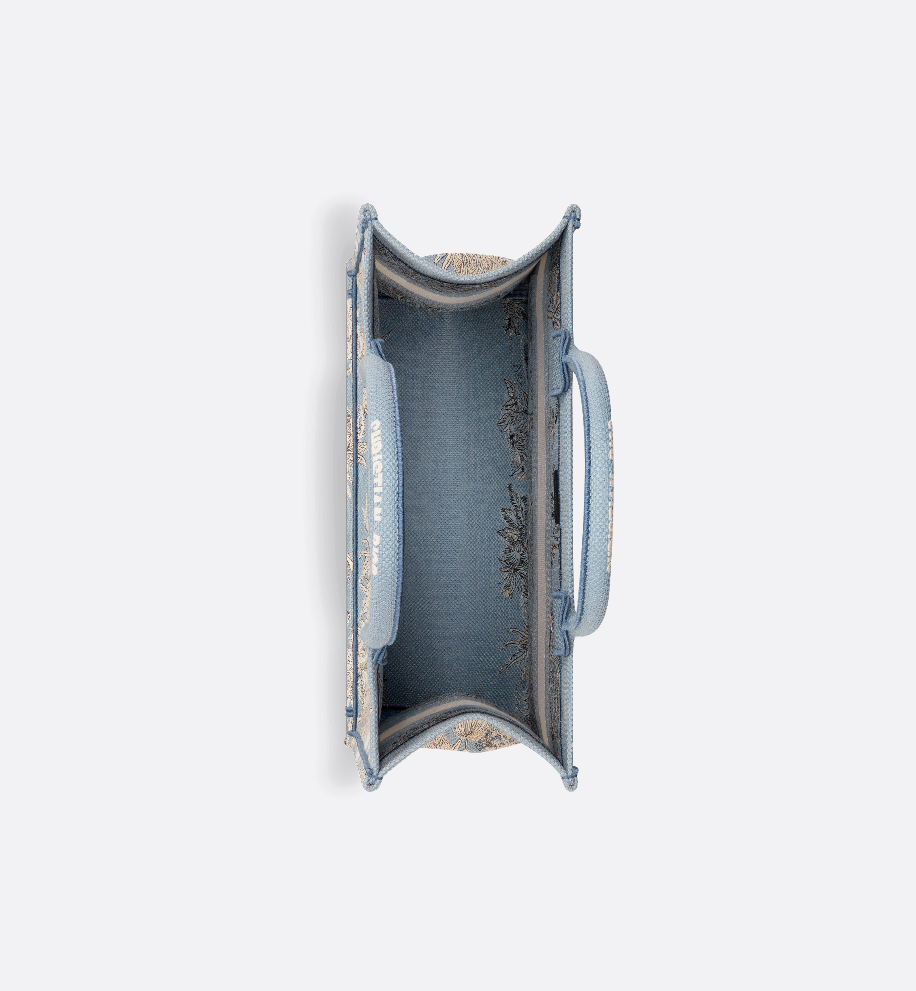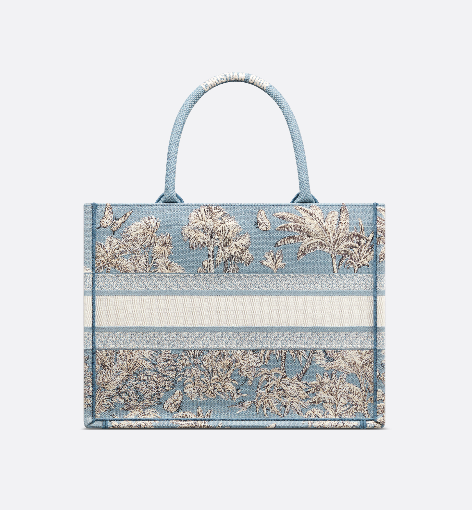 Part of the Dioriviera capsule, the Dior Book Tote is an original creation introduced by Christian Dior’s Creative Director, Maria Grazia Chiuri, and has become a staple of the Dior aesthetic. Designed to hold all the daily essentials, it is fully embroidered with Pietro Ruffo’s celestial blue Toile de Jouy Palms motif, capturing the beauty of nature with a vibrant jungle scene populated by diverse wildlife. Adorned with the Christian Dior Paris signature on the front, the medium tote exemplifies the House’s signature savoir-faire and may be carried by hand or over the shoulder, as well as coordinated with other Dioriviera creations. Main composition: cotton. Christian Dior Paris signature on the front. Dust bag included. Made in Italy
