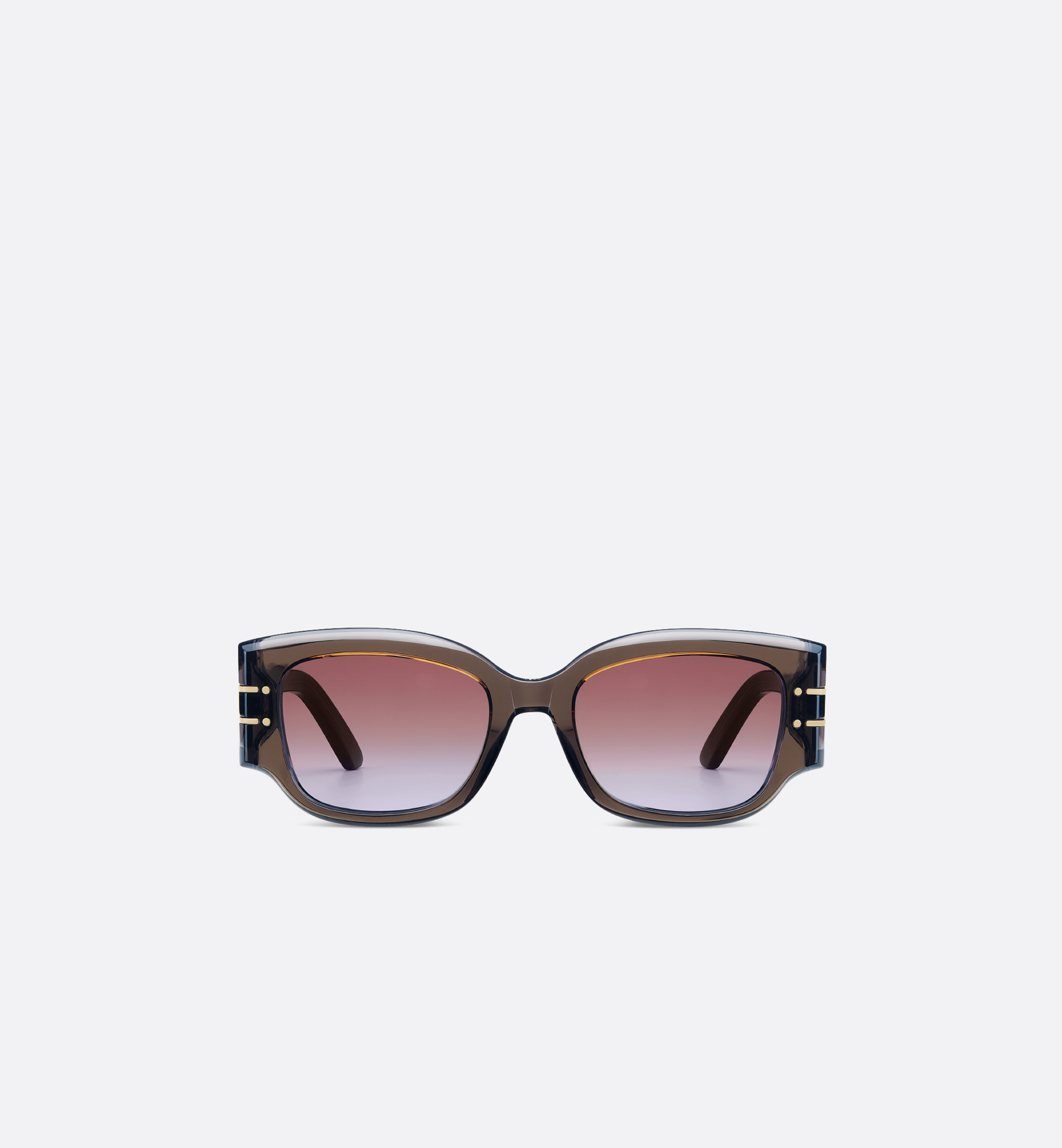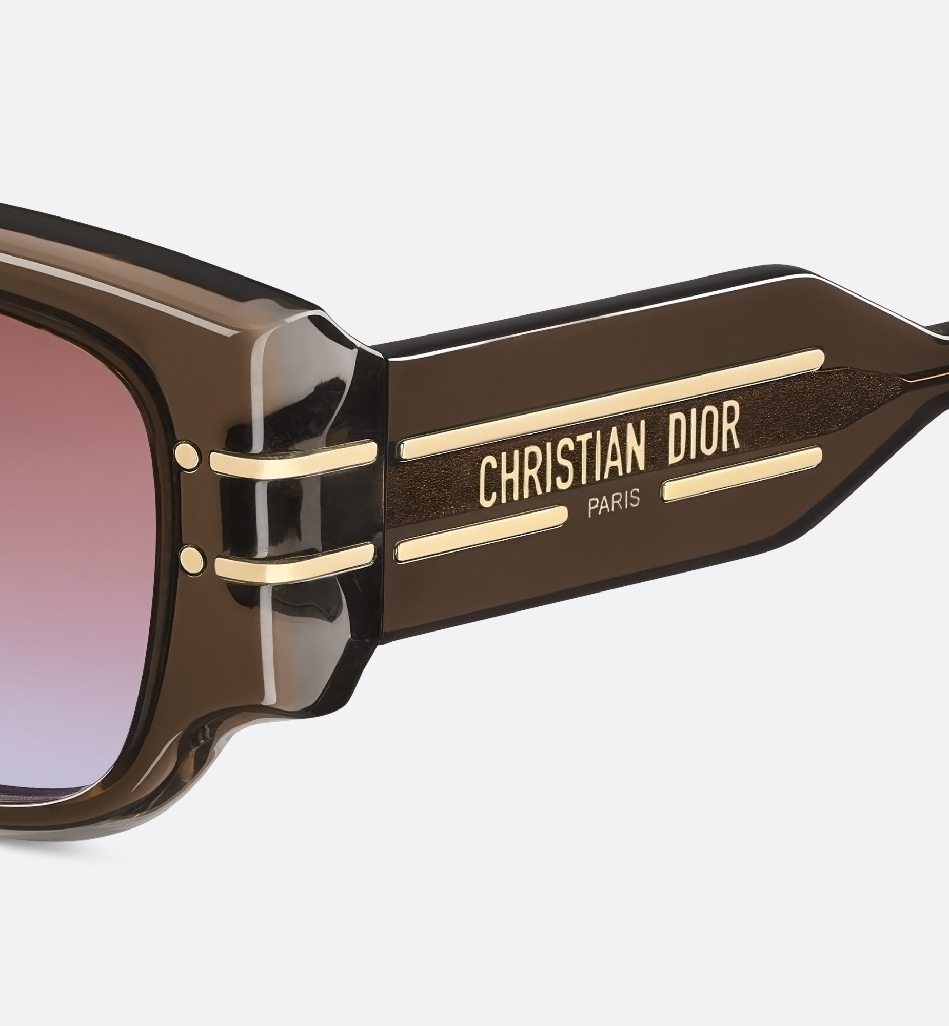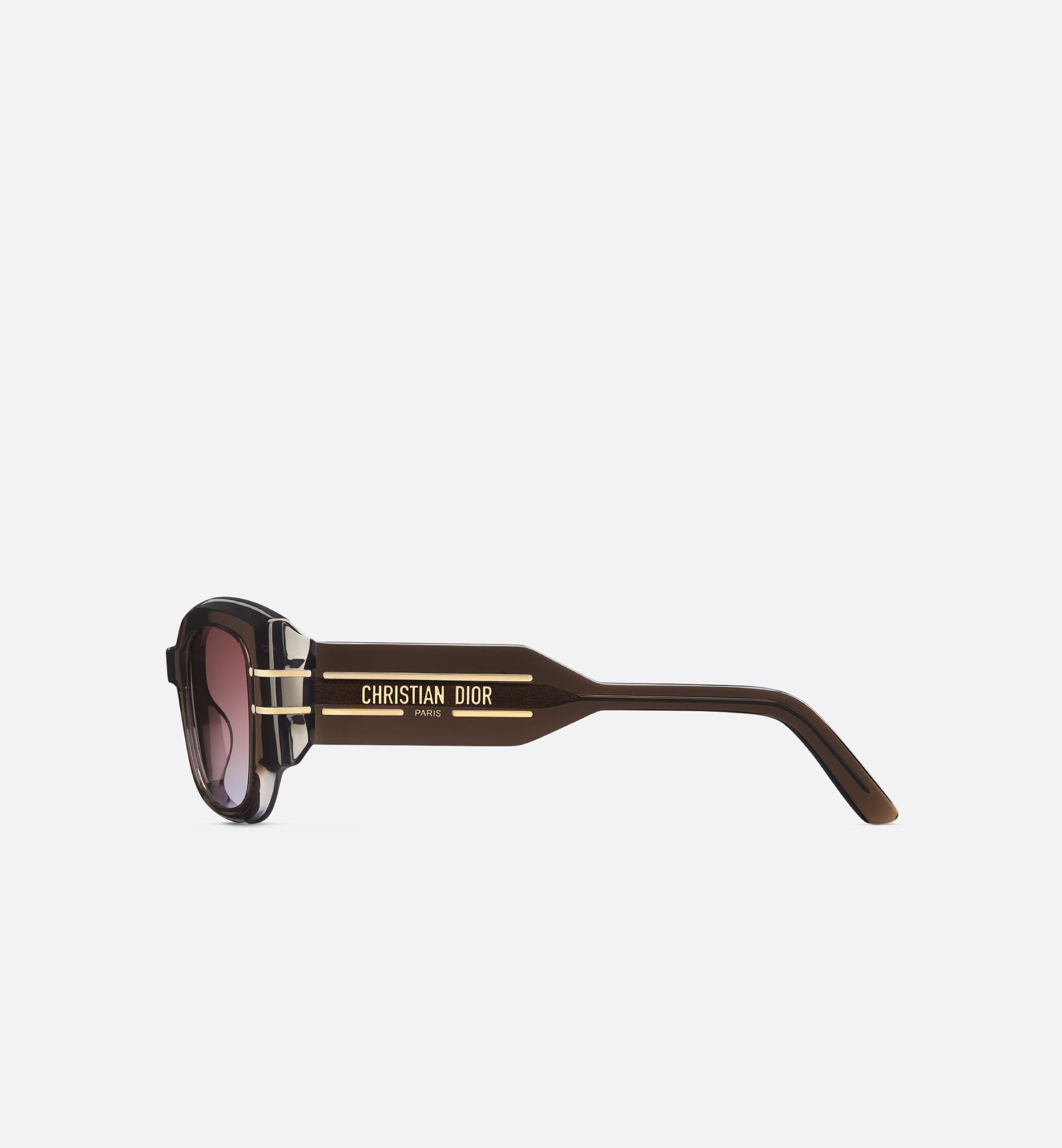 The DiorSignature S13I sunglasses enhance the iconic House line. The elegant design is distinguished by a contemporary square shape. The graphic frame in transparent brown acetate showcases the Christian Dior Paris signature set between gold-finish metal lines. Completed by brown-to-indigo gradient lenses, the modern sunglasses will lend a decisively Dior style to any look. Transparent brown acetate frame. Brown-to-indigo gradient lenses. Christian Dior Paris signature on the temples. Gold-tone Christian Dior signature on the right temple interior. 100% UVA/UVB protection. Filter category: 3. Suitable for prescription lenses. Made in Italy