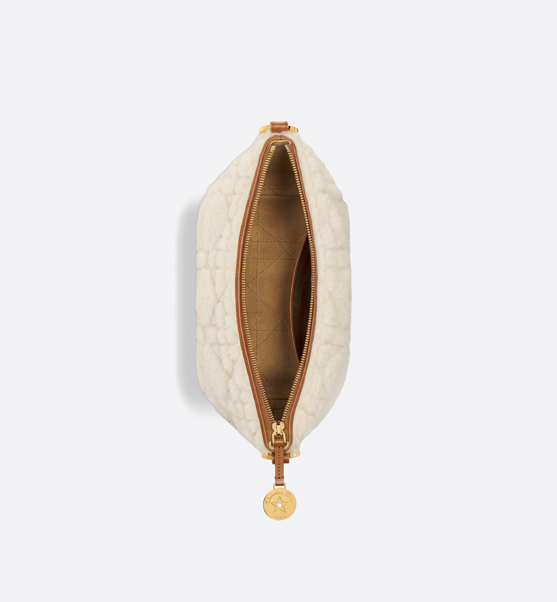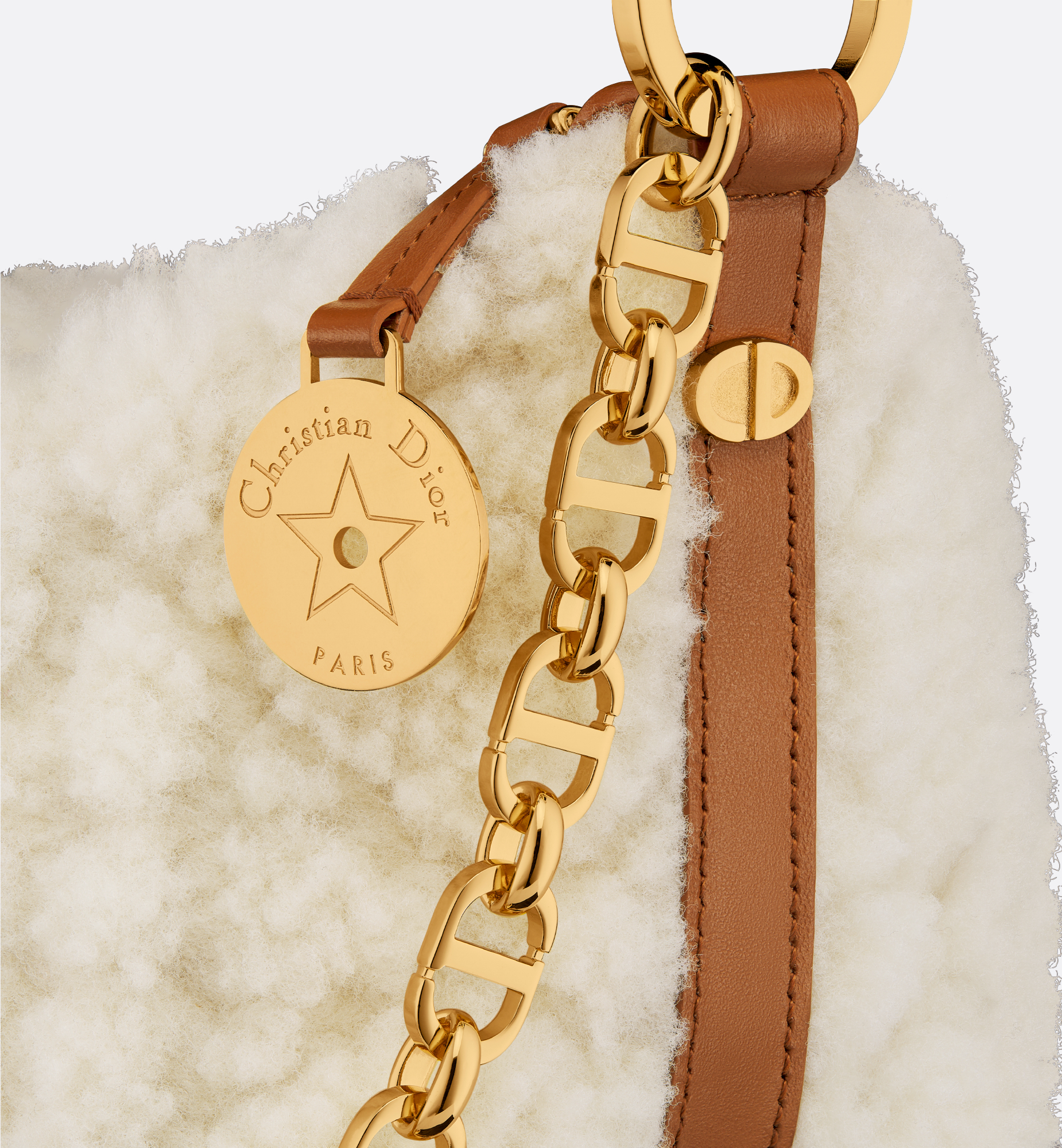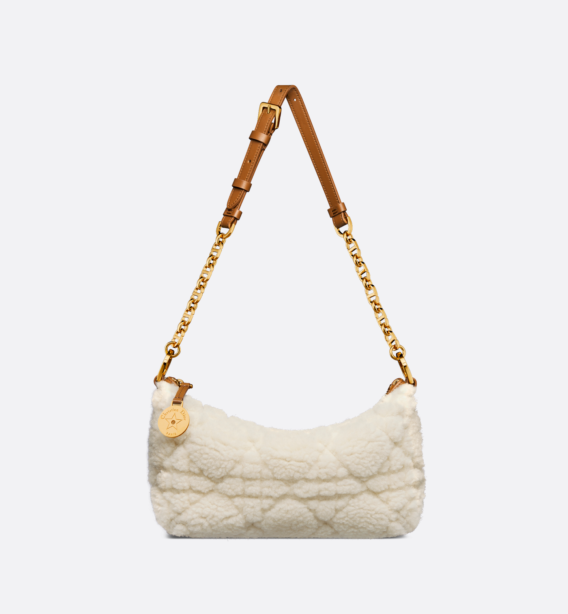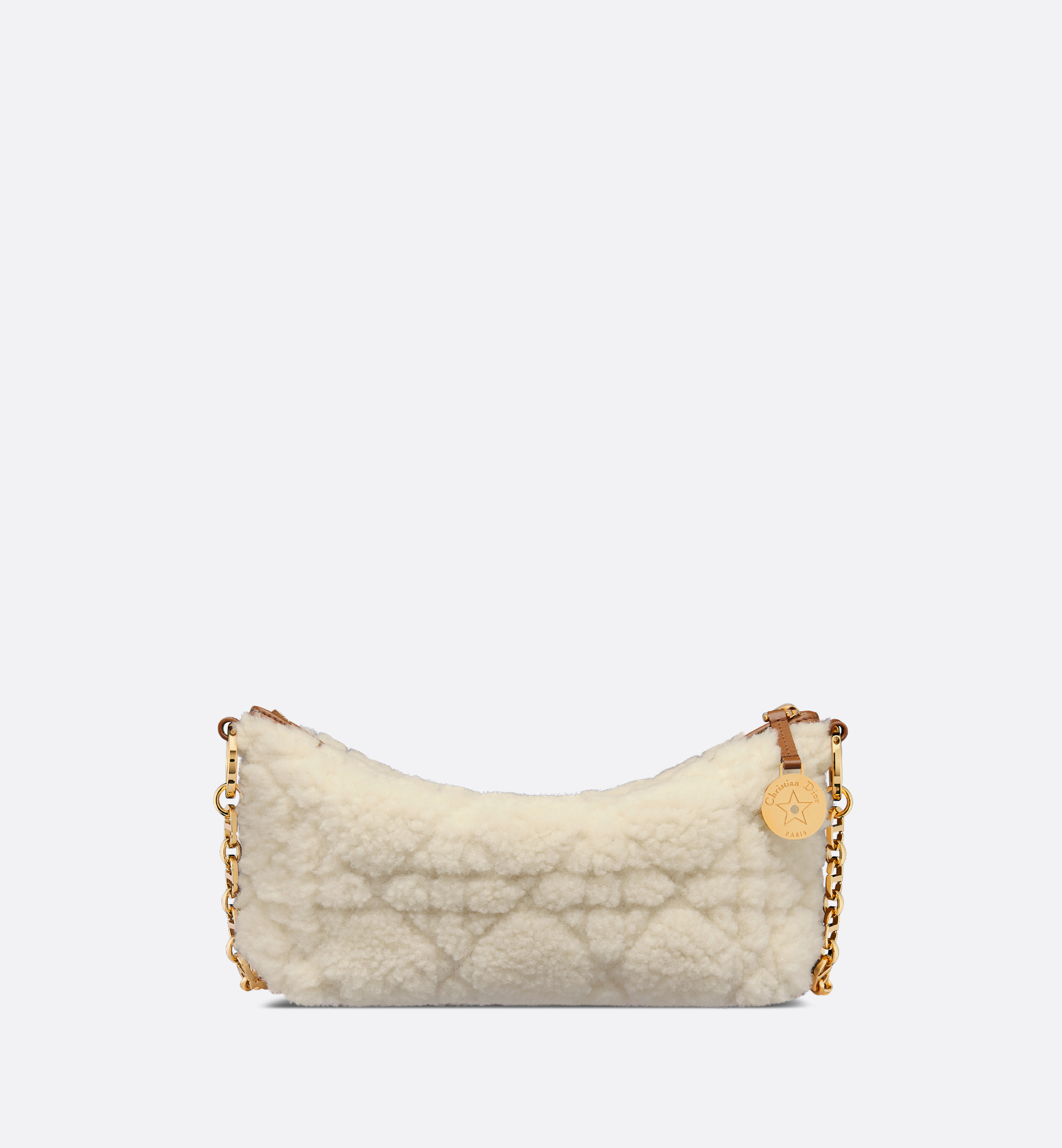 The Diorstar hobo bag with chain has a practical, modern look. Crafted in ecru lambskin shearling with Cannage stitching, it features a supple silhouette and spacious compartment. Its design is enhanced by a zip closure embellished with a medallion engraved with the Christian Dior Paris signature and a star, the House’s flagship symbol, while discreet CD studs adorn the sides. The interior includes card slots, while a leather insert on the adjustable CD chain link strap allows the bag to be worn comfortably over the shoulder. Main composition: lambskin shearling and calfskin. Lambskin shearling, calfskin and technical fabric lining. Zip closure with medallion engraved with Christian Dior Paris and star. One compartment. One slip pocket. Four card slots. Adjustable chain with antique gold-finish metal CD links and leather insert. Made in Italy