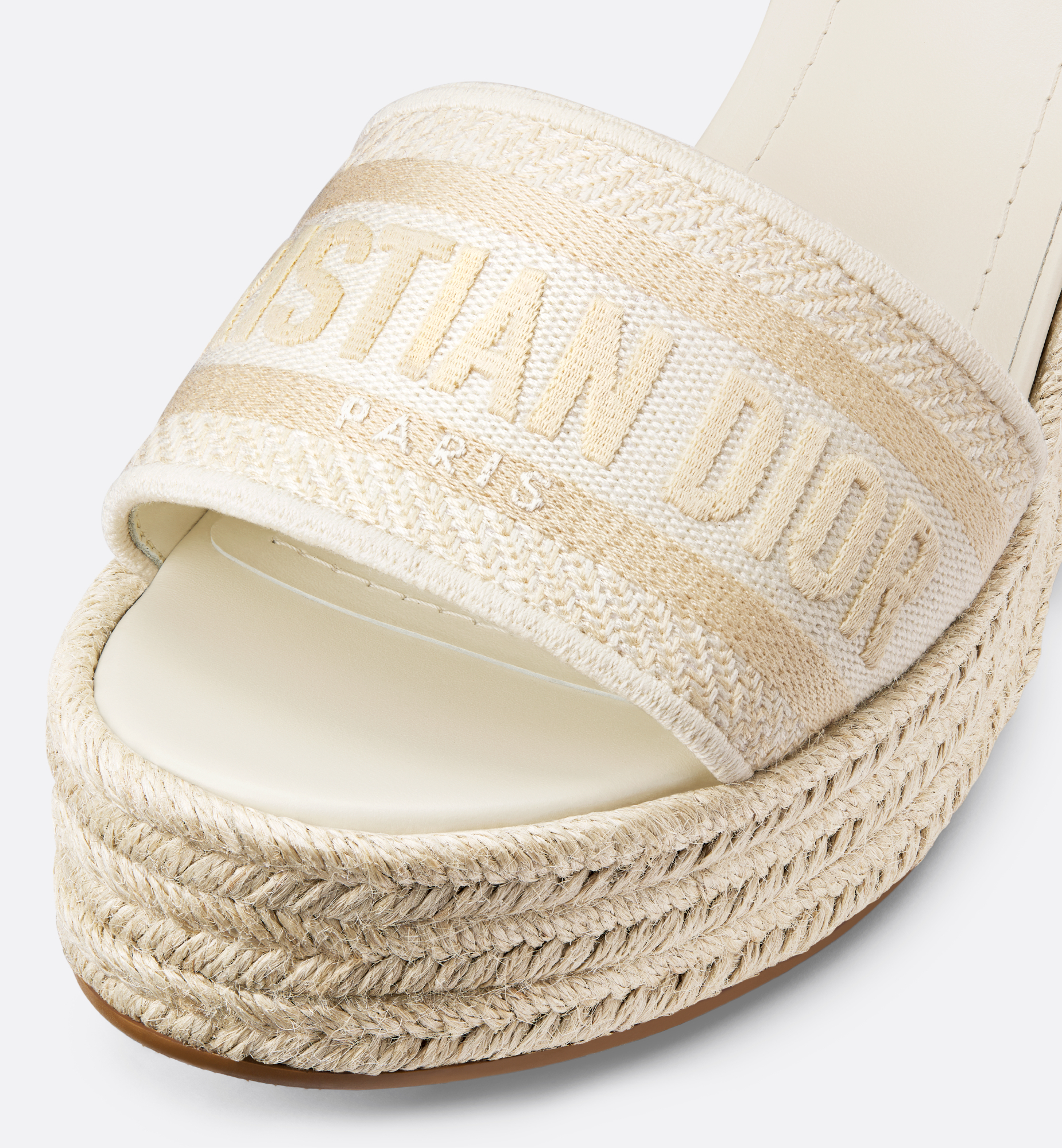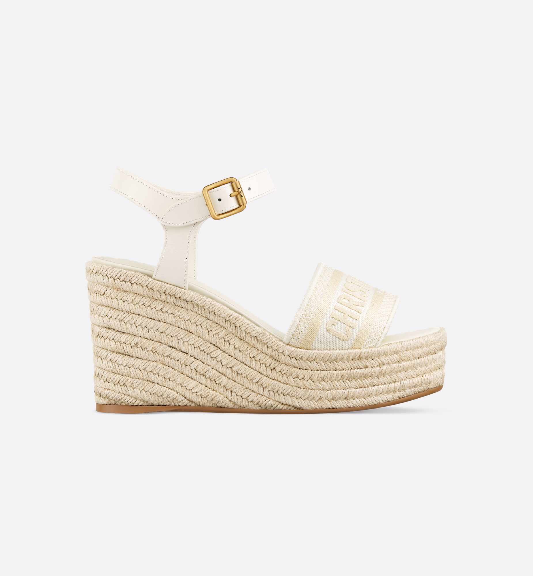 The Dway wedge sandal revisits a hallmark and timeless House design. Embroidered with the Christian Dior Paris signature, the white cotton upper lends an unmistakable touch, while the tonal calfskin adjustable buckled strap delicately accents the ankle. Completed by a 9.5-cm (3.5-inch) wedge heel handmade in a traditional technique, the shoe will elevate any of the season’s looks. Main composition: calfskin, jute and cotton. Lambskin and calfskin lining. Christian Dior Paris signature embroidered on the upper. Adjustable buckled ankle strap. Padded calfskin insole. Rope platform and thin rubber sole with star, Christian Dior’s lucky symbol. Made in Italy