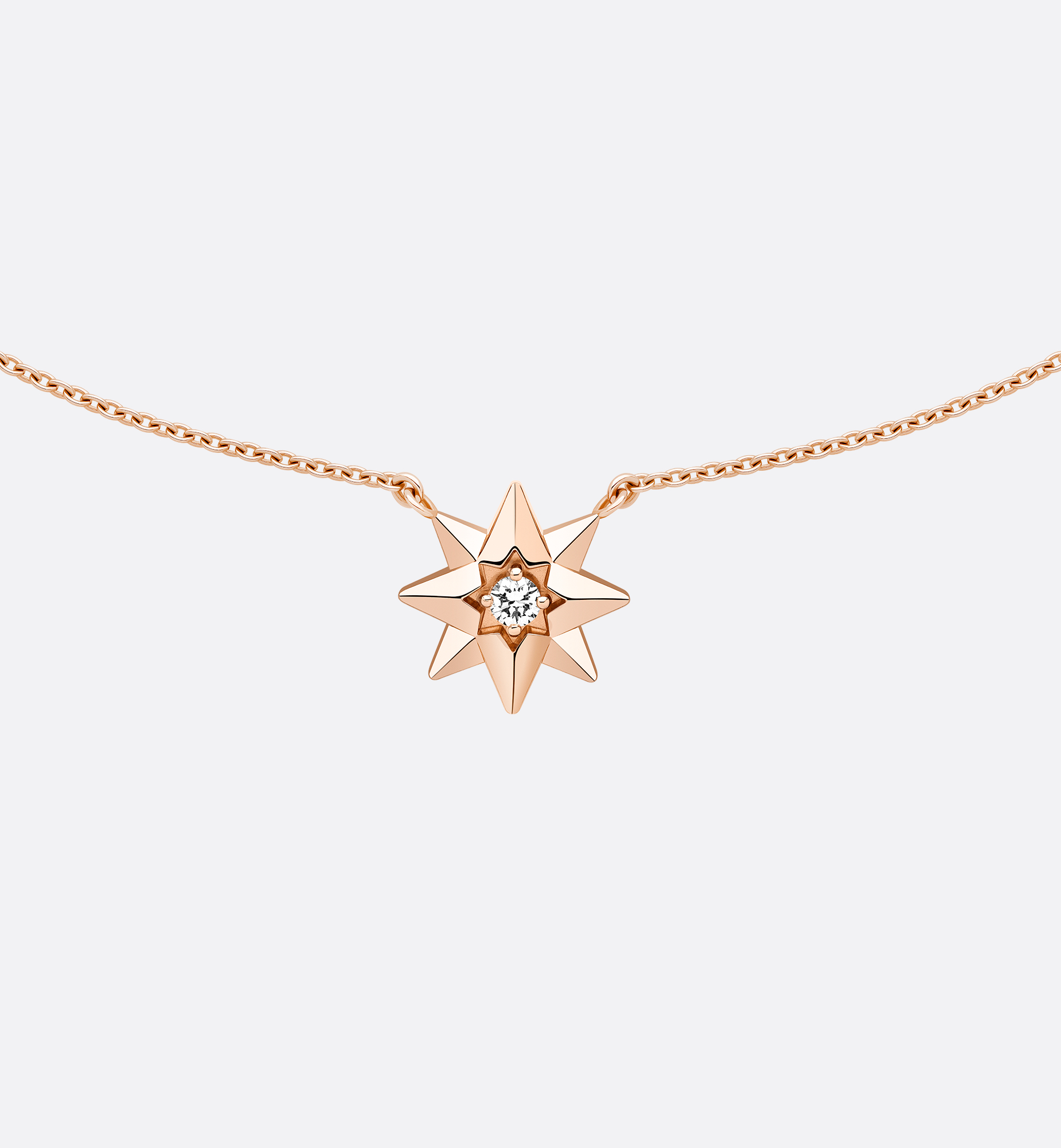 Étoile des Vents opens a refined new chapter for the collection with a reinterpretation of the iconic Rose des Vents motif without its gemstones and incorporating Mr. Dior’s symbolic lucky wind rose star. Made in pink gold set with a precious diamond, the Étoile des Vents necklace offers contemporary appeal by virtue of its refined design. It pairs ideally with other necklaces from the Rose des Vents collection. 18K pink gold. Diamond (0.04 ct*). Motif size: S