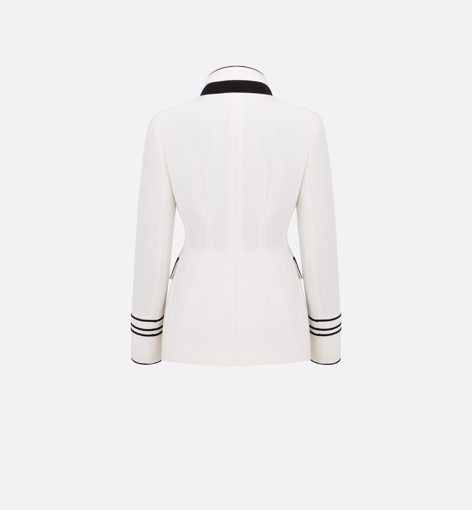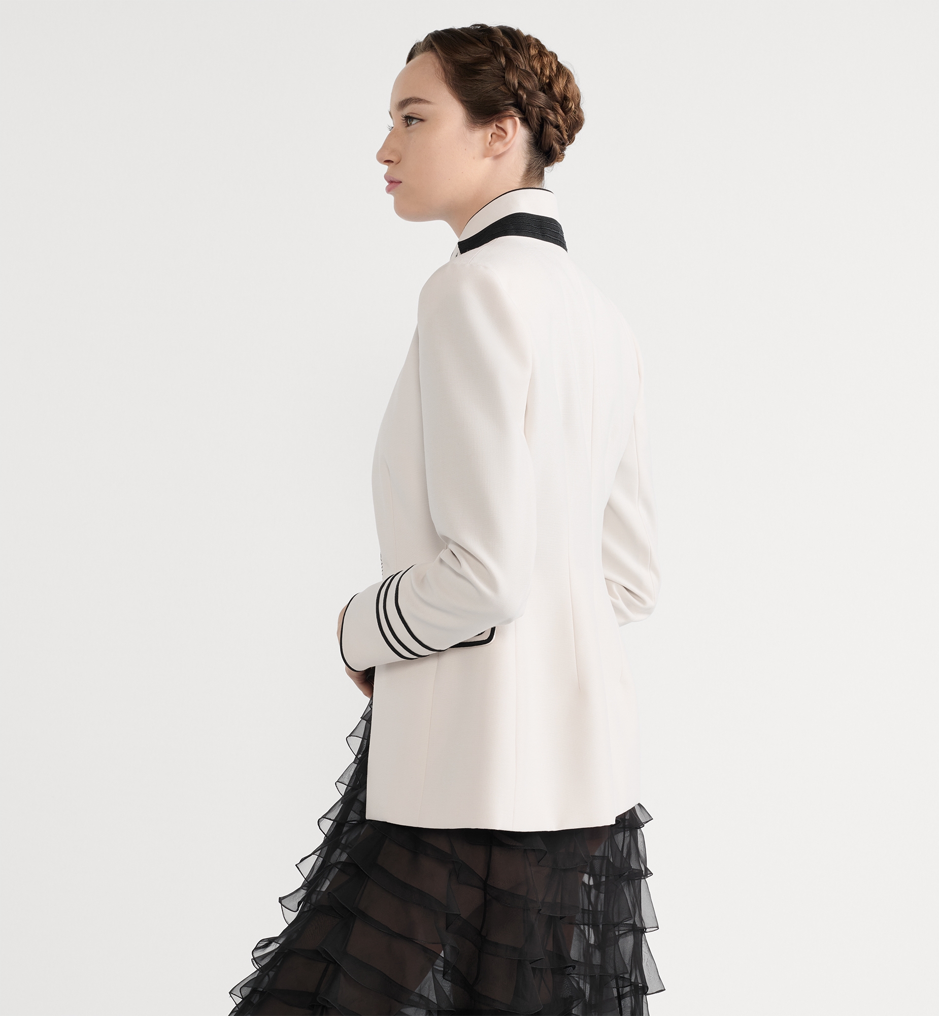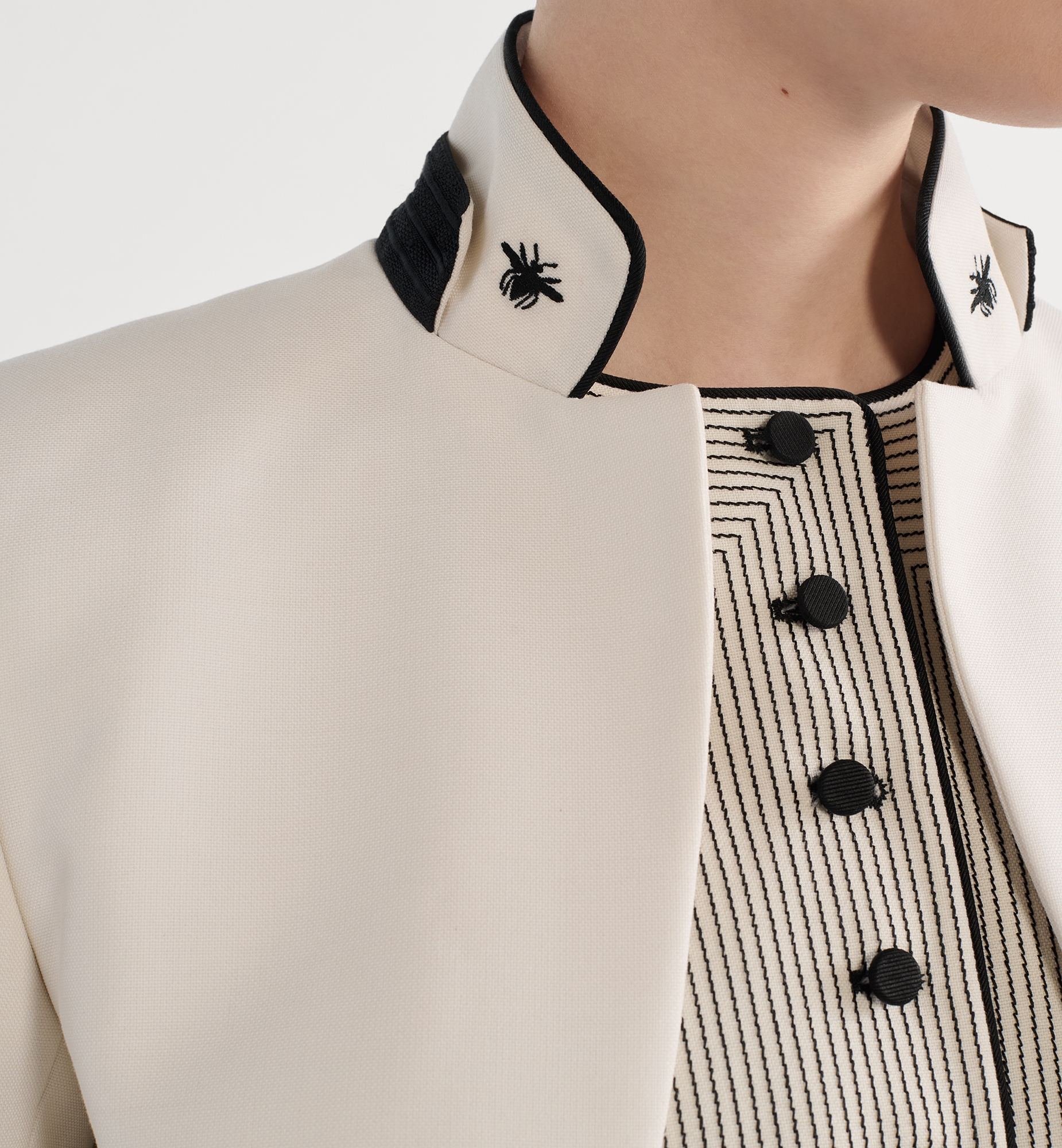 The jacket is reimagined through the House’s couture lens. Crafted in lightweight ecru wool and mohair, it features a fitted, open silhouette. Demonstrating the House’s exceptional savoir-faire, the officer collar is adorned with two embroidered hallmark bees, while black passementerie adds a delicate contrast to the cuffs as well as the patch pockets highlighting the waist. The jacket is layered over a removable striped vest with a button closure. The jacket can be paired with a diaphanous skirt for a quintessential Dior look. Embroidered hallmark bees on the collar. Vest with front button closure. Black passementerie detail. Black lining. 70% wool, 30% mohair and lining: 100% silk. Made in France