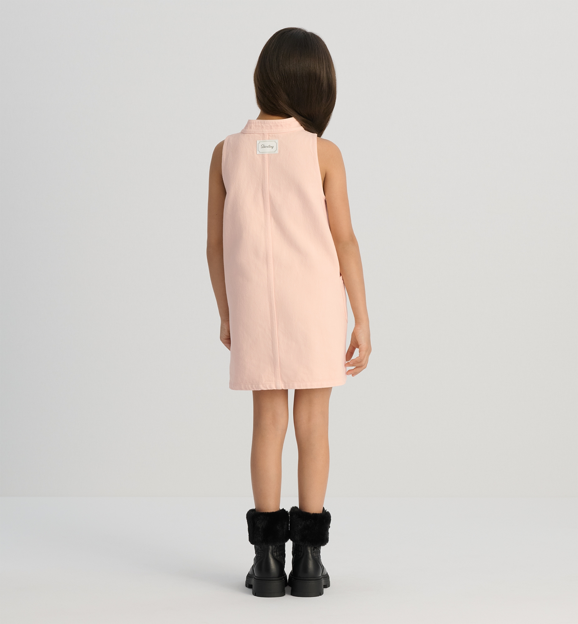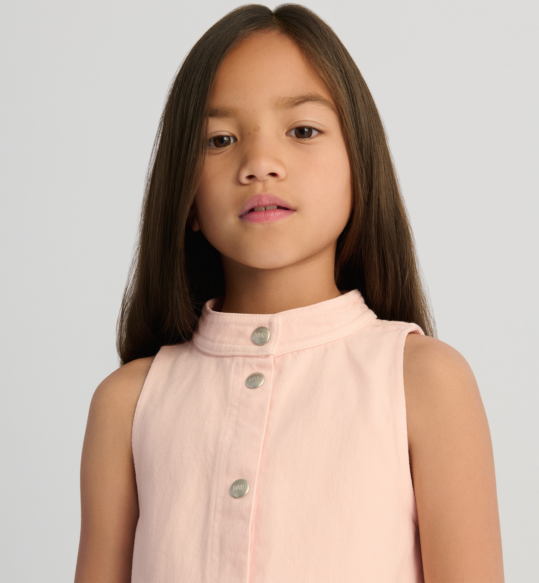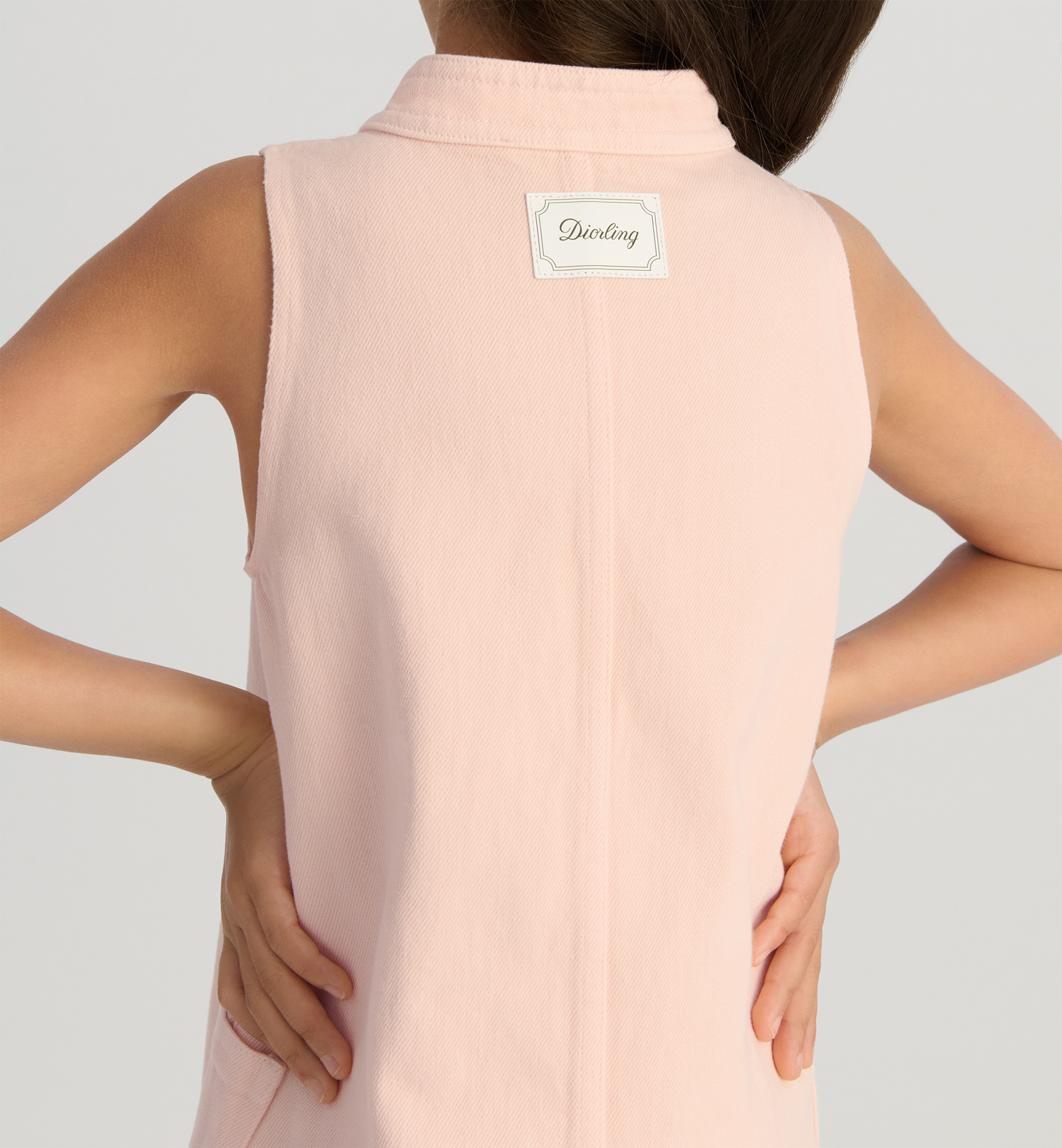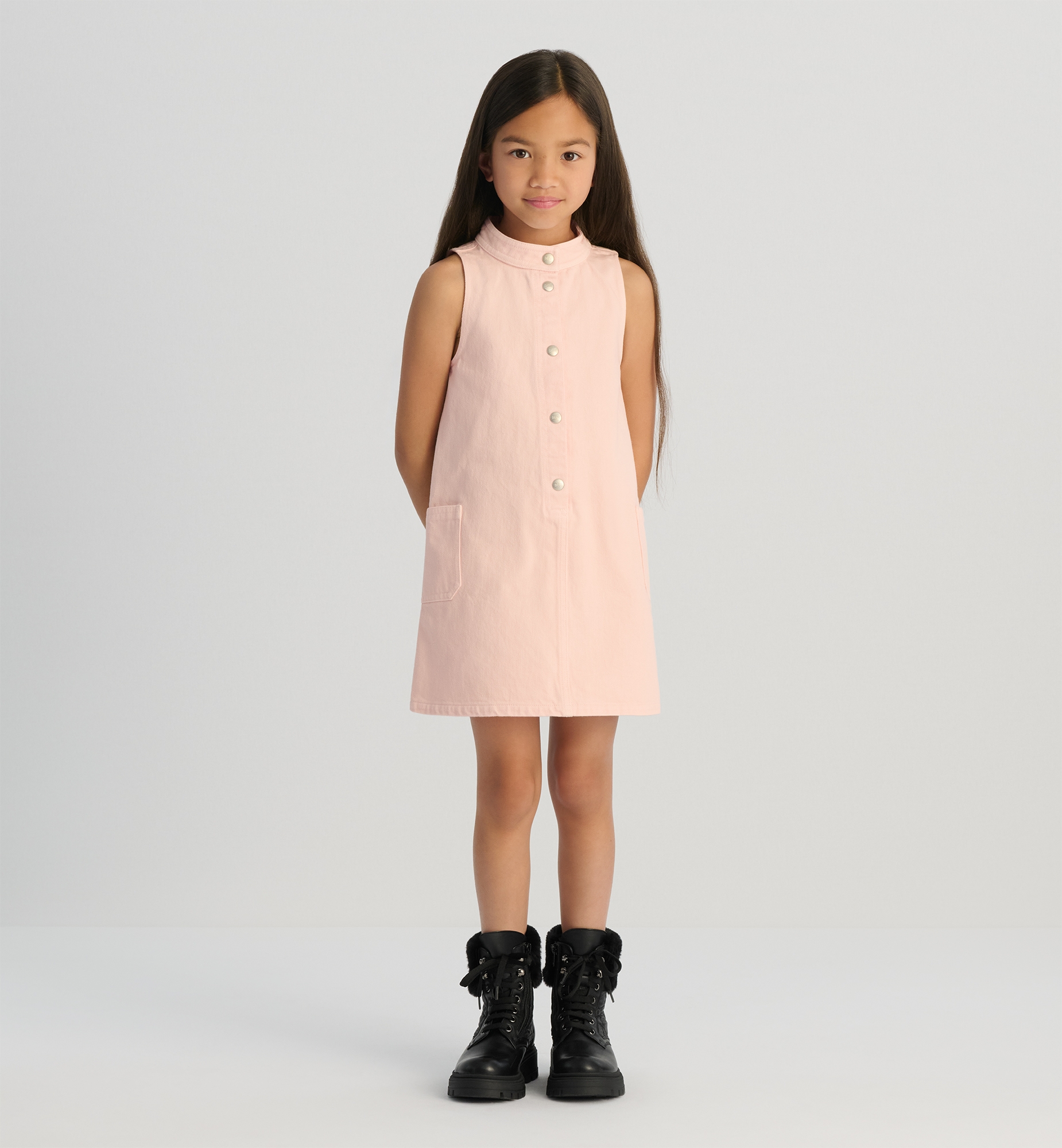 New for Winter 2025, the dress showcases a streamlined and dynamic silhouette. Crafted in pale pink stonewashed cotton gabardine, it features an officer collar for an original touch. Enhanced by patch pockets and metal snaps on the front, it is embellished with an archive-inspired ivory Diorling leather patch on the back. Worn separately or over the striped shirt from the collection, the dress will complete a chic look. Archive-inspired ivory Diorling leather patch on the back. Front placket with Dior-engraved metal snaps. Officer collar. Two front patch pockets. Composition: 100% cotton. Unlined. Sleeveless