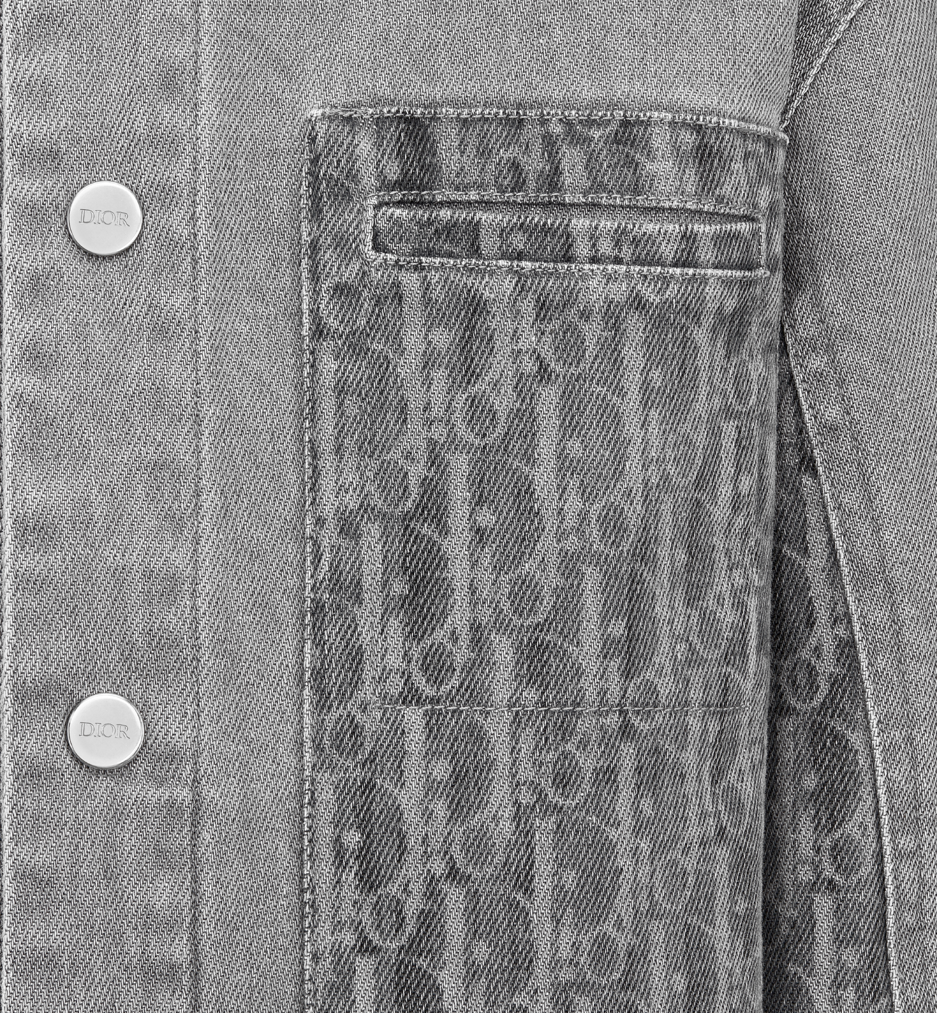 The jacket revisits a classic from the Dior Men wardrobe. Crafted in gray cotton denim, it is enhanced by tonal Dior Oblique panels with a stonewashed effect on the front patch pockets, back and under the sleeves. Finished with a spread collar and snaps on the front, the jacket can be worn with pants from the collection to complete the look. Placket with Dior-engraved metal snaps. Spread collar. Chest patch pockets with gray stonewashed Dior Oblique panels. Main composition: 98% cotton, 2% elastane. Secondary composition: 98% cotton, 2% elastane. Unlined