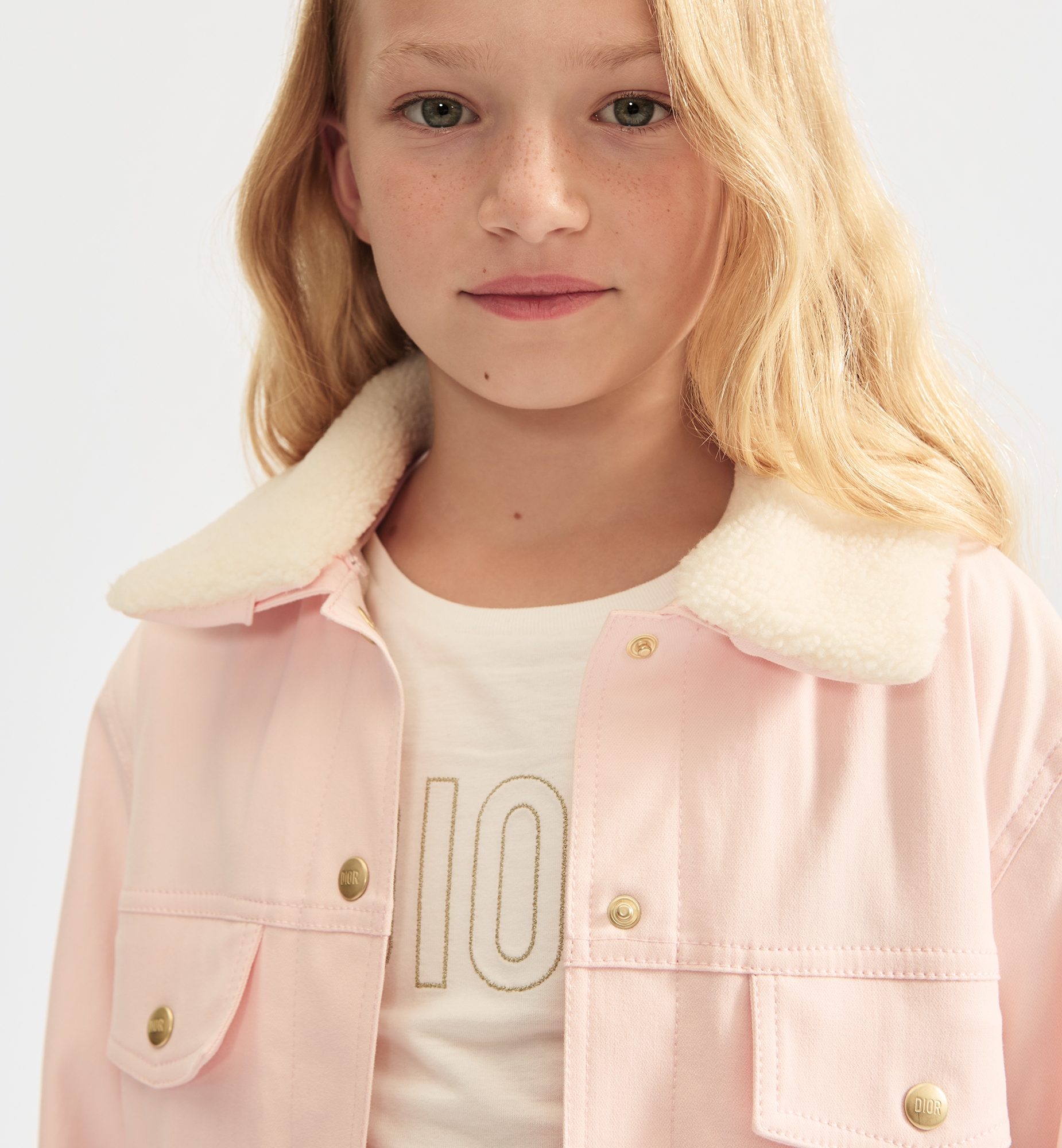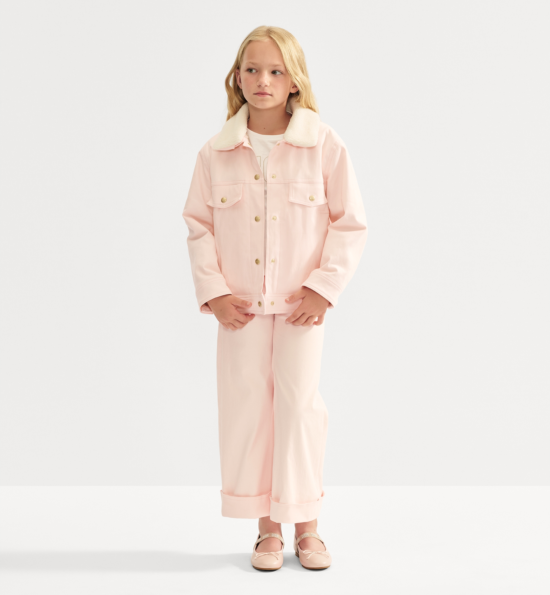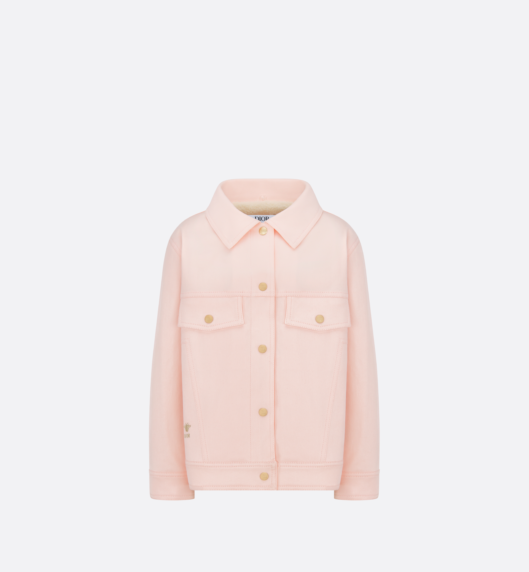 This season, the timeless jacket is adapted for a cooler weather. Crafted in pale pink cotton gabardine, it is distinguished by warm lining and an ivory bouclé removable collar. Fastened with pale gold-finish metal snaps, it has two slanted pockets, as well as two flap pockets on the front. Accented by a gold-tone Dior bee embroidery on the waist, the jacket can be paired with the matching pants or dress from the collection to complete the look. Dior bee embroidery in gold-tone metallic thread on the right waist. Front placket with Dior-engraved pale gold-finish metal snaps. Spread collar with removable ivory bouclé panel. Two front flap pockets. Slanted pockets. Main composition: 97% cotton, 3% elastane. Ivory bouclé collar and body lining composition: 70% polyester, 30% acrylic. Tonal sleeve lining composition: 100% cotton. Trim composition: 100% polyester